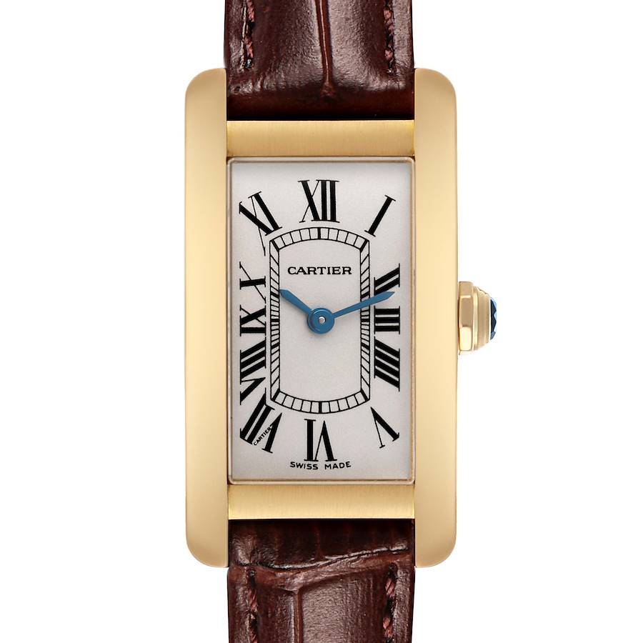 Cartier Tank Americaine Yellow Gold Burgundy Strap Ladies Watch W2601556. Quartz movement. 18K yellow gold case 19.0 x 35.0 mm. Circular grained crown set with faceted blue spinel cabochon. . Scratch resistant sapphire crystal. Silvered grained dial with black roman numerals. Brown leather strap with 18K yellow gold tang buckle.