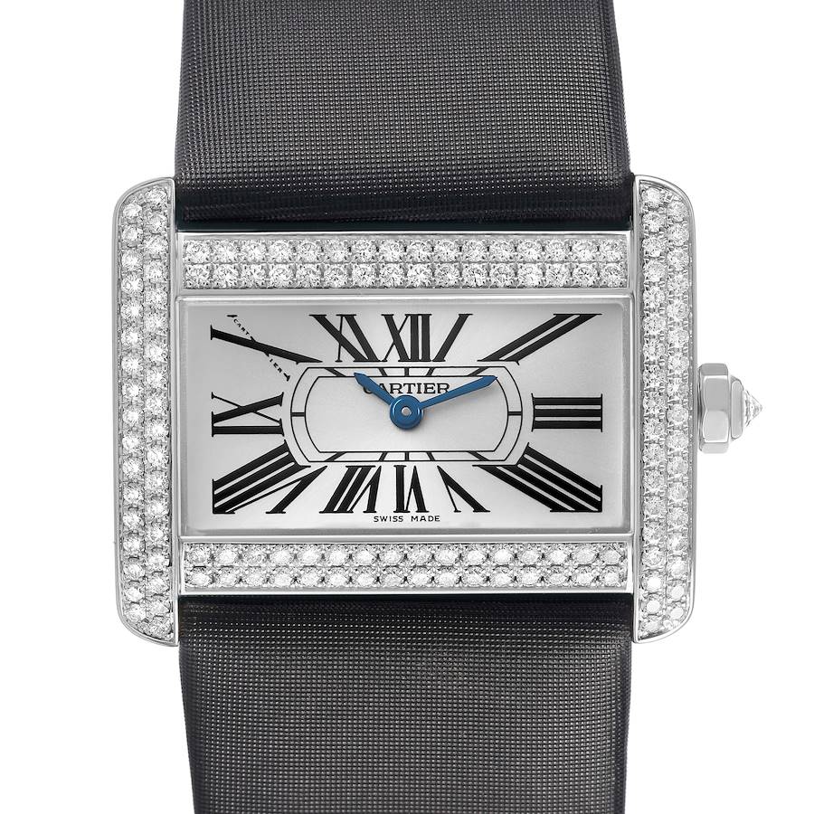 Cartier Tank Divan Large 18K Yellow Gold Diamond Watch WA301170?. Quartz movement. 18K white gold case 32mm x 28mm. Circular grained crown set with the faceted sapphire. Original Cartier factory diamond bezel. Scratch resistant sapphire crystal. Silver dial with black roman numerals. Sword shaped blue hands. Secret Cartier signature at X. Black satin strap with 18K white gold diamond tang buckle.