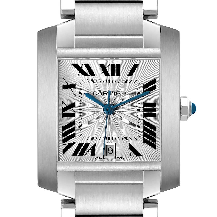 Cartier Tank Francaise Large Steel Silver Dial Mens Watch W51002Q3. Automatic self-winding movement. Rectangular stainless steel case 28.0 x 32.0 mm. Octagonal crown set with a blue spinel cabochon. . Scratch resistant sapphire crystal. Silver guilloche dial with black radial Roman numeral hour markers and an inner minute track. Blued steel sword-shaped hands. Date calendar at the 6 o'clock aperture. Secret Cartier signature at VII. Stainless steel bracelet with a hidden double deployant clasp. Fits a 7 1/2" wrist.