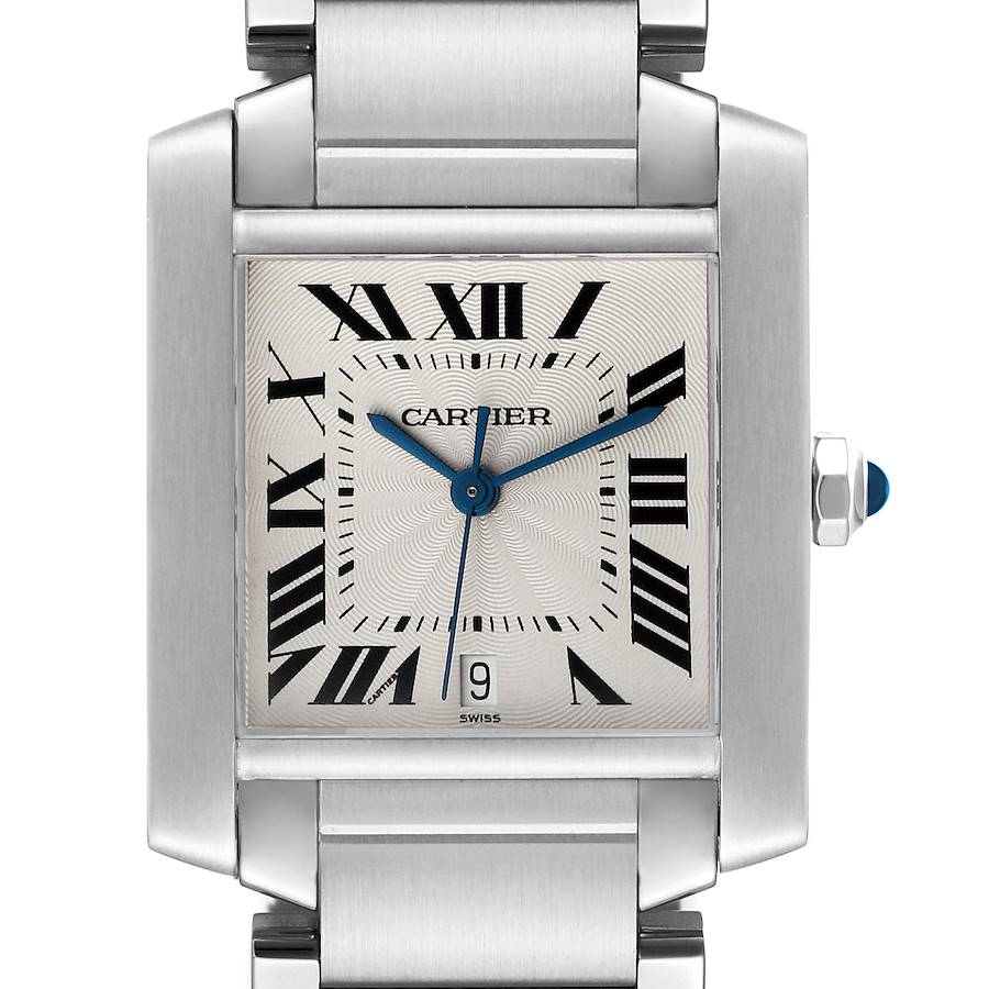 Cartier Tank Francaise Large Steel Silver Dial Mens Watch W51002Q3. Automatic self-winding movement. Rectangular stainless steel case 28.0 x 32.0 mm. Octagonal crown set with a blue spinel cabochon. . Scratch resistant sapphire crystal. Silver guilloche dial with black radial Roman numeral hour markers and an inner minute track. Blued steel sword-shaped hands. Date calendar at the 6 o'clock aperture. Secret Cartier signature at VII. Stainless steel bracelet with a hidden double deployant clasp. Fits a 7 1/4" wrist.
