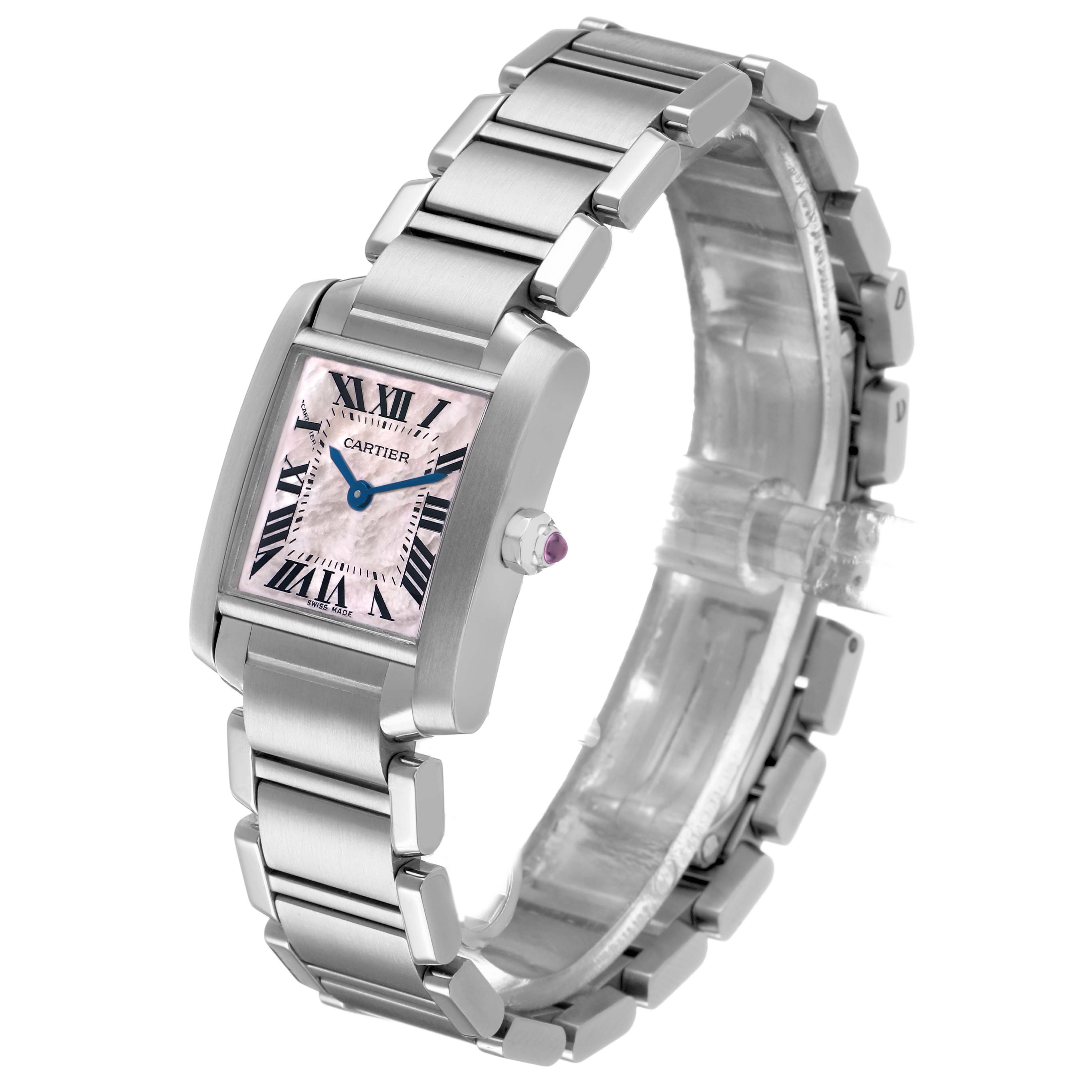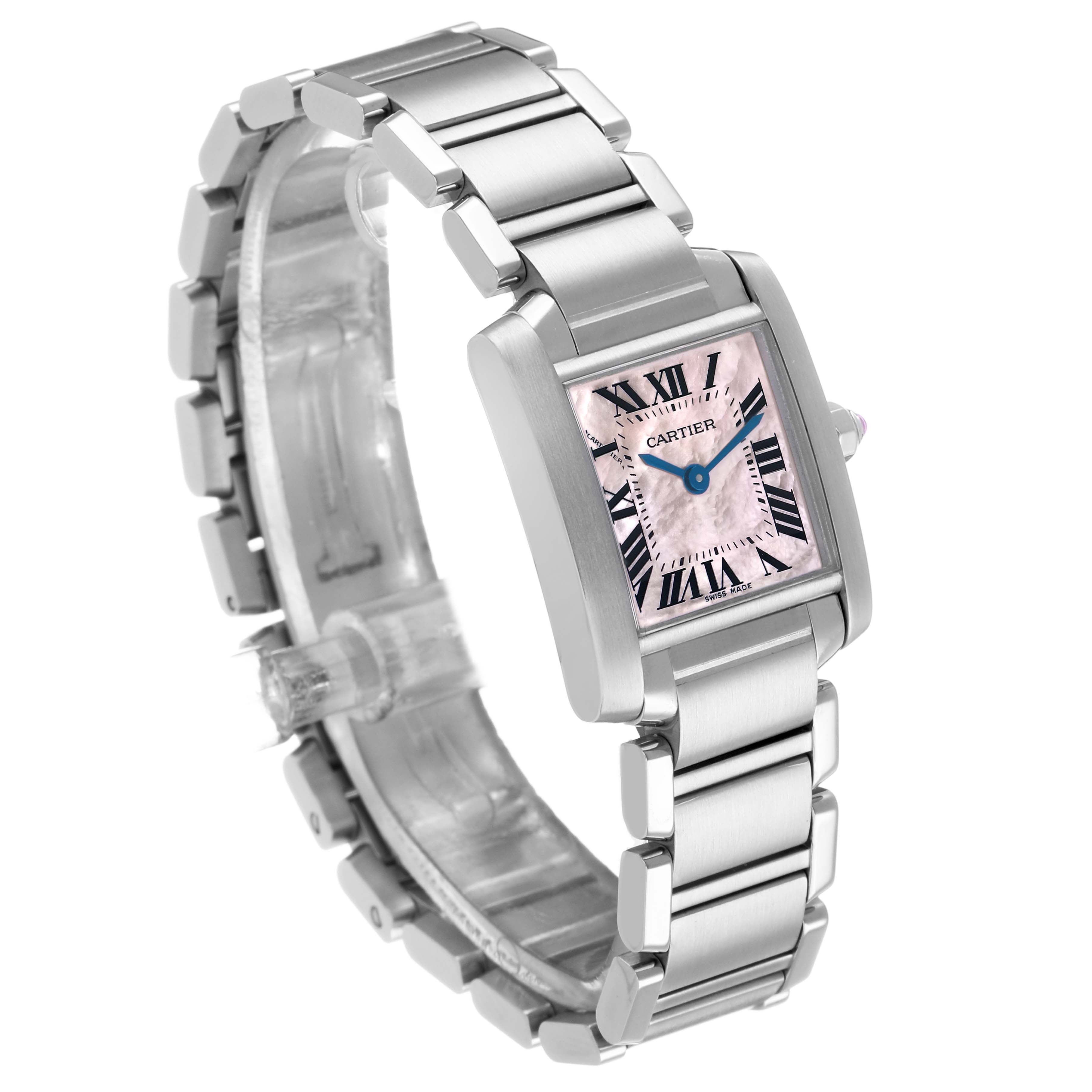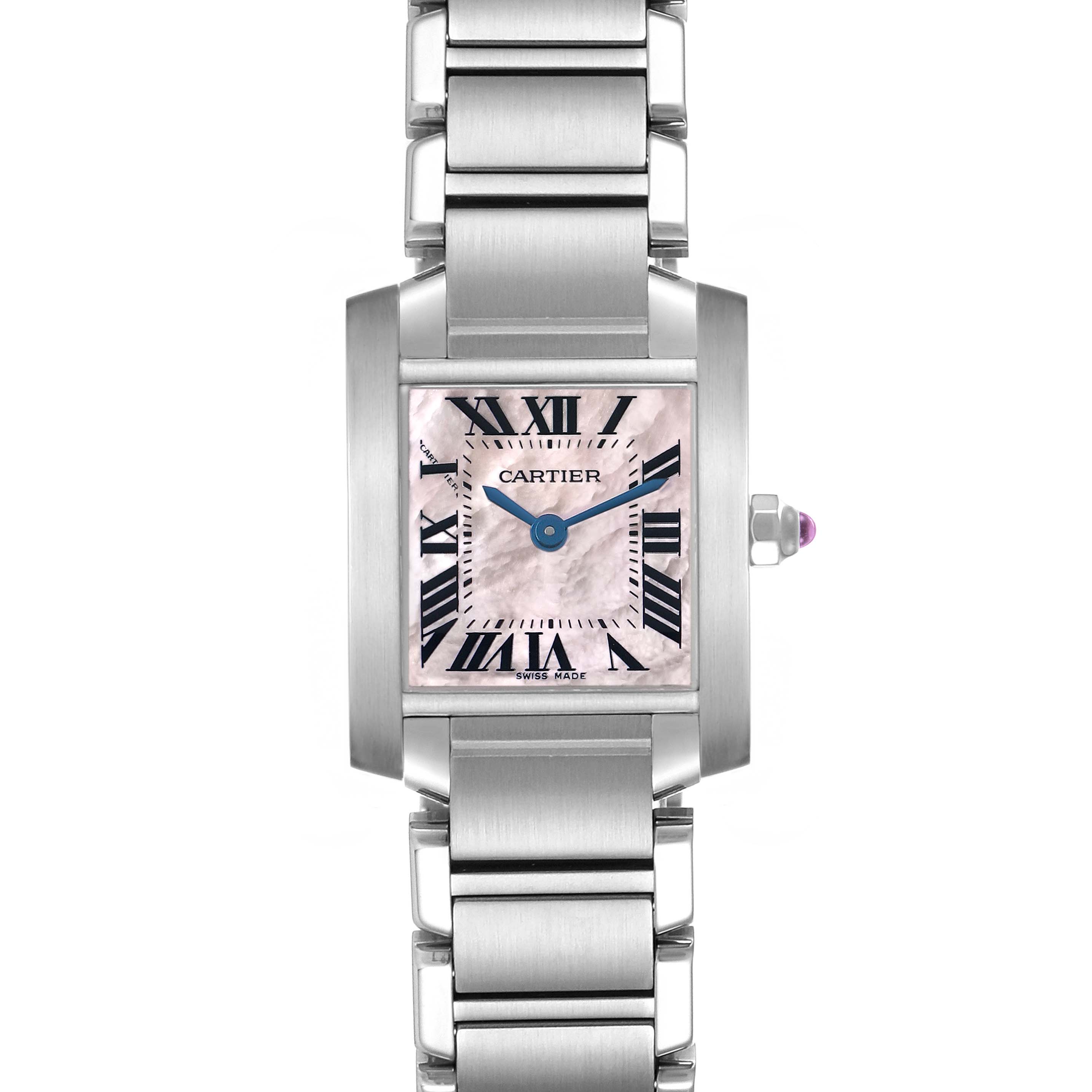 Cartier Tank Francaise Small Steel Mother of Pearl Ladies Watch W51028Q3. Quartz movement. Rectangular stainless steel case 20.0 x 25.0 mm. Octagonal crown set with a pink spinel cabochon. . Scratch resistant sapphire crystal. Pink mother of pearl dial with radial black Roman numeral hour markers and an inner minute track. Sword shaped blued-steel hands. Secret Cartier signature at X. Stainless steel bracelet with a hidden double deployant clasp. Fits a 6.5" wrist.
