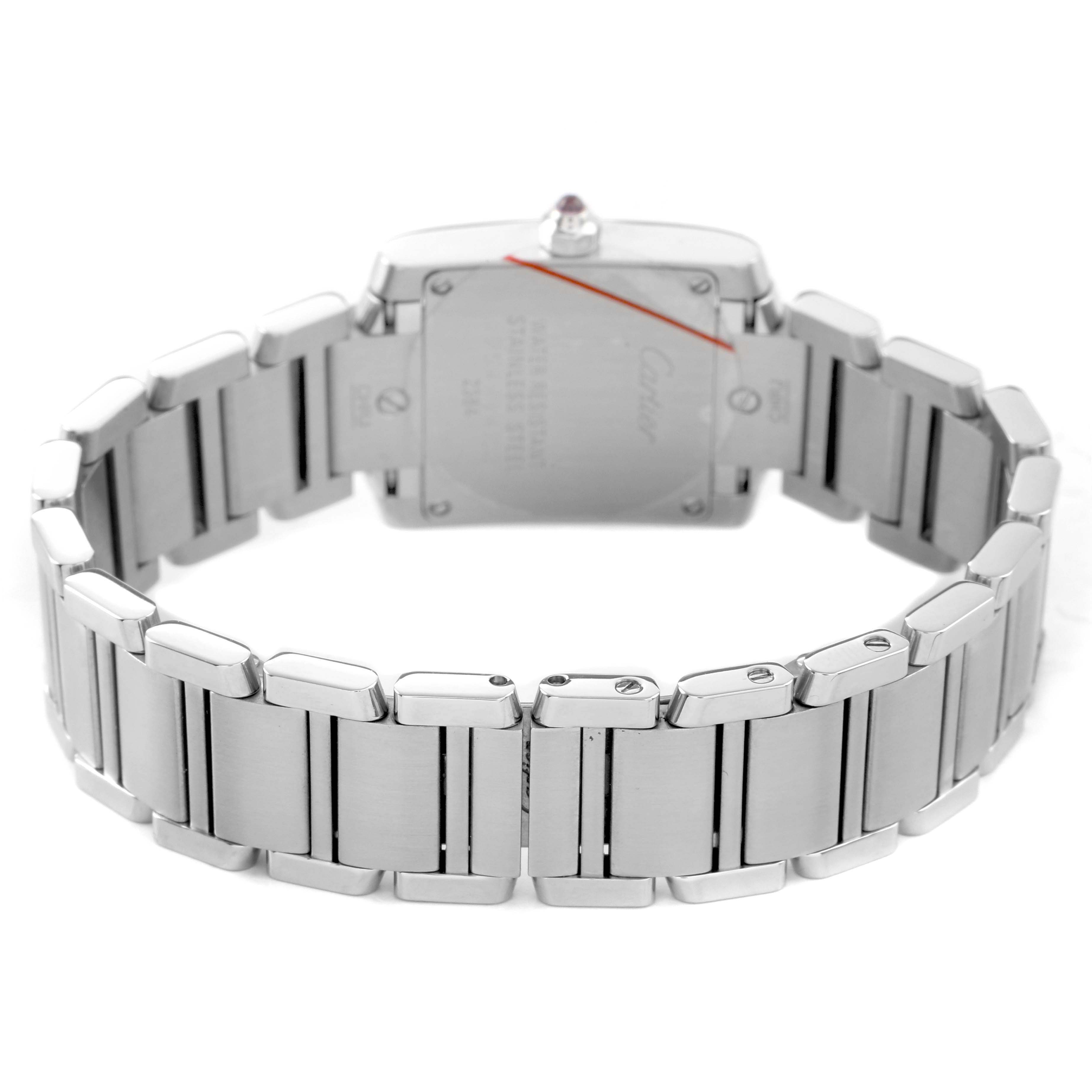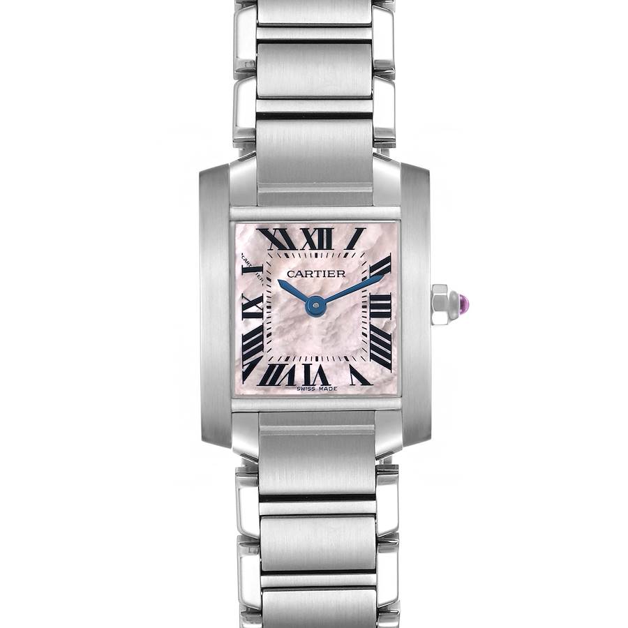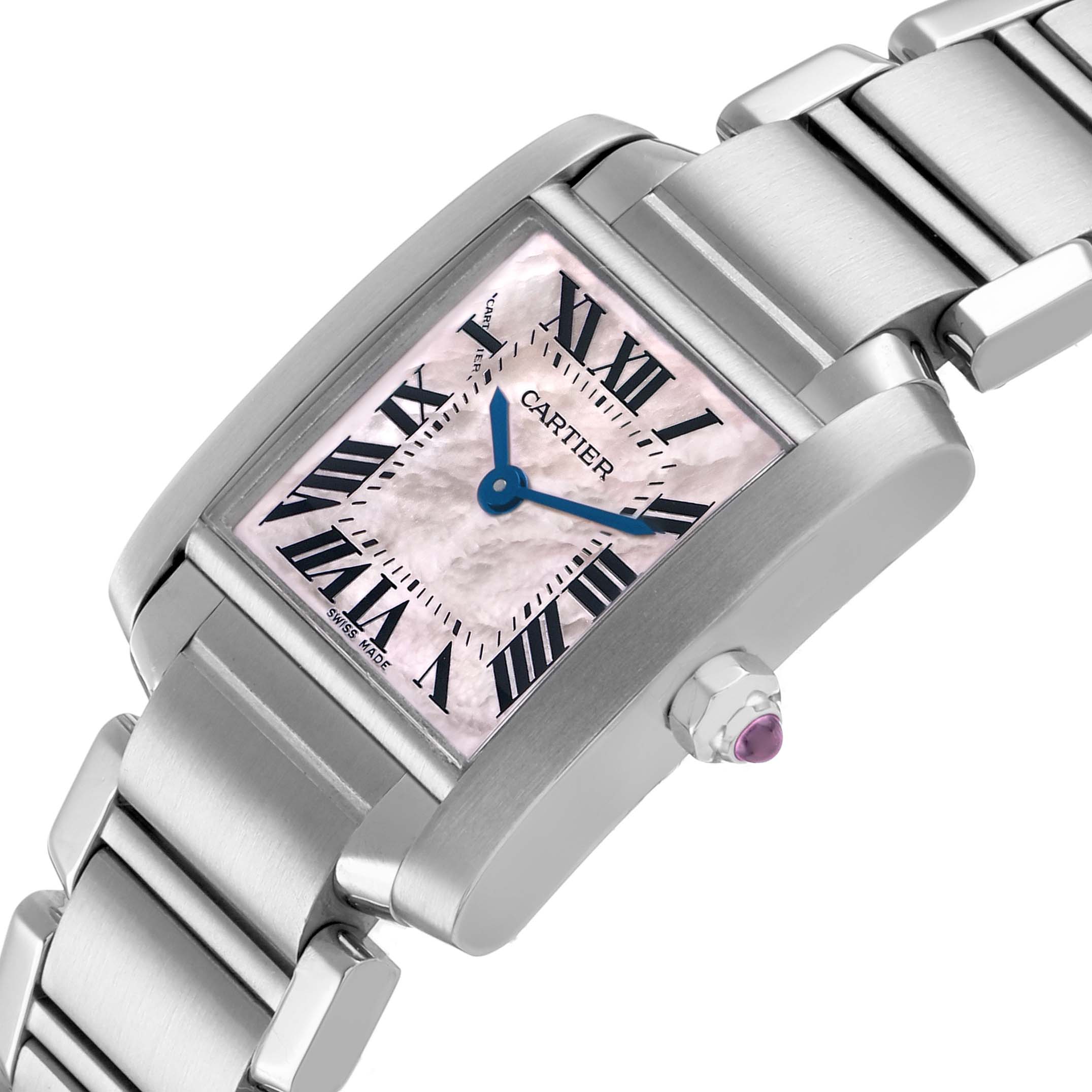 Cartier Tank Francaise Small Steel Mother of Pearl Ladies Watch W51028Q3. Quartz movement. Rectangular stainless steel case 20.0 x 25.0 mm. Octagonal crown set with a pink spinel cabochon. . Scratch resistant sapphire crystal. Pink mother of pearl dial with radial black Roman numeral hour markers and an inner minute track. Sword shaped blued-steel hands. Secret Cartier signature at X. Stainless steel bracelet with a hidden double deployant clasp. Fits a 6.5" wrist.