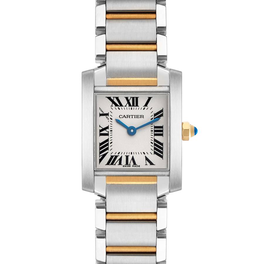 Cartier Tank Francaise Small Steel Yellow Gold Ladies Watch W51007Q4. Quartz movement. Rectangular stainless steel case 25.0 x 20.0 mm. Octagonal 18k yellow gold crown set with a blue spinel cabochon. . Scratch resistant sapphire crystal. Silver opaline dial with black painted radial Roman numeral hour markers and an inner minute track. Sword-shaped blued steel hands. Secret Cartier signature at X. Stainless steel and 18k yellow gold bracelet with a hidden double deployant clasp. Fits a 6 1/4" wrist.
