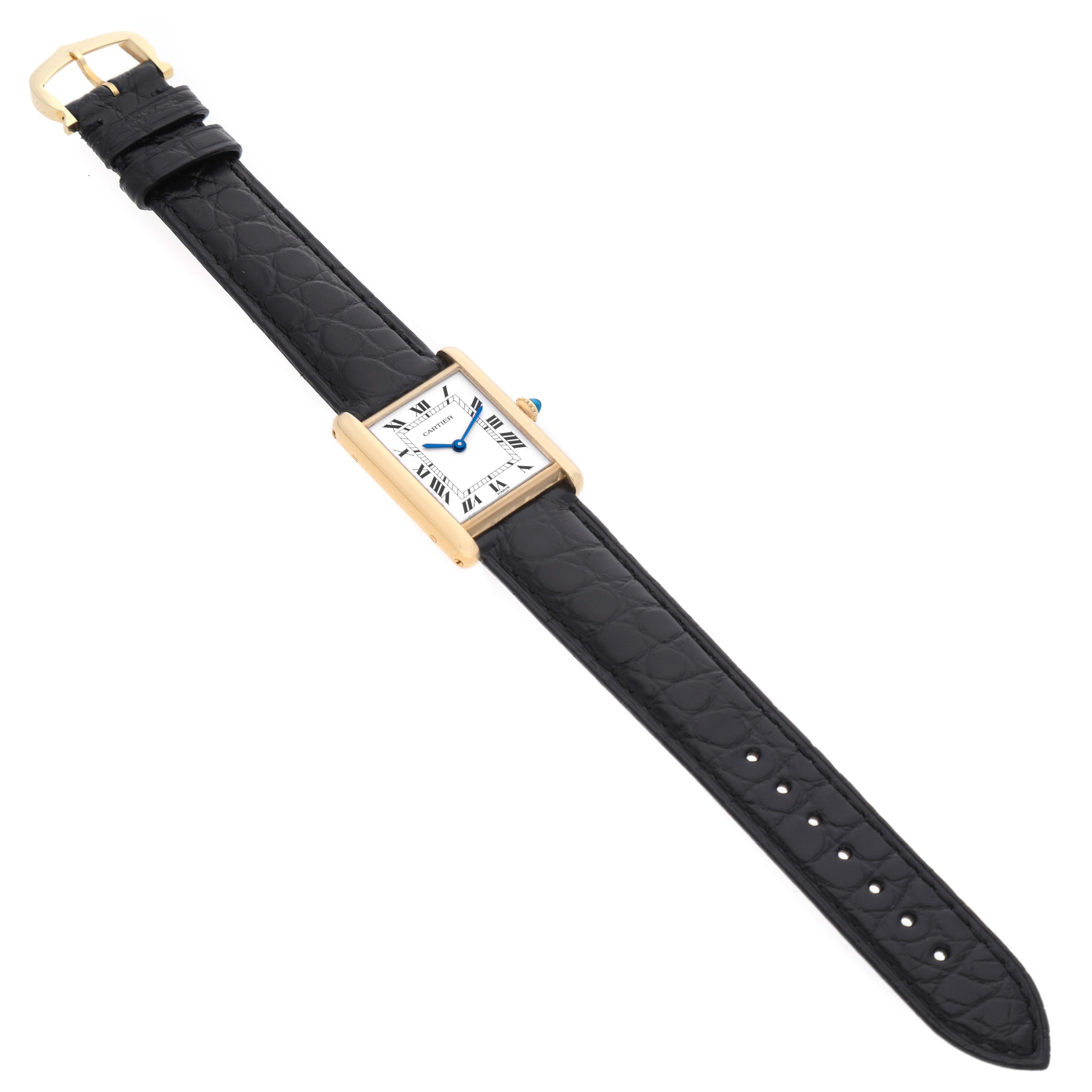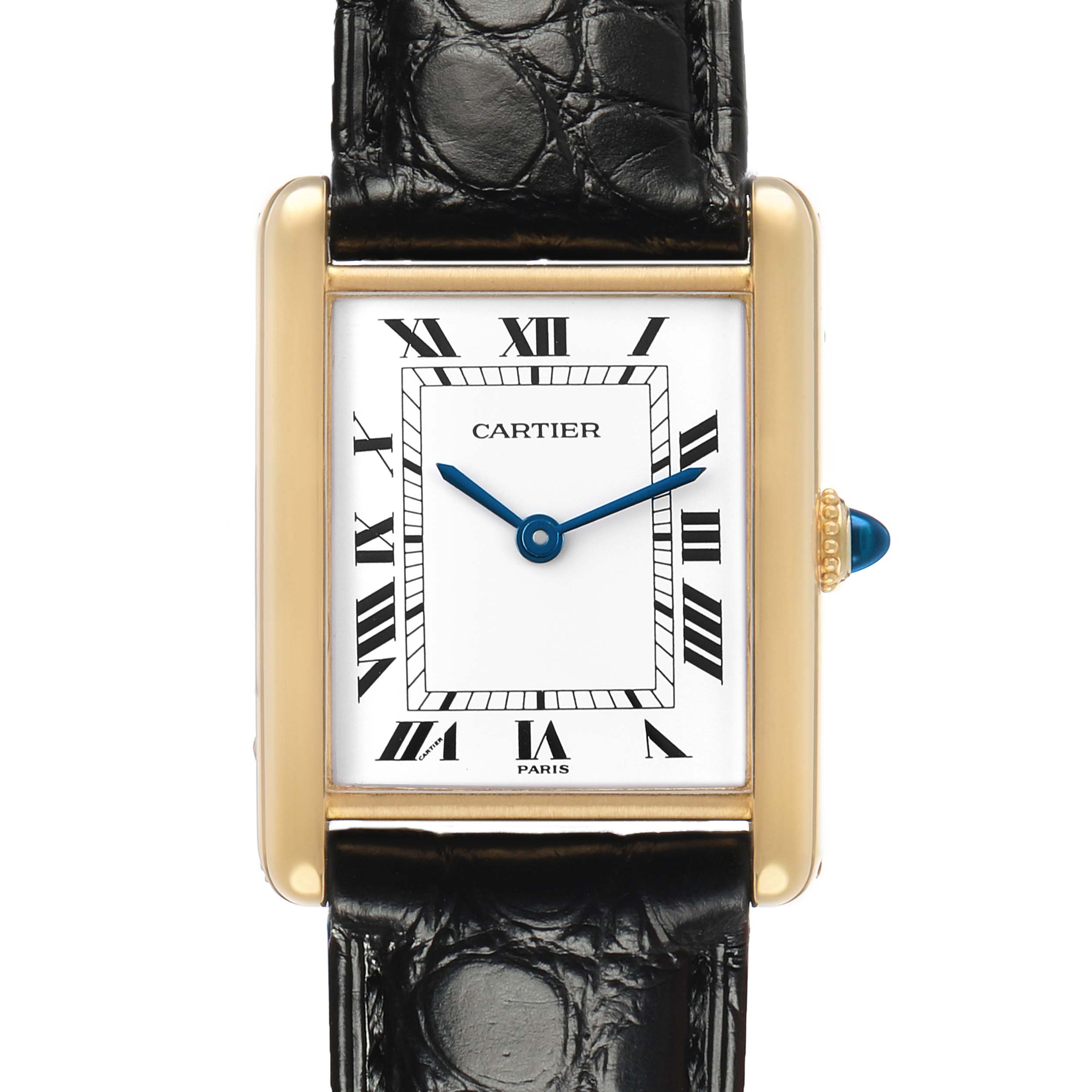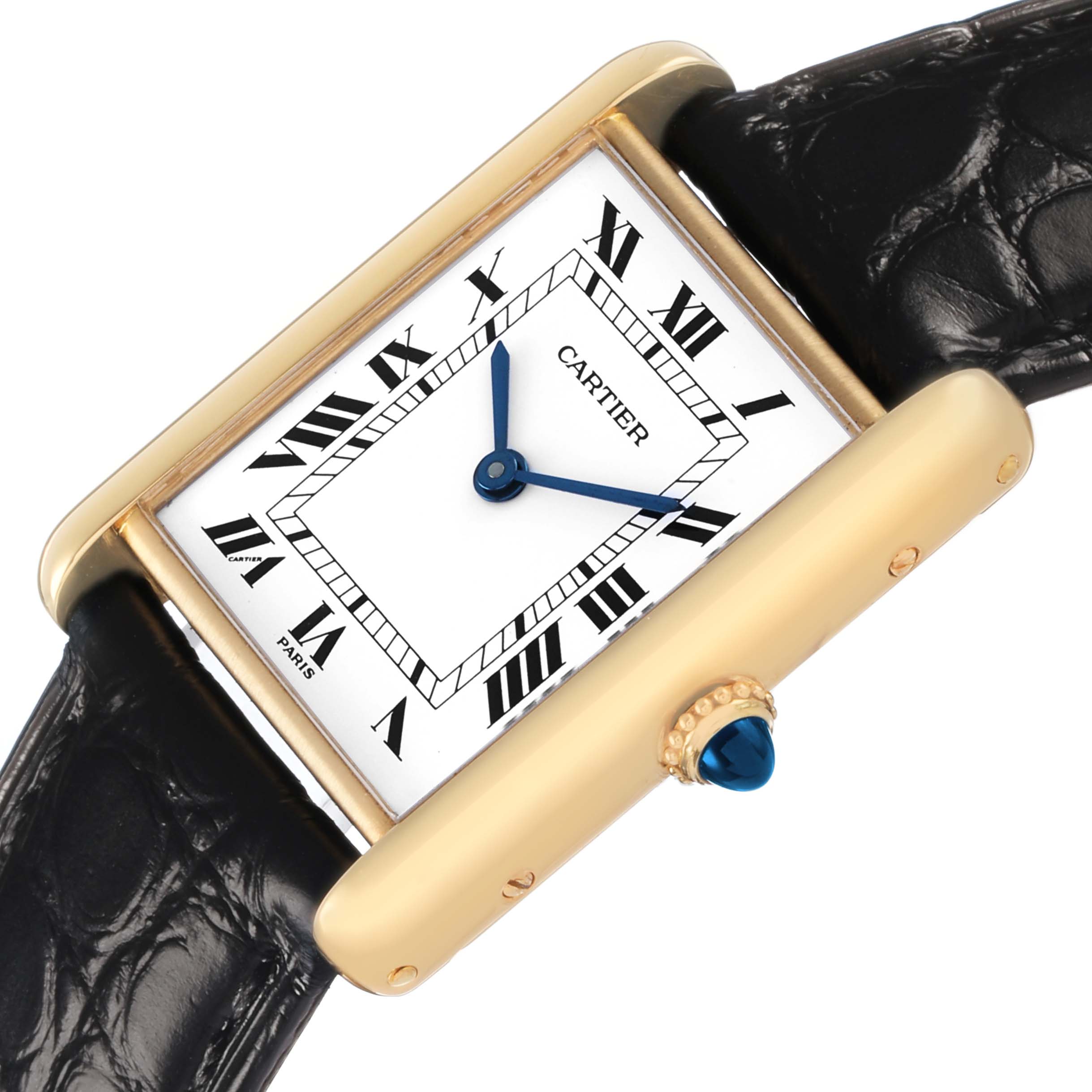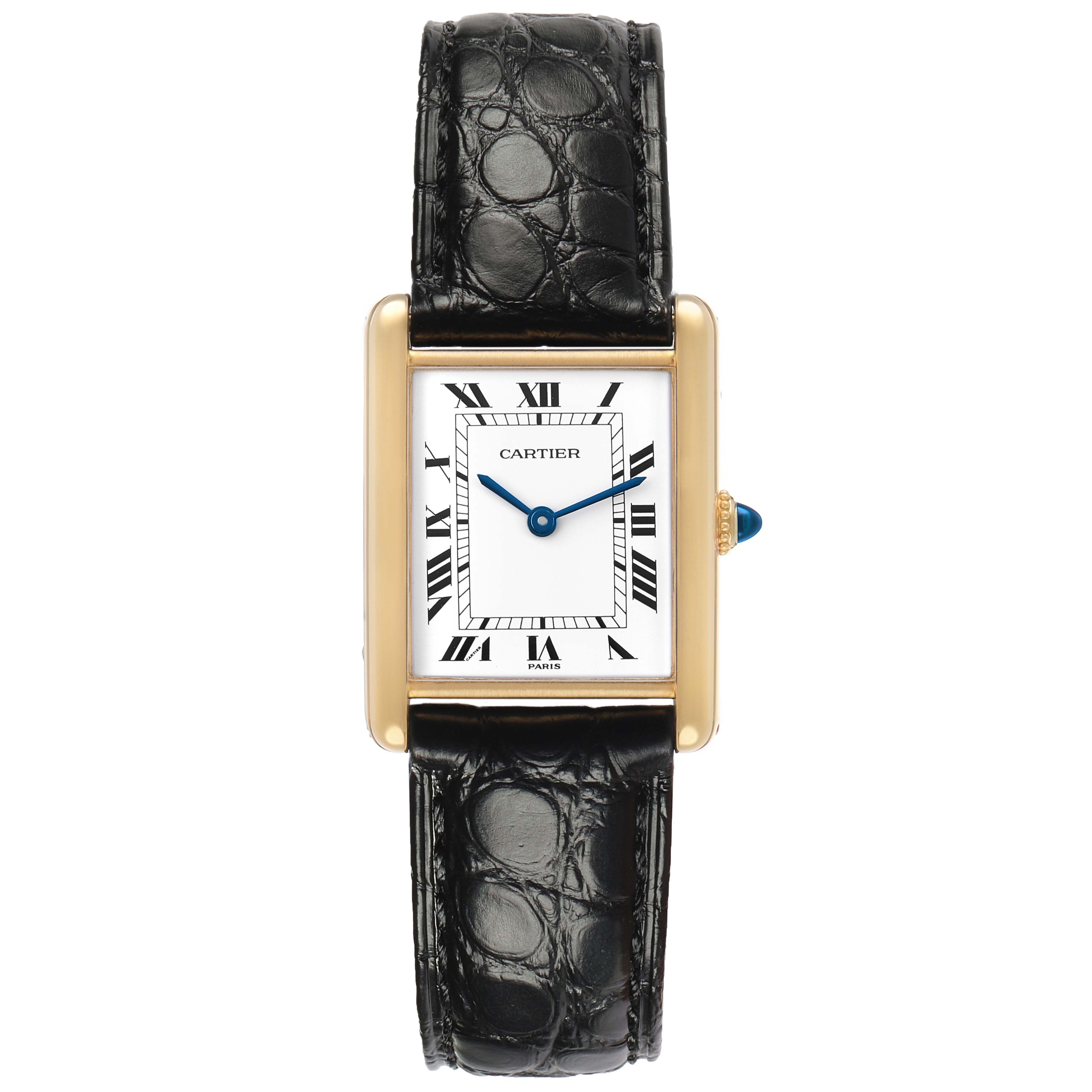 Cartier Tank Classic Paris Yellow Gold White Dial Ladies Watch. Mechanical hand-winding movement. 18k yellow gold rectangular case 30.5 x 23.5 mm. Circular grained crown set with a blue sapphire cabochon. . Scratch resistant mineral crystal. White dial with black radial Roman numeral hour markers and an inner minute track. Sword-shaped steel hands. Secret Cartier signature at X. Black leather strap with tang buckle.