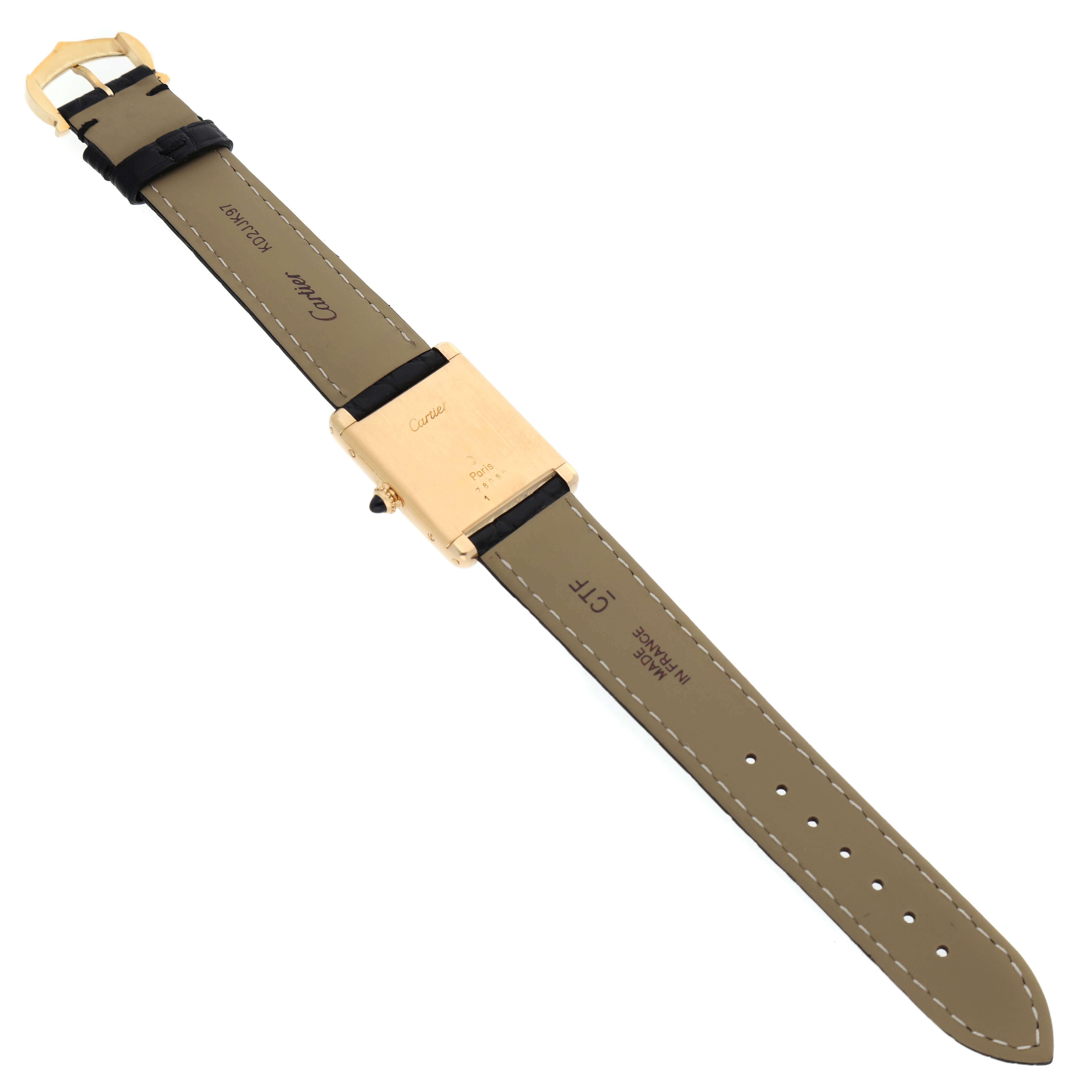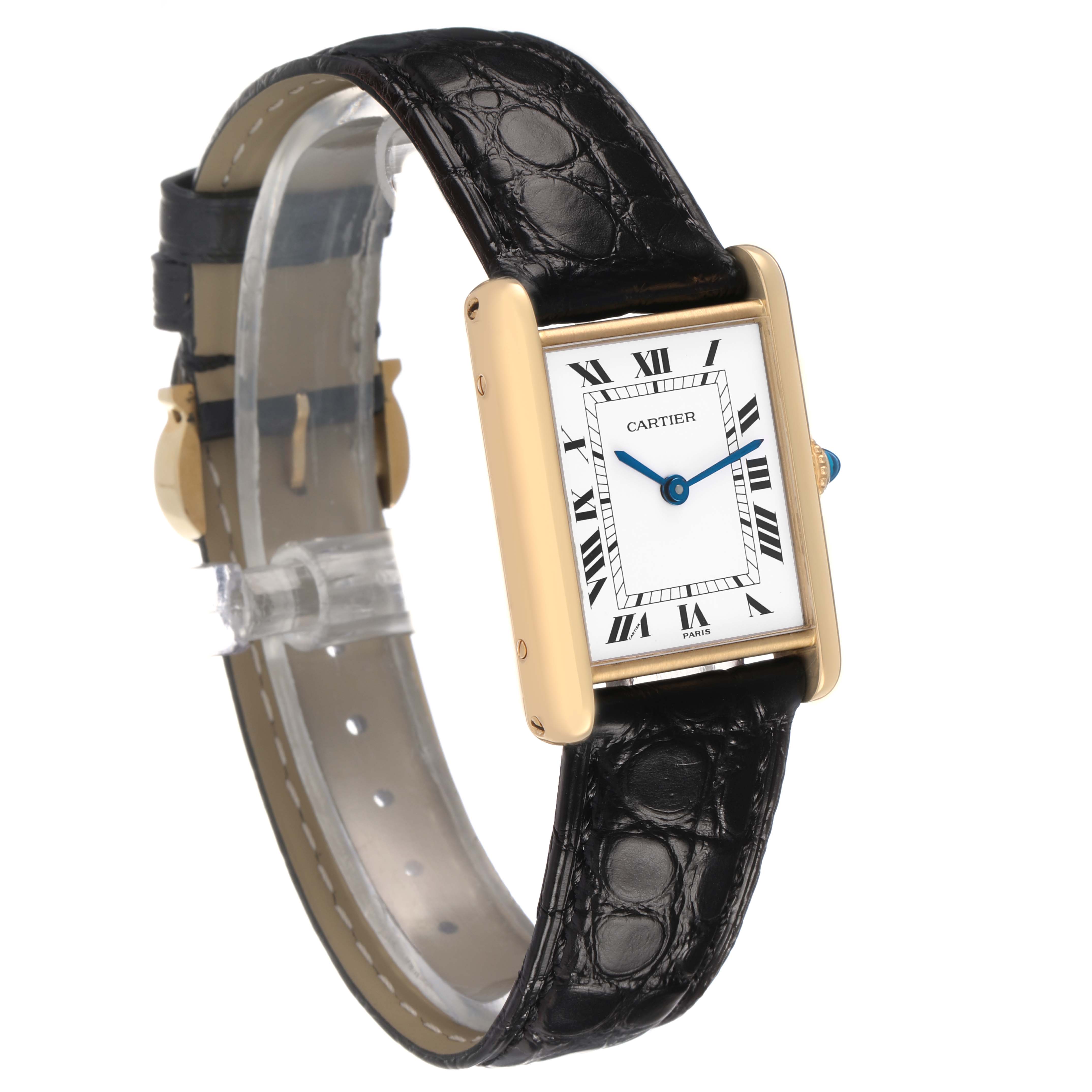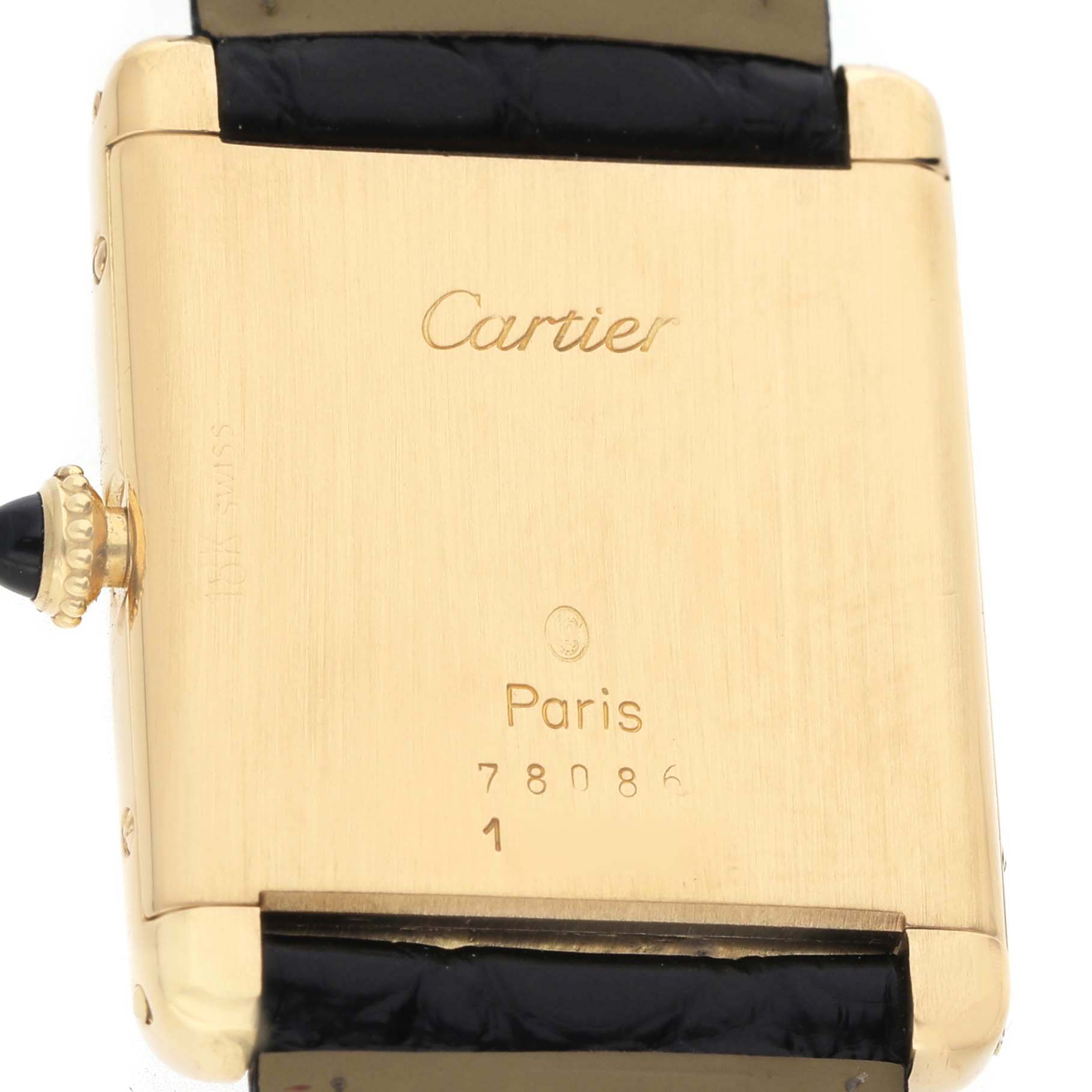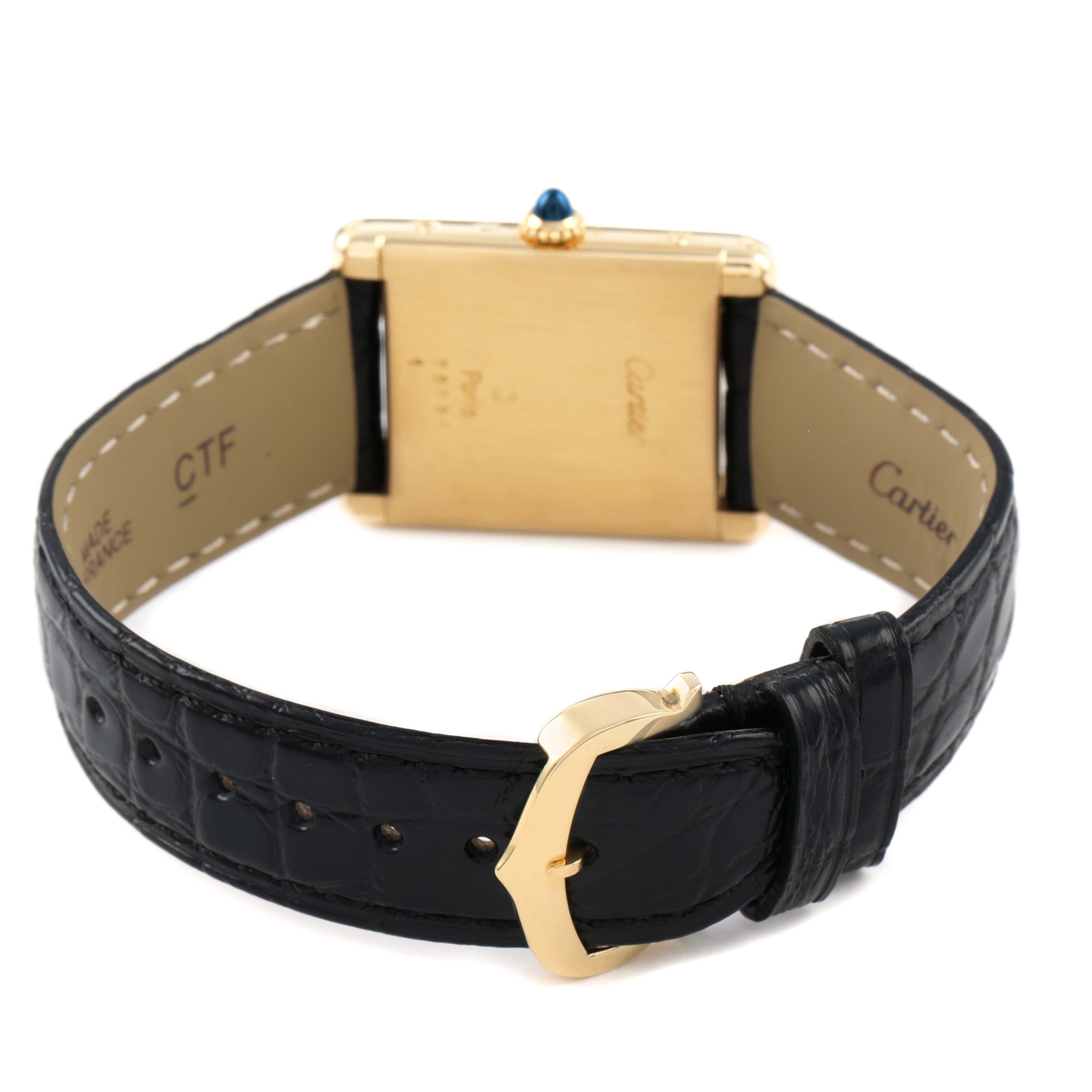 Cartier Tank Classic Paris Yellow Gold White Dial Ladies Watch. Mechanical hand-winding movement. 18k yellow gold rectangular case 30.5 x 23.5 mm. Circular grained crown set with a blue sapphire cabochon. . Scratch resistant mineral crystal. White dial with black radial Roman numeral hour markers and an inner minute track. Sword-shaped steel hands. Secret Cartier signature at X. Black leather strap with tang buckle.
