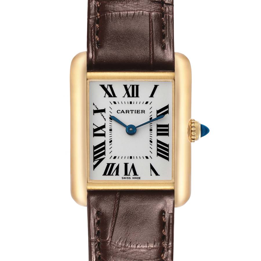 Cartier Tank Louis Small Yellow Gold Ladies Watch W1529856. Quartz movement. 18k yellow gold square case 29.5 mm x 22.0 mm. Circular grained crown set with a blue sapphire cabochon. . Scratch resistant mineral crystal. Silver grained dial with black radial Roman numeral hour markers and an inner minute track. Sword-shaped blued steel hands. Secret Cartier signature at X. Brown leather strap with an 18k yellow gold tang buckle.