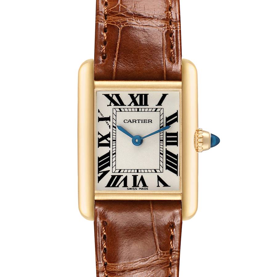 Cartier Tank Louis Small Yellow Gold Ladies Watch W1529856. Quartz movement. 18k yellow gold square case 29.5 mm x 22.0 mm. Circular grained crown set with a blue sapphire cabochon. . Scratch resistant mineral crystal. Silver grained dial with black radial Roman numeral hour markers and an inner minute track. Sword-shaped blued steel hands. Secret Cartier signature at X. Brown leather strap with an 18k yellow gold tang buckle.