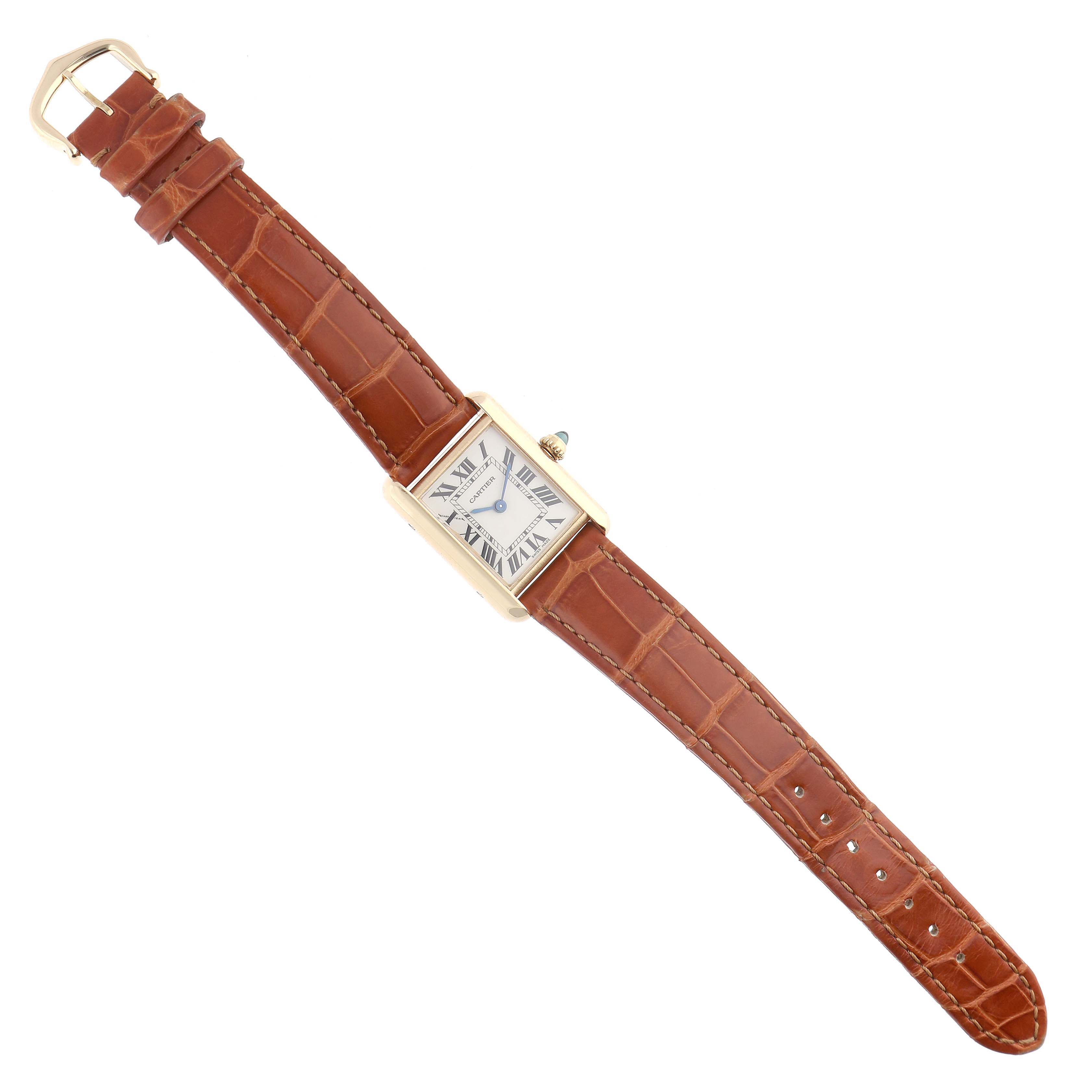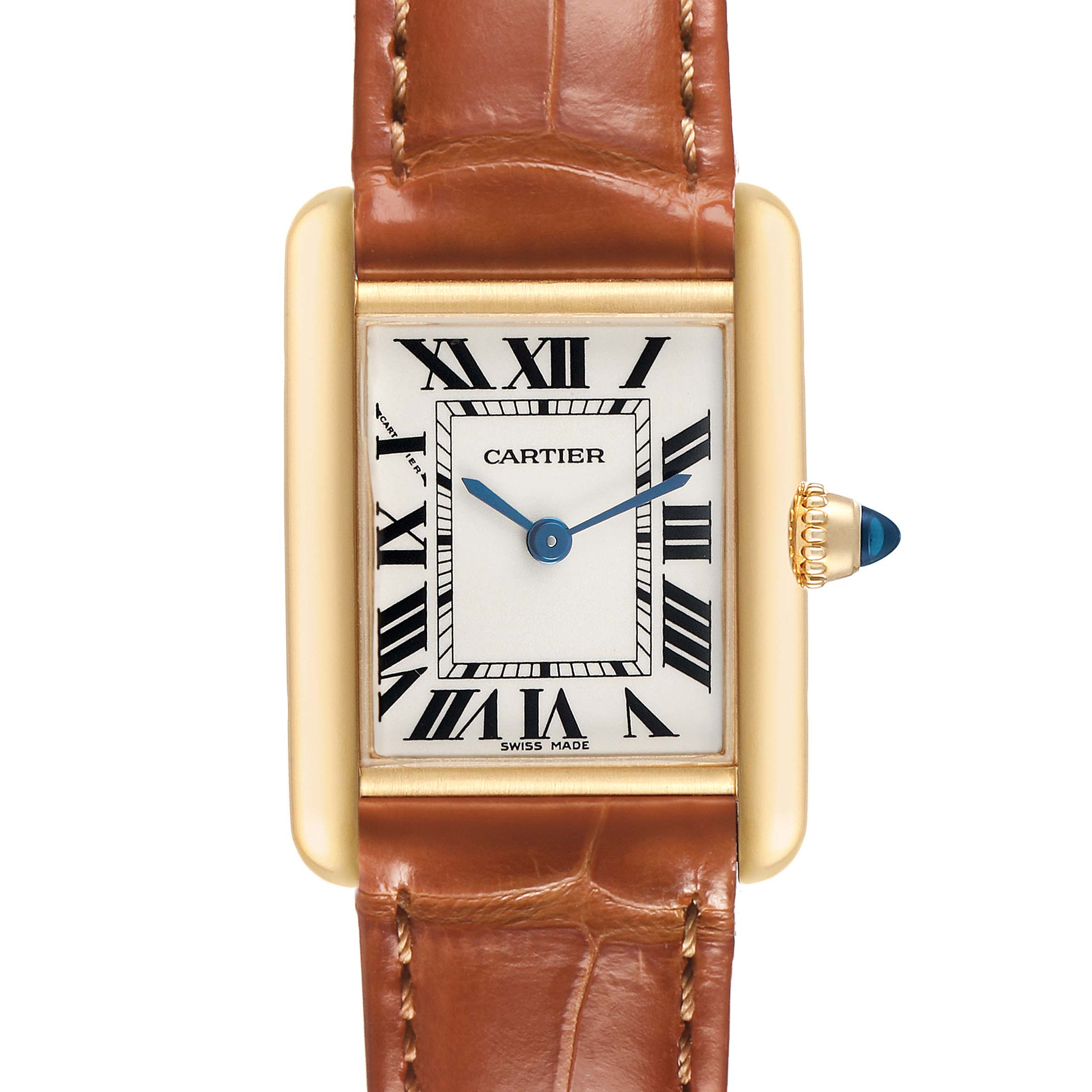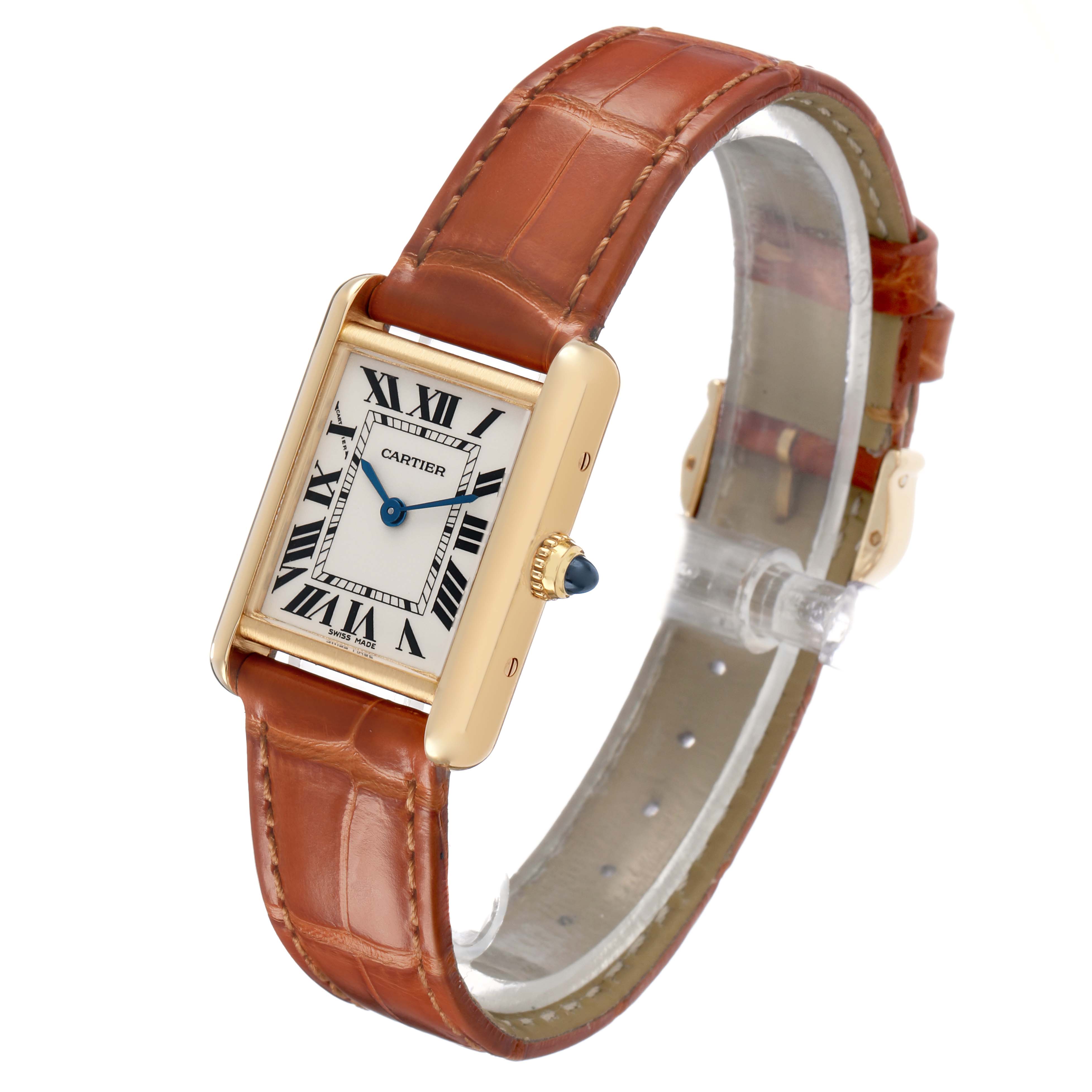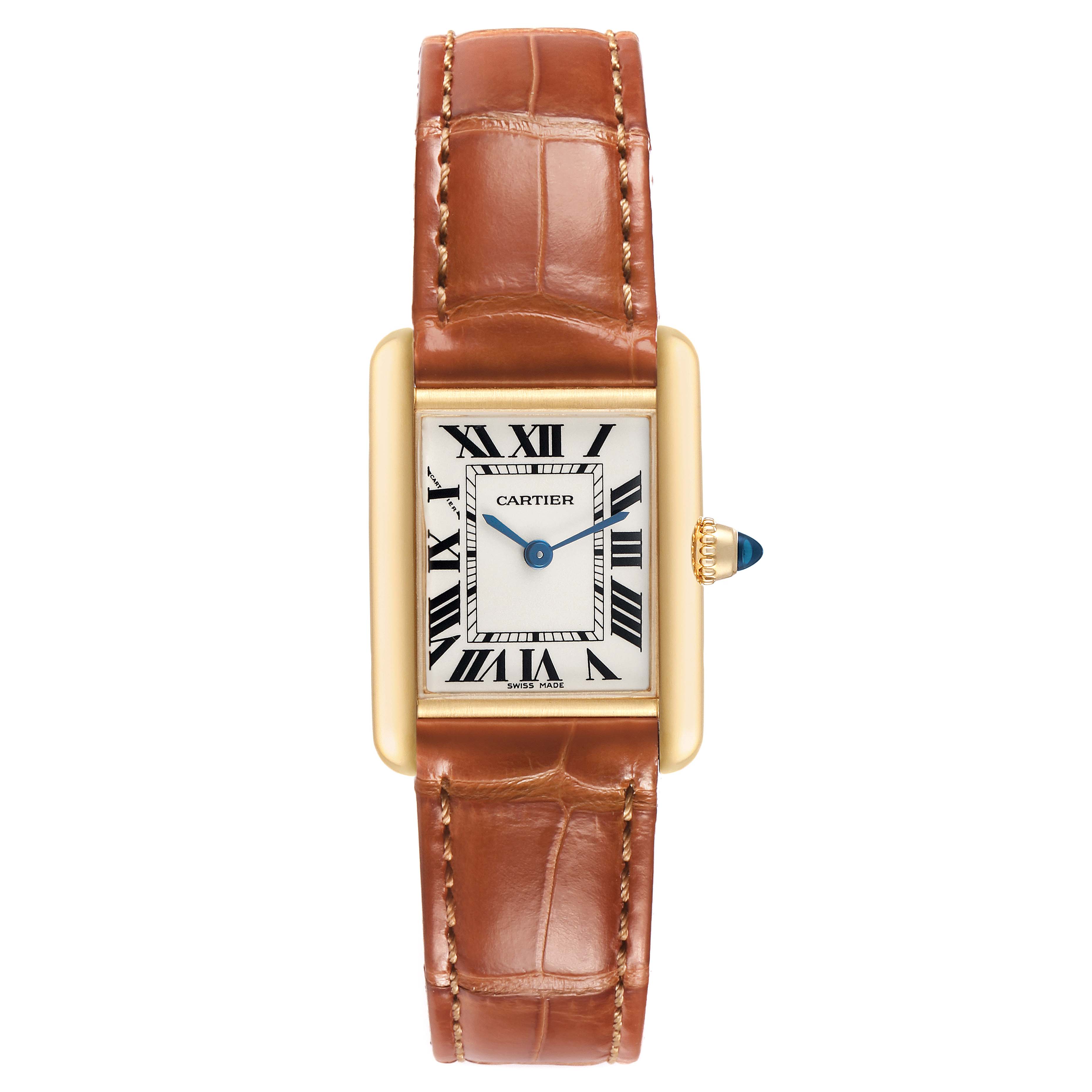 Cartier Tank Louis Small Yellow Gold Silver Dial Ladies Watch W1529856 Card. Quartz movement. 18k yellow gold square case 29.5 mm x 22.0 mm. Circular grained crown set with a blue sapphire cabochon. . Scratch resistant mineral crystal. Silver grained dial with black radial Roman numeral hour markers and an inner minute track. Sword-shaped blued steel hands. Secret Cartier signature at X. Brown leather strap with an 18k yellow gold tang buckle.