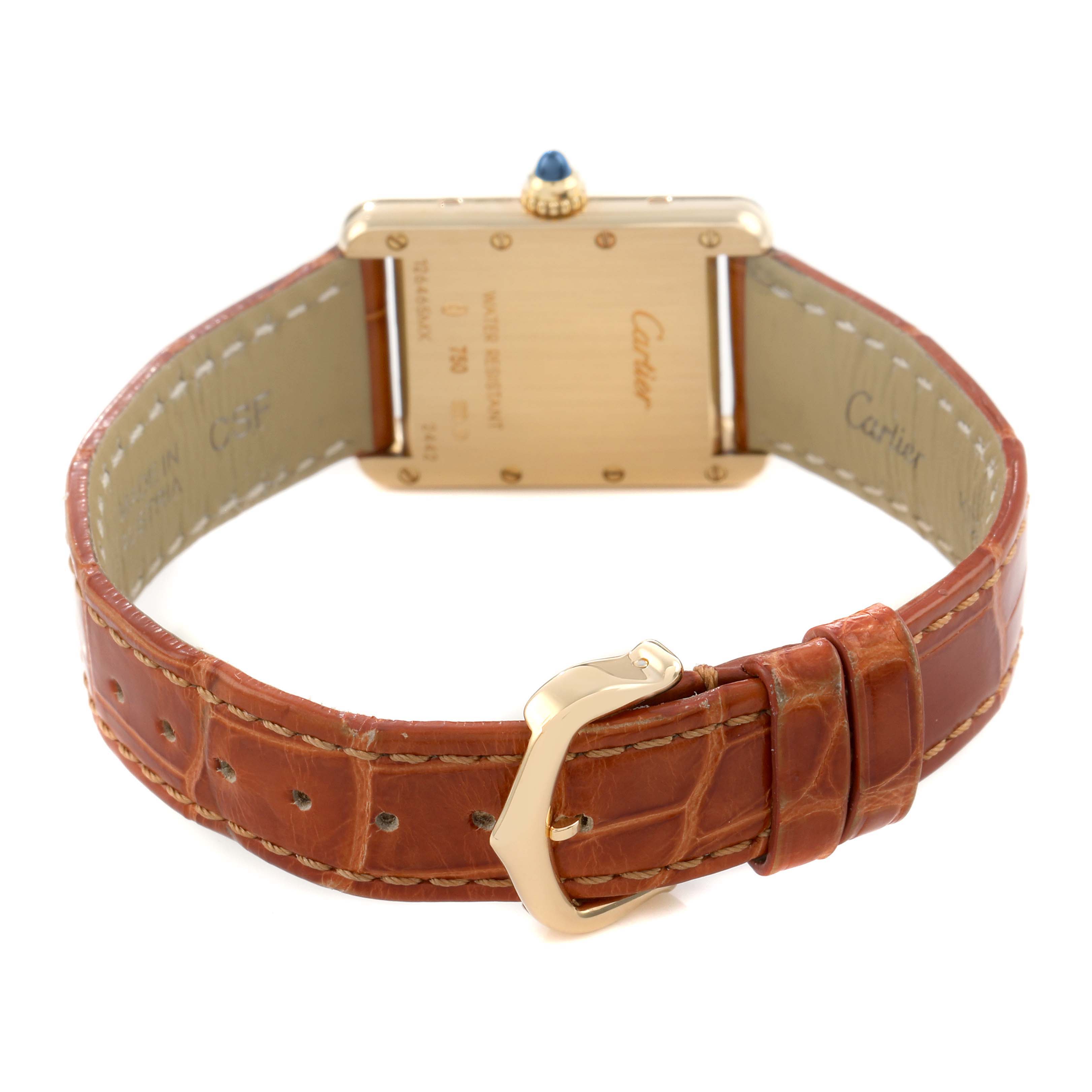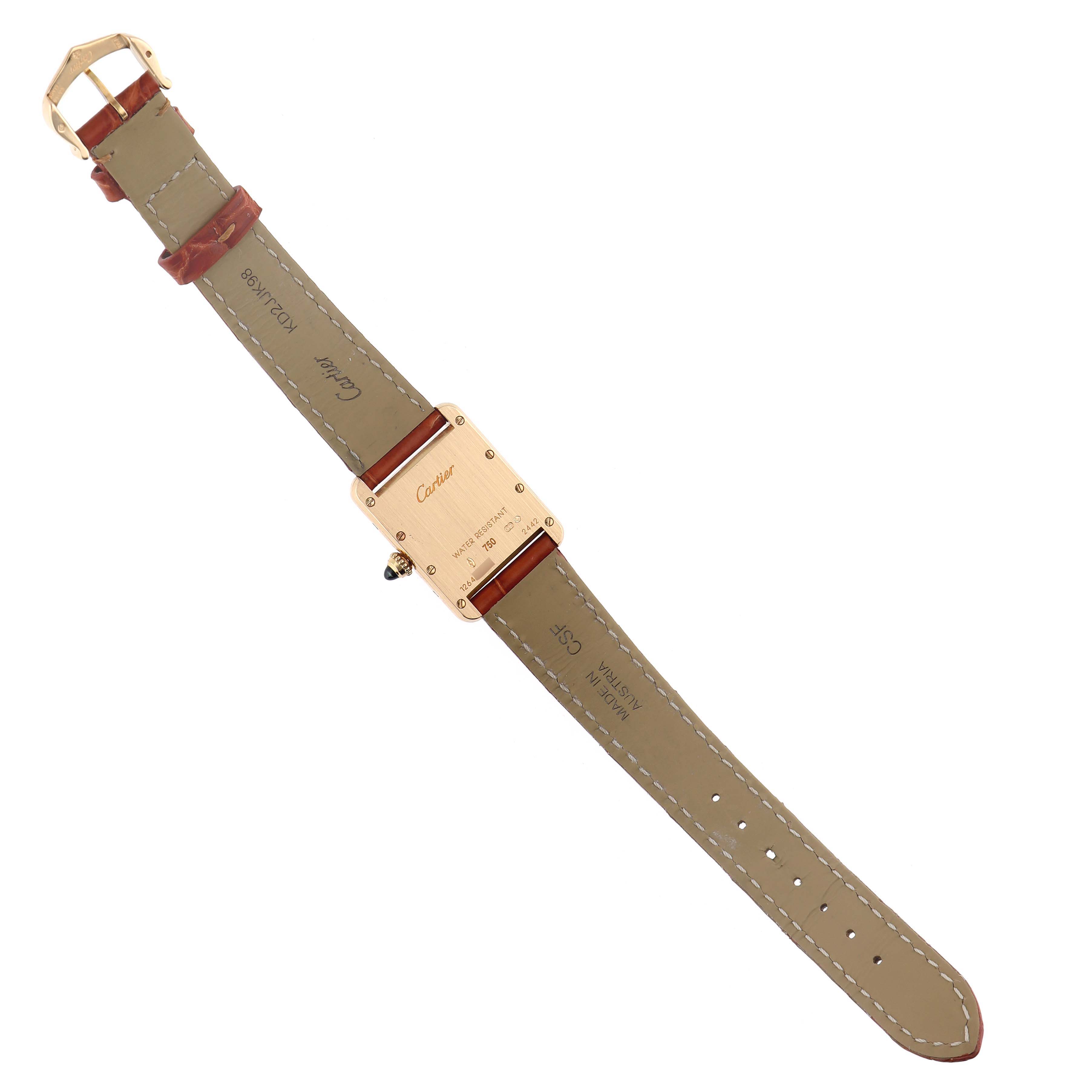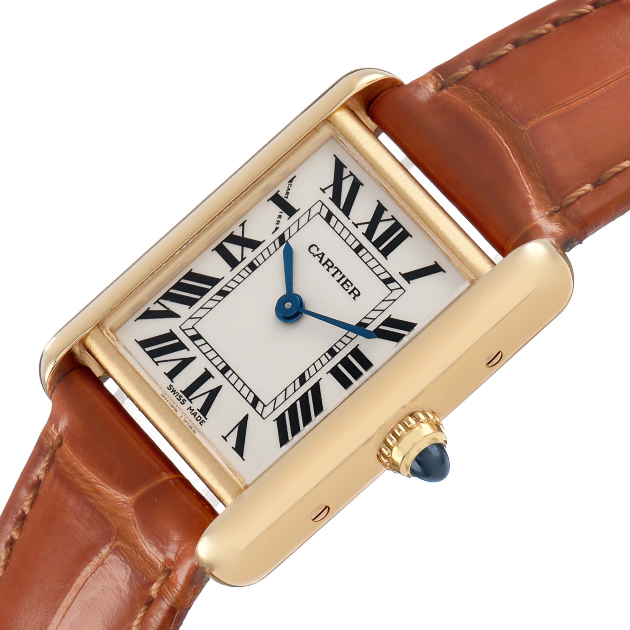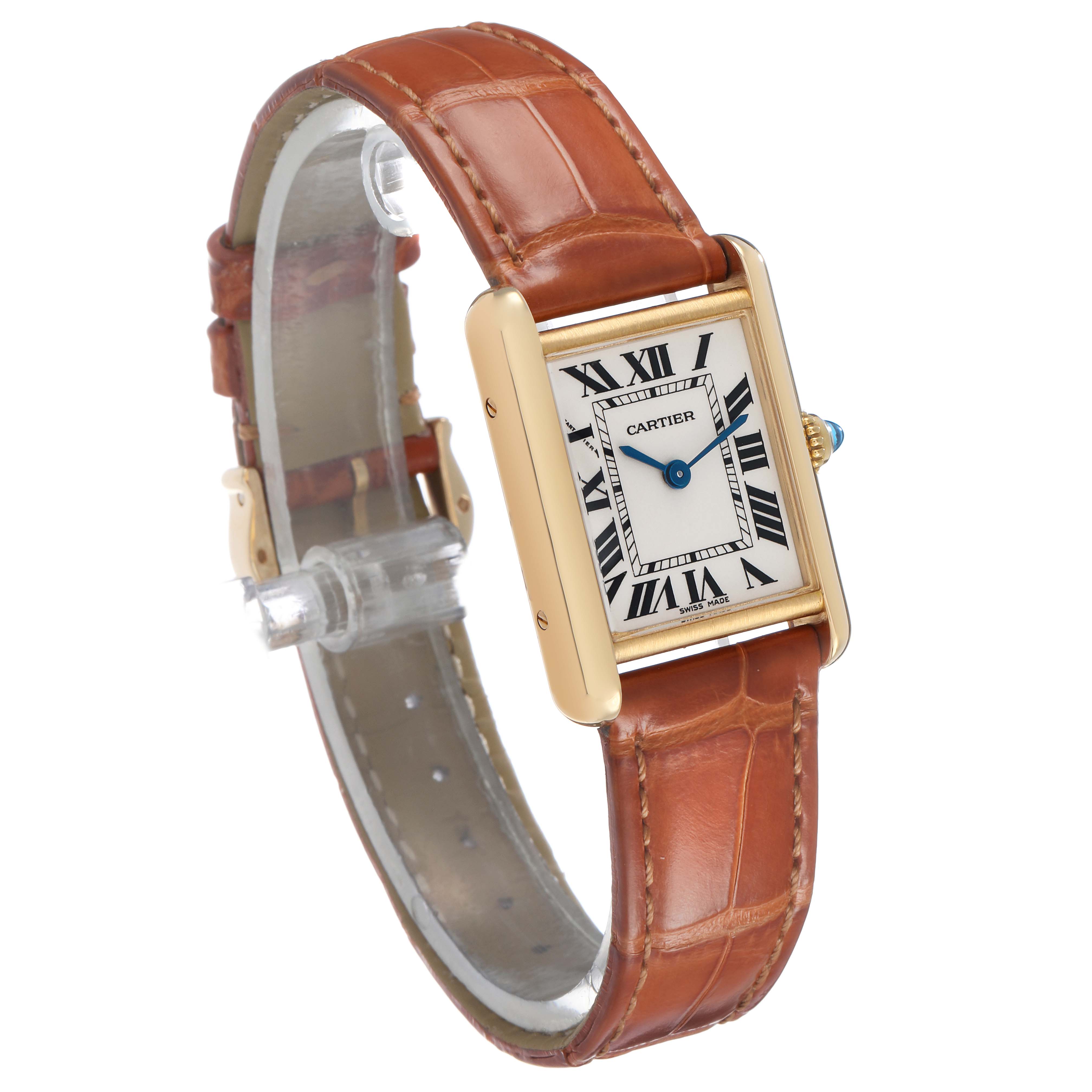 Cartier Tank Louis Small Yellow Gold Silver Dial Ladies Watch W1529856 Card. Quartz movement. 18k yellow gold square case 29.5 mm x 22.0 mm. Circular grained crown set with a blue sapphire cabochon. . Scratch resistant mineral crystal. Silver grained dial with black radial Roman numeral hour markers and an inner minute track. Sword-shaped blued steel hands. Secret Cartier signature at X. Brown leather strap with an 18k yellow gold tang buckle.