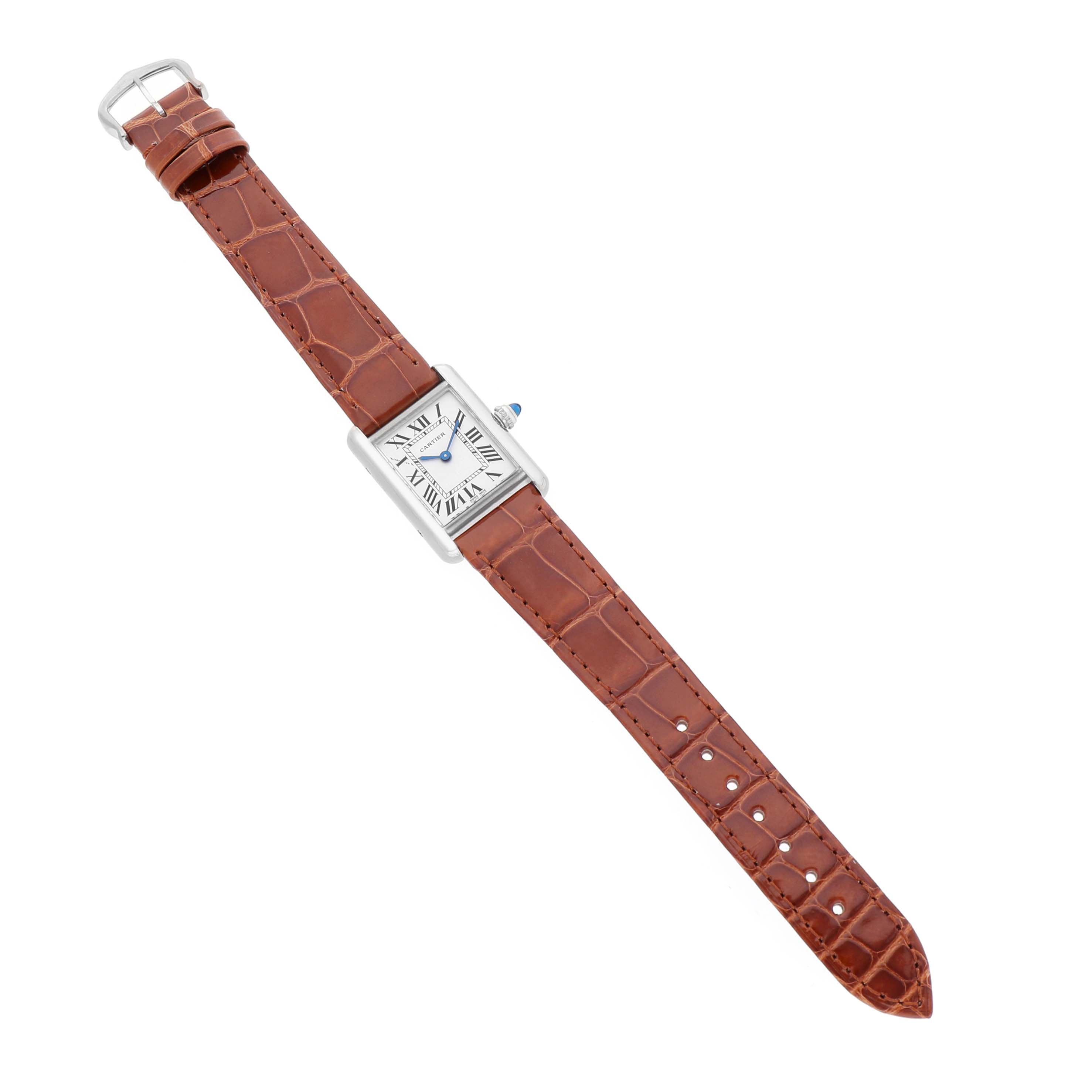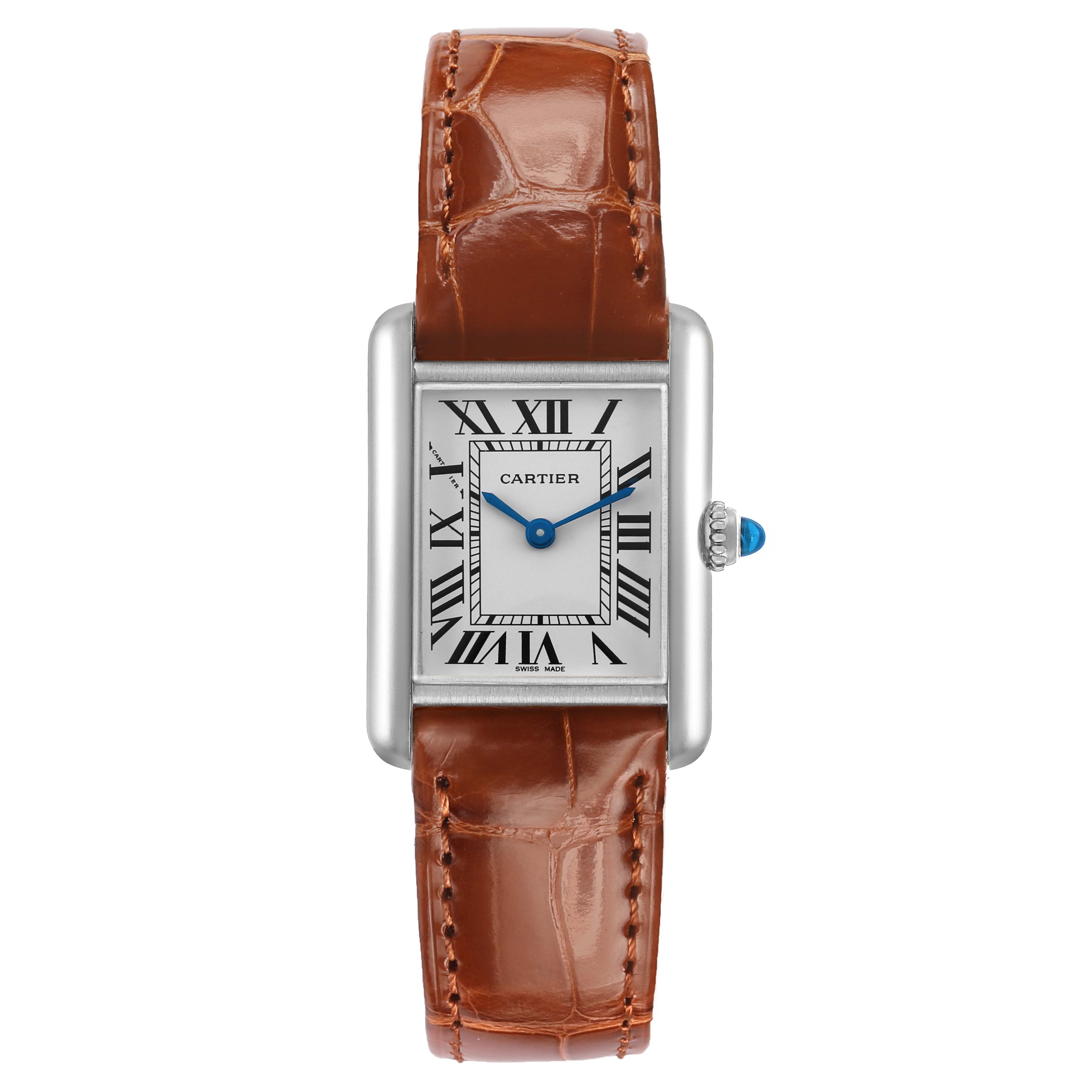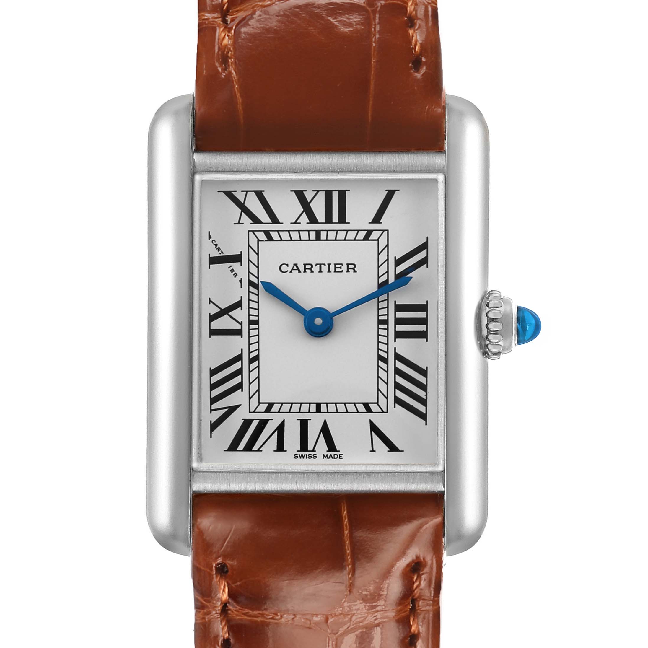 Cartier Tank Louis White Gold Silver Dial Ladies Watch W1541056 Card. Quartz movement. 18K white gold case 22 mm x 29 mm. Circular grained crown set with a blue sapphire cabochon. . Scratch resistant mineral crystal. Silver grained dial with black Roman numeral hour markers. Blued steel sword shaped hands. Secret Cartier signature at X. Brown gloss leather strap with an 18K white gold tang buckle.