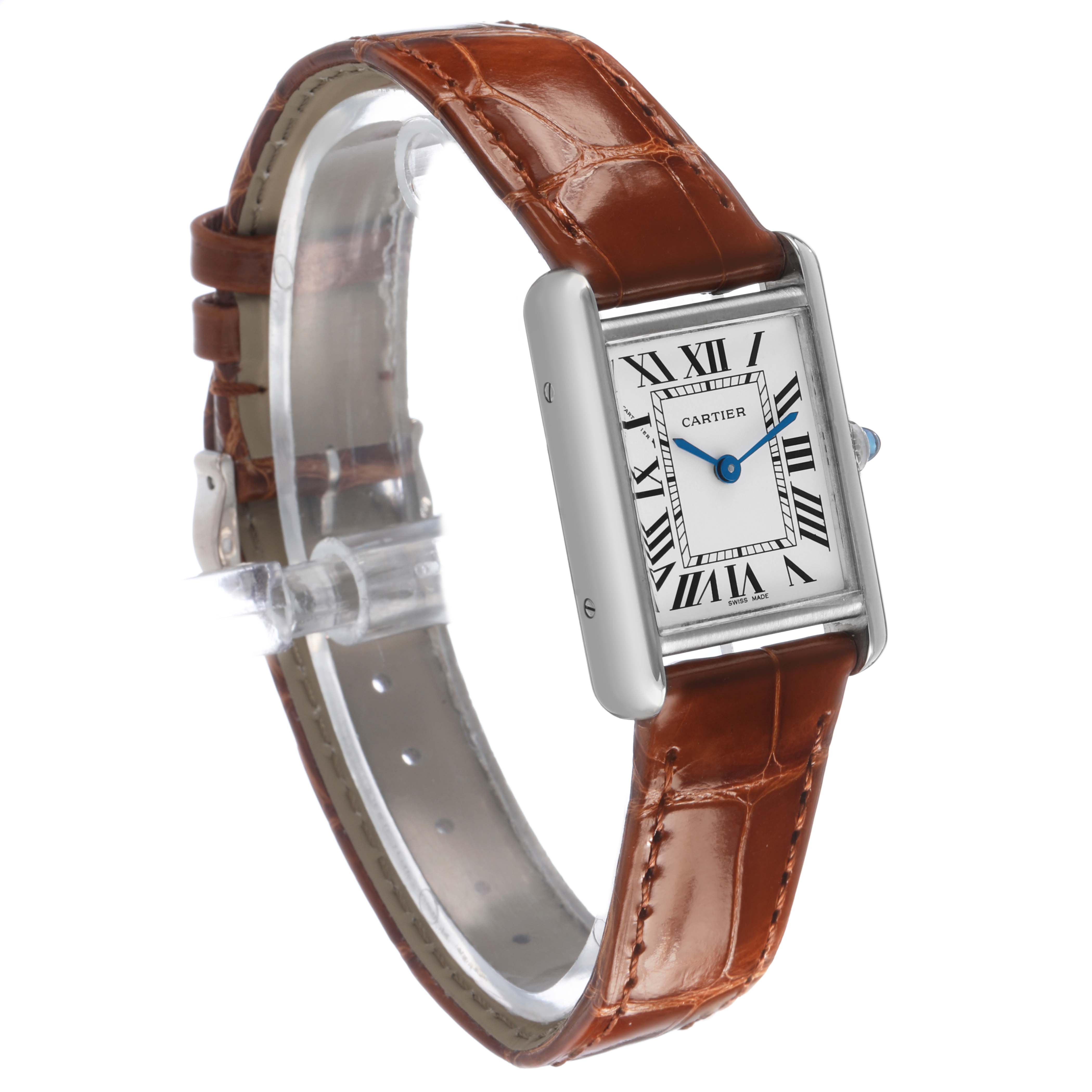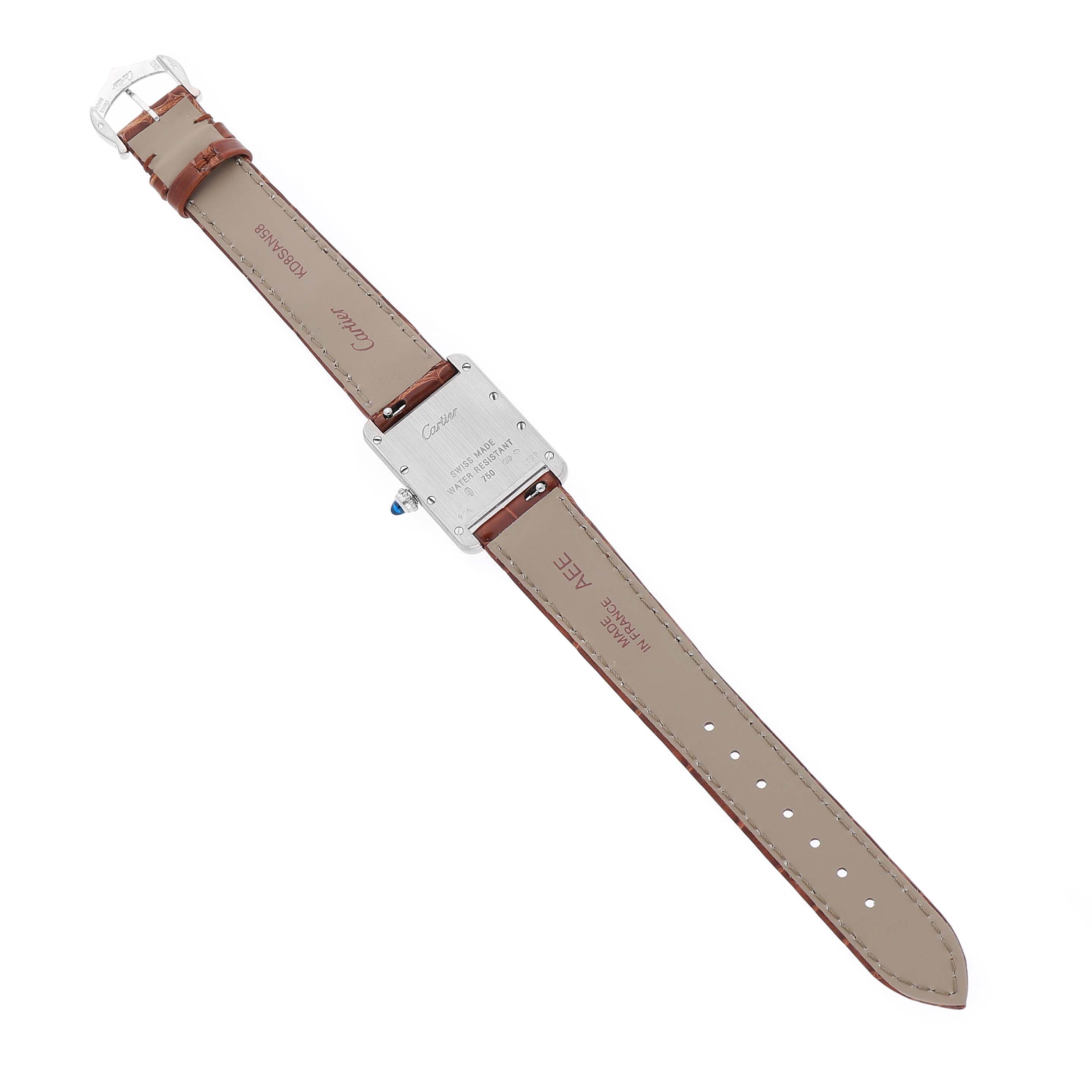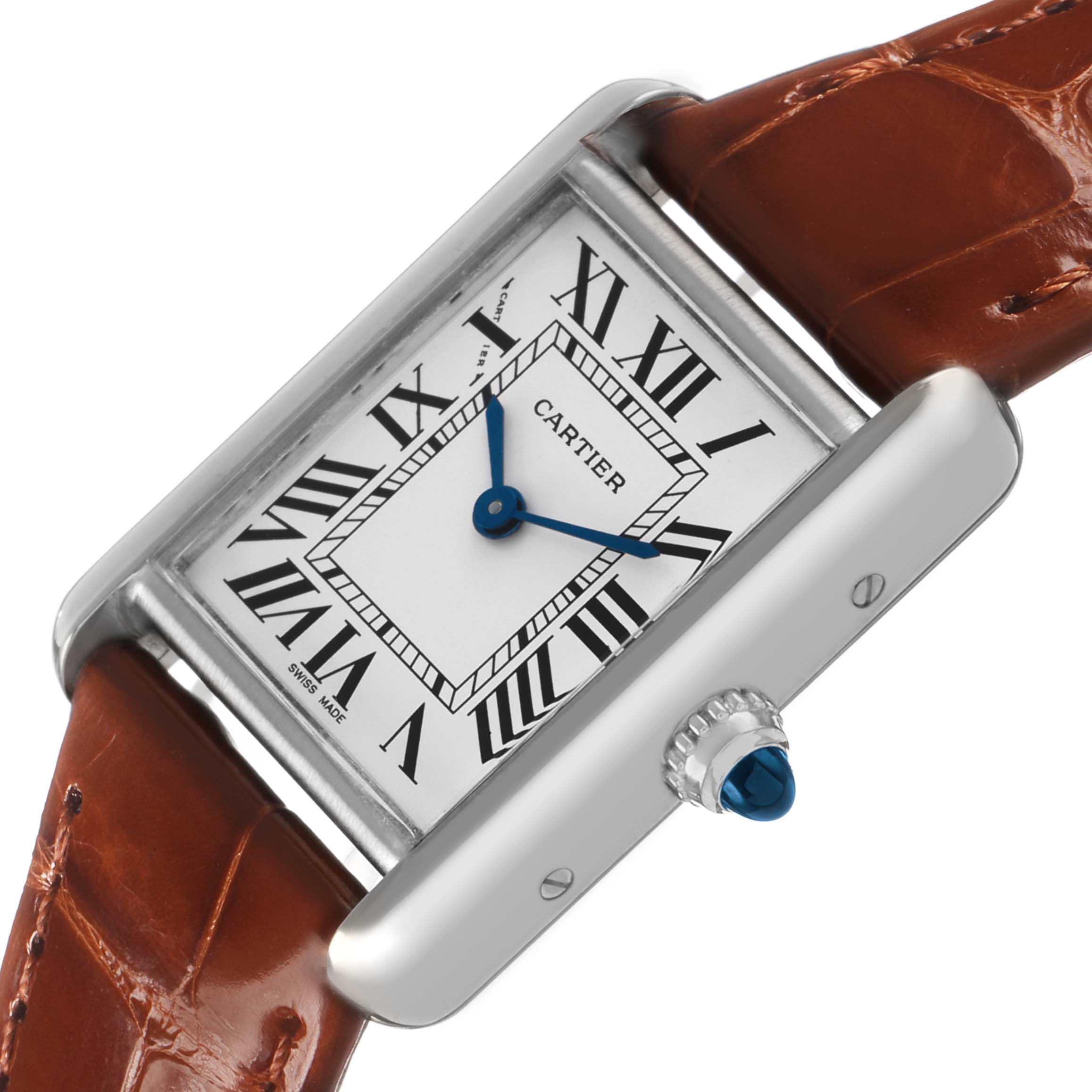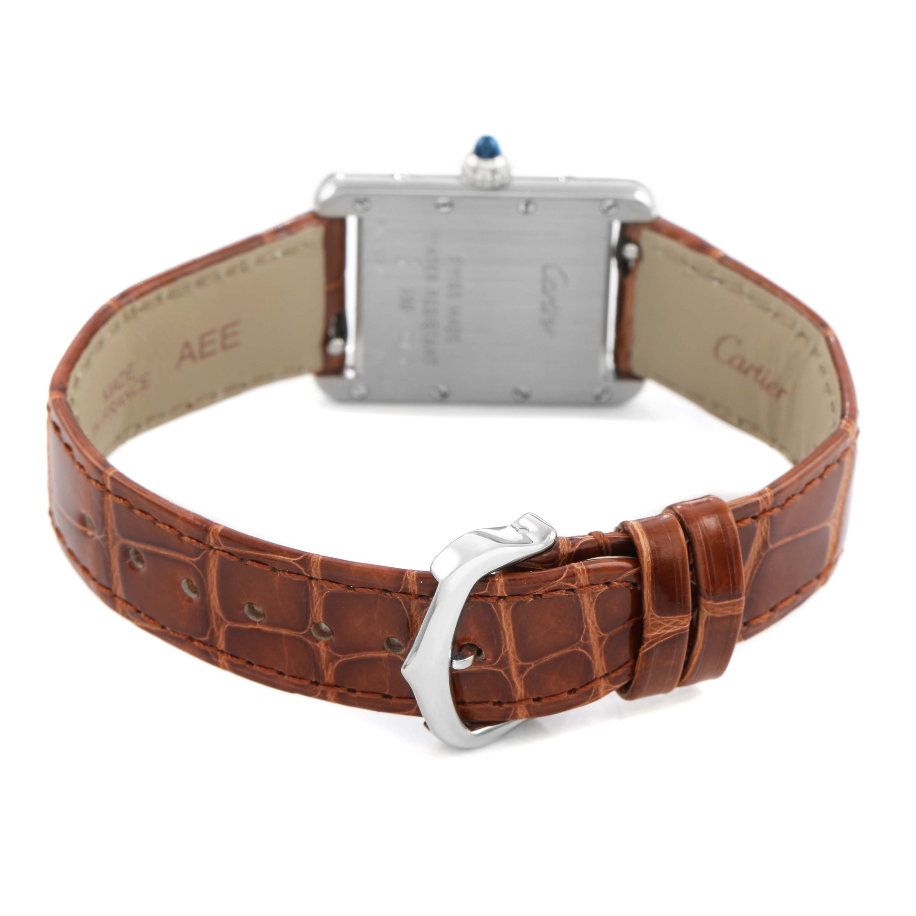 Cartier Tank Louis White Gold Silver Dial Ladies Watch W1541056 Card. Quartz movement. 18K white gold case 22 mm x 29 mm. Circular grained crown set with a blue sapphire cabochon. . Scratch resistant mineral crystal. Silver grained dial with black Roman numeral hour markers. Blued steel sword shaped hands. Secret Cartier signature at X. Brown gloss leather strap with an 18K white gold tang buckle.