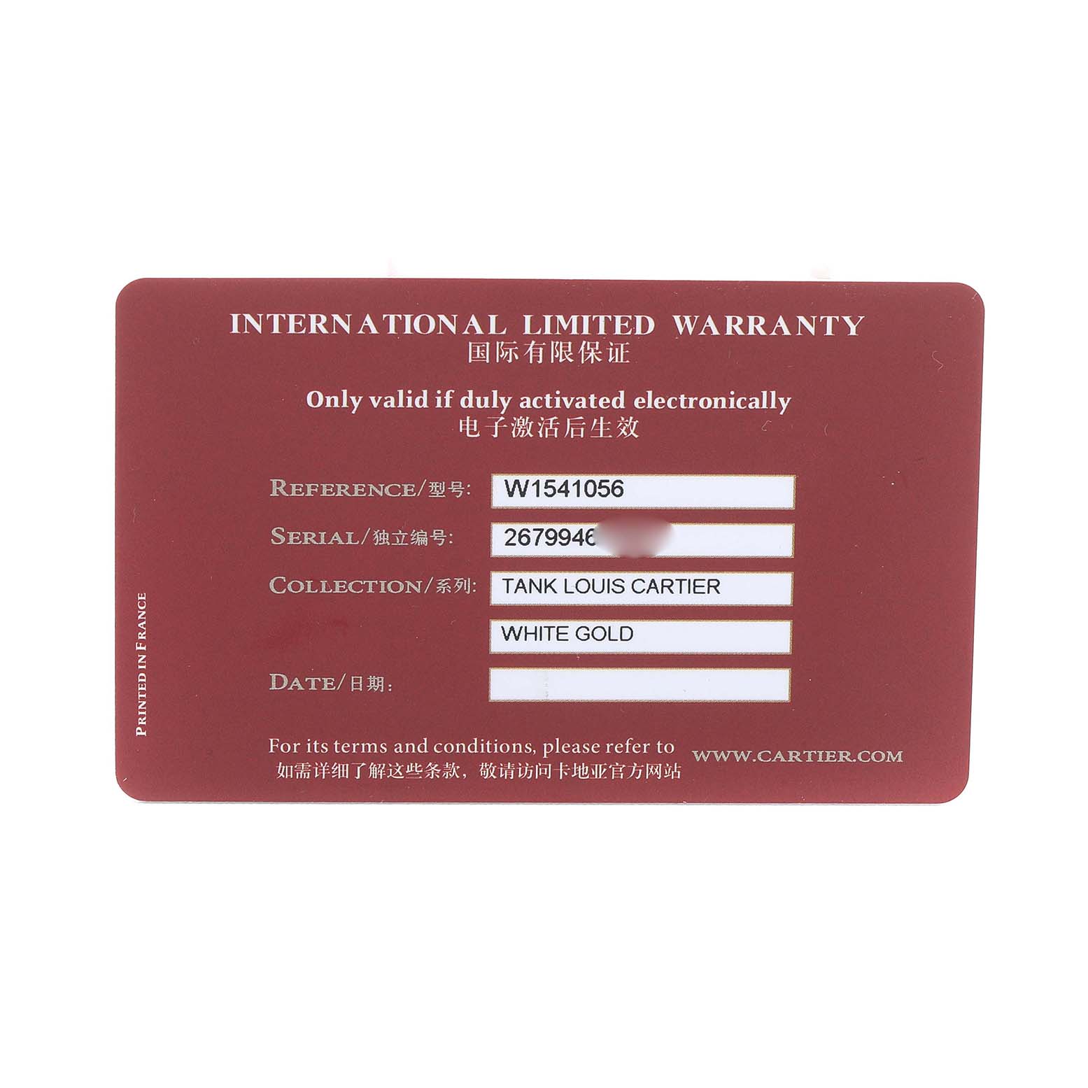 | Model Name: | Cartier Tank Louis White Gold Silver Dial Ladies Watch W1541056 Card |