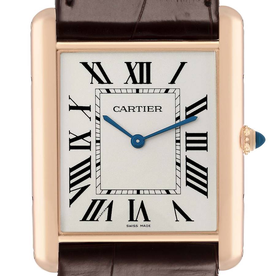 Cartier Tank Louis XL Rose Gold Manual Winding Mens Watch W1560017 Card. Manual-winding movement. 18k rose gold rectangular case 40.4 mm x 34.92 mm. Circular grained crown set with a blue sapphire cabochon. . Mineral crystal. Silvered grained dial with black Roman numeral hour markers and an inner minute track. Sword-shaped blue hands. Secret Cartier signature at VII. Brown alligator leather strap with an 18k rose gold tang buckle.