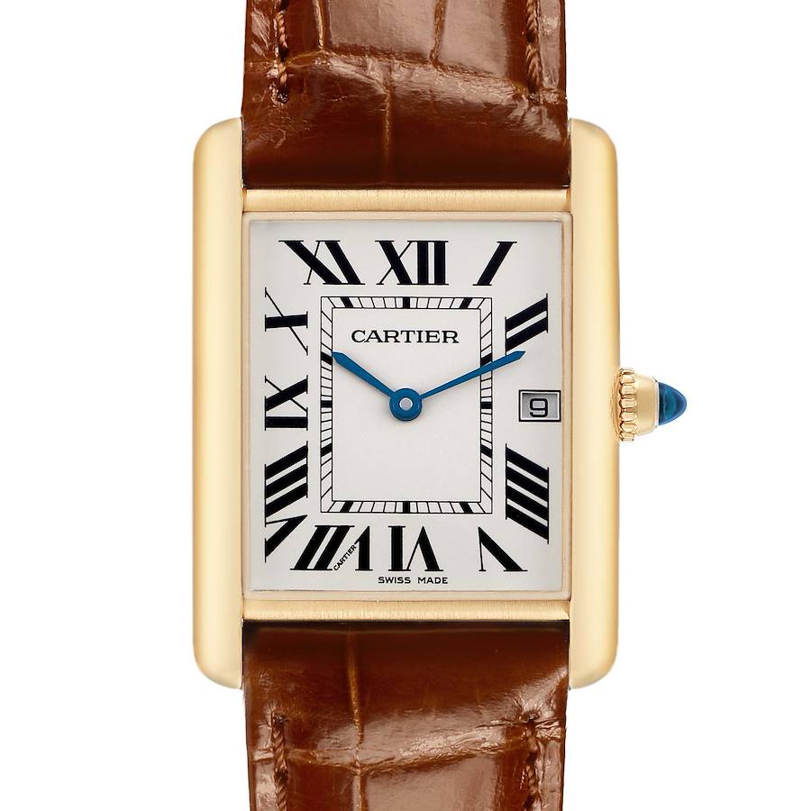 Cartier Tank Louis Yellow Gold Brown Leather Mens Watch W1529756. Quartz movement. 18k yellow gold rectangular case 25.0 x 33.0 mm. Circular grained crown set with a blue sapphire cabochon. . Scratch resistant mineral crystal. Silver grained dial with black radial Roman numeral hour markers and an inner minute track. Blued steel sword-shaped hands. Date calendar at the 3 o'clock aperture. Secret Cartier signature at VII. Brown leather strap with an 18K yellow gold tang buckle.