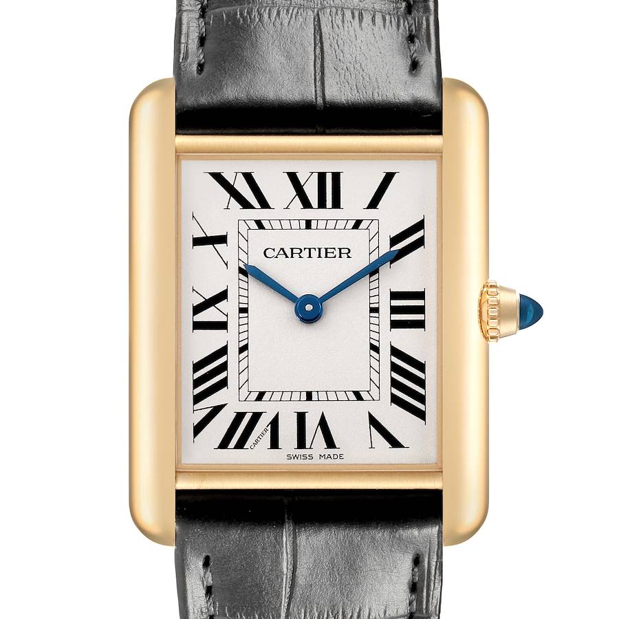 Cartier Tank Louis Yellow Gold Silver Dial Mens Watch WGTA0067 Card. Quartz movement. 18k yellow gold case 33.7 x 25.5 mm. Circular grained crown set with a blue sapphire cabochon. . Scratch resistant mineral crystal. Silvered grained dial with black Roman numeral hour markers and an inner minute track. Sword-shaped blued hands. Secret Cartier signature at VII. Dark grey leather strap with 18k yellow gold ardillon buckle.