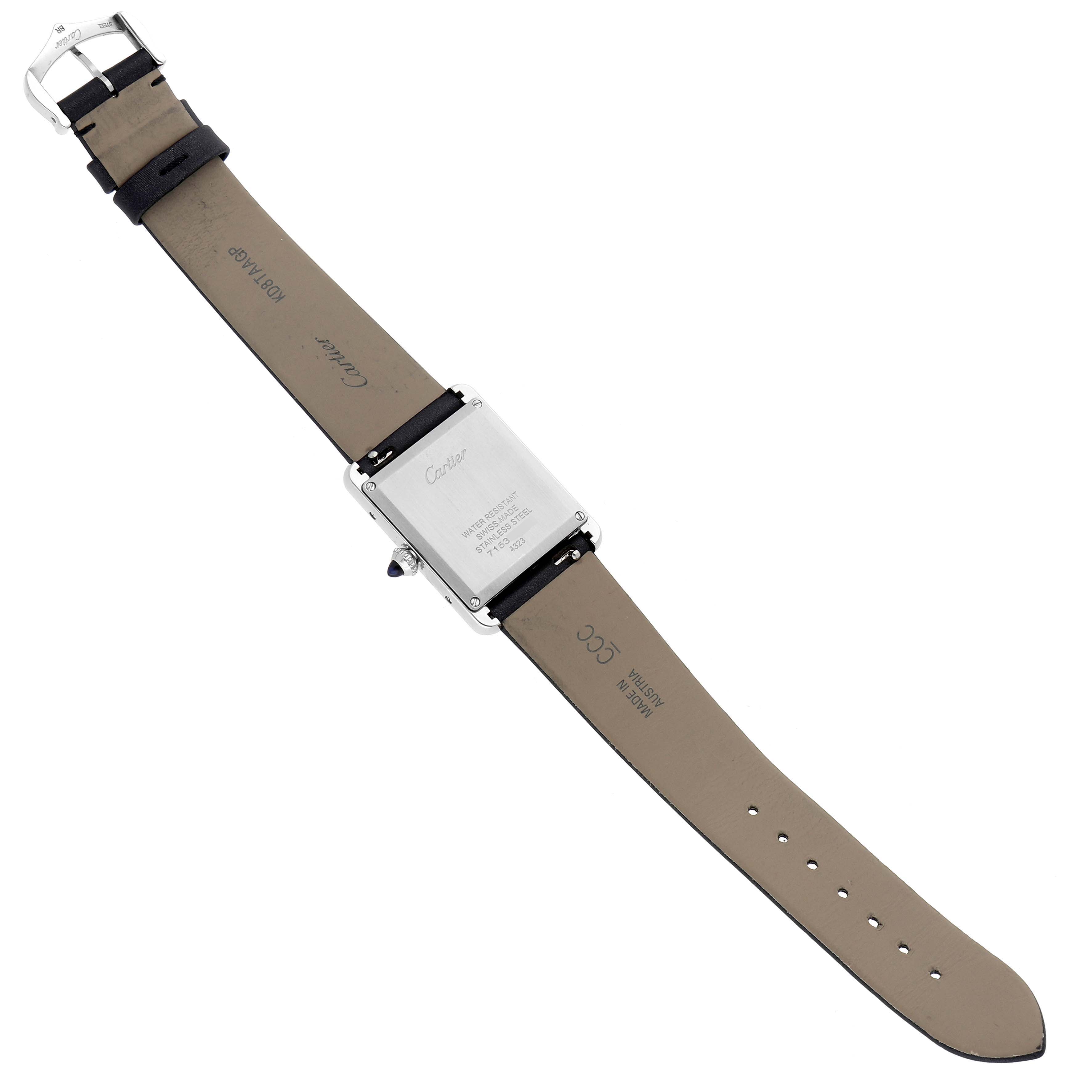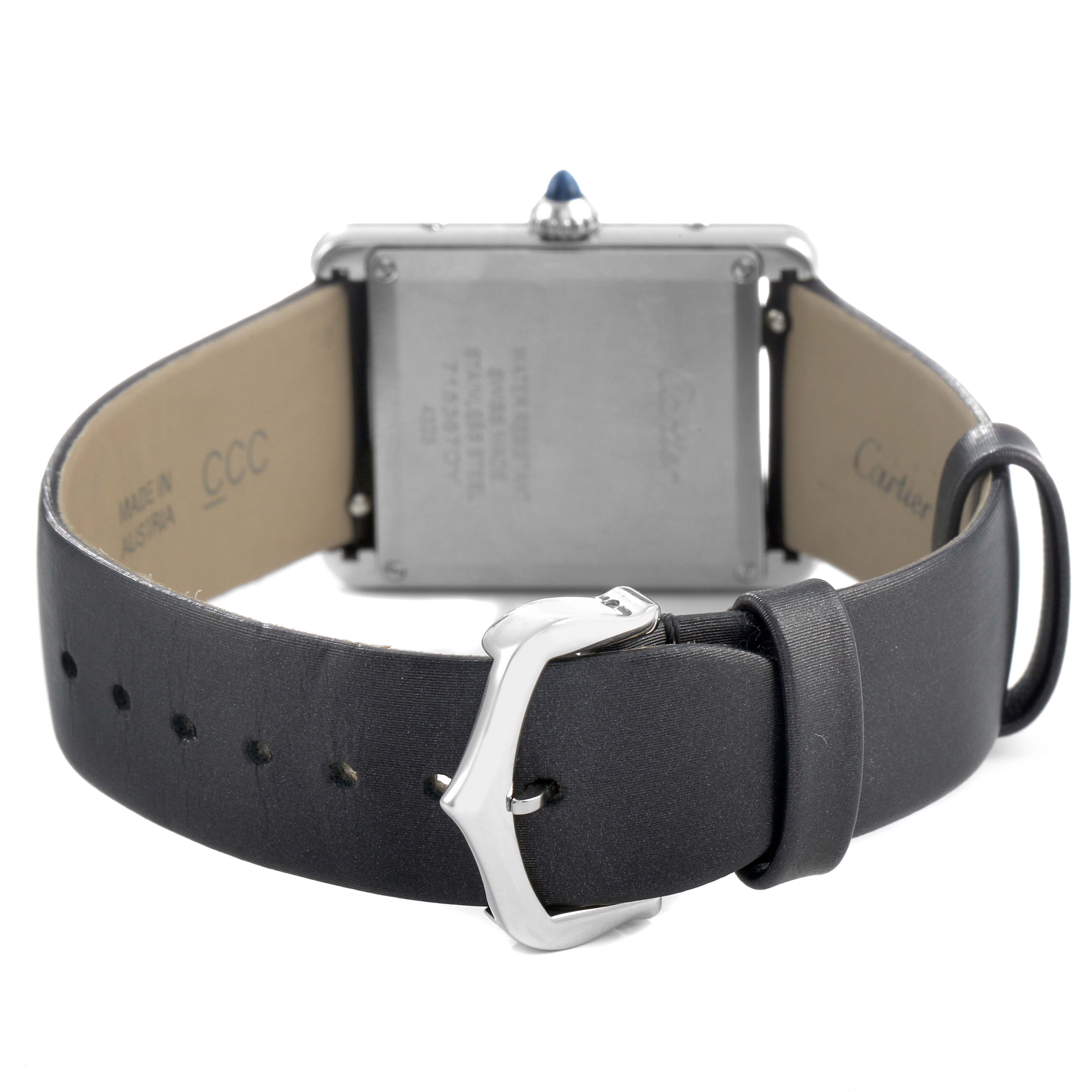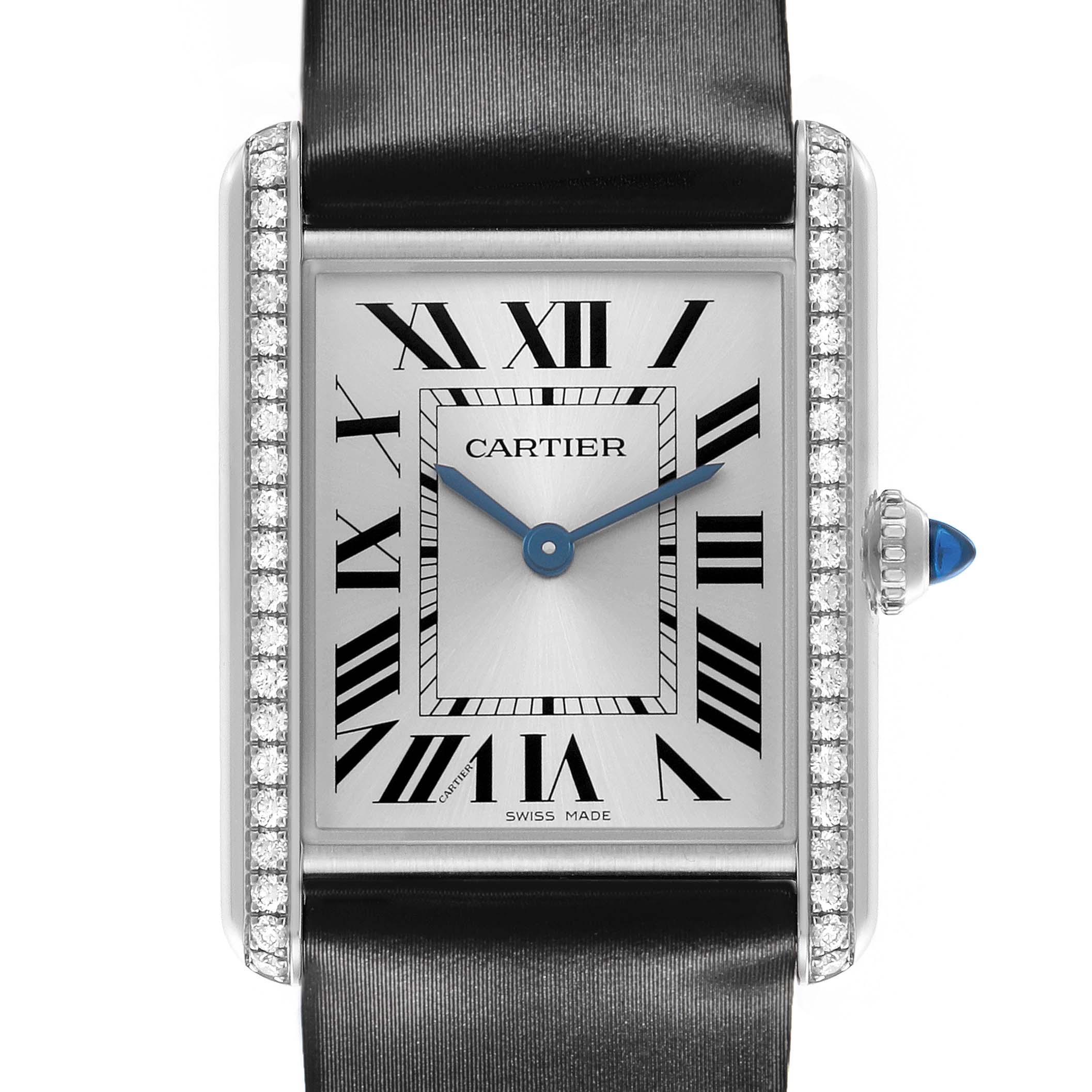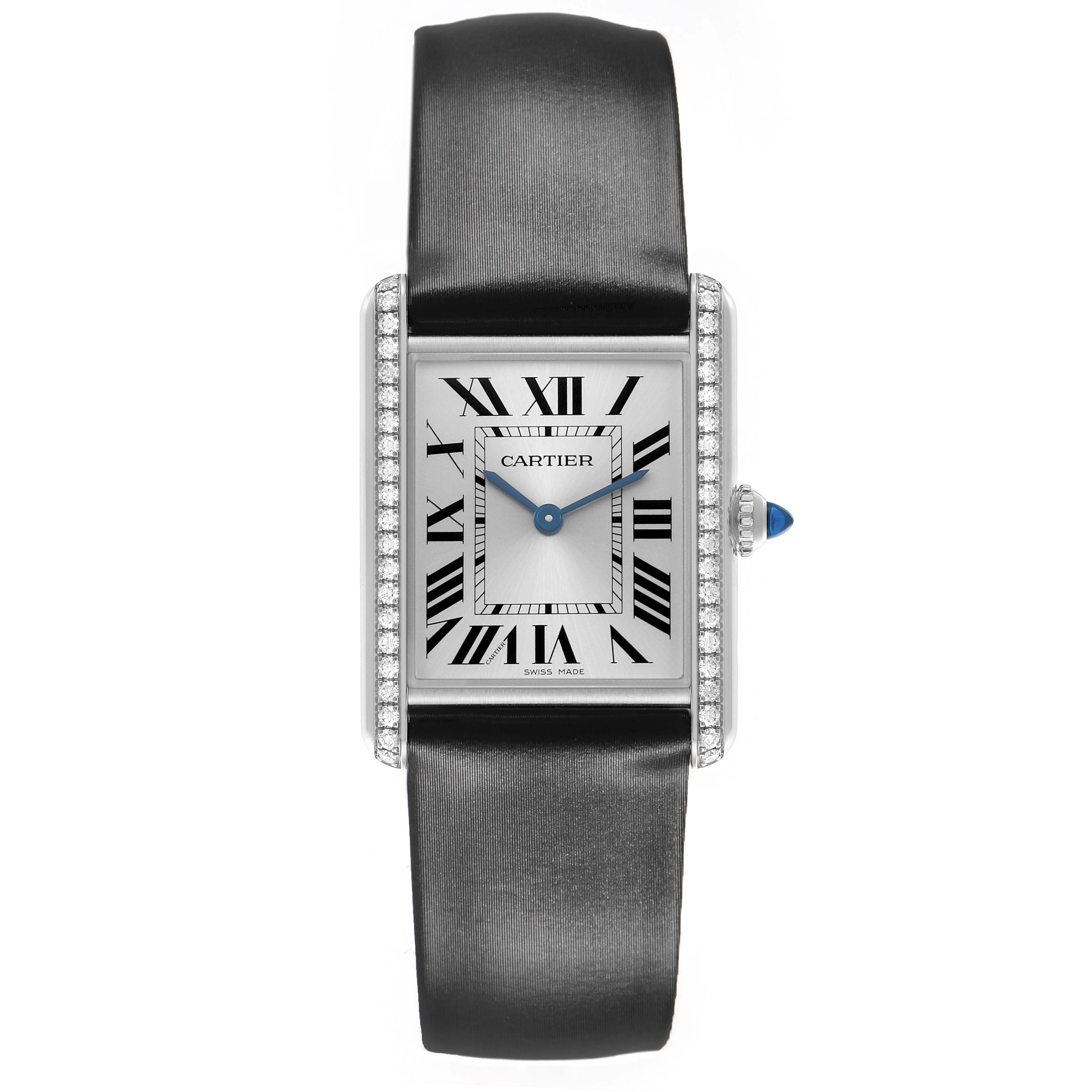 Cartier Tank Must Large Steel Diamond Ladies Watch W4TA0017 Card. Quartz movement. Stainless steel rectangular case 33.7 x 25.5 mm. Circular grained crown set with a blue spinel cabochon. Stainless steel original Cartier factory diamond bezel. Scratch resistant sapphire crystal. Silver dial with black Roman numeral hour markers and an inner minute track. Sword-shaped blue hands. Secret Cartier signature at VII. Black silk and leather strap with a stainless steel tang buckle.