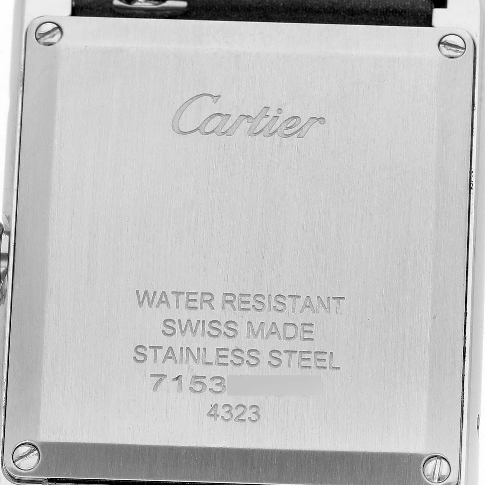 | Dial: | Silver dial with black Roman numeral hour markers and an inner minute track. Sword-shaped blue hands. Secret Cartier signature at VII. |