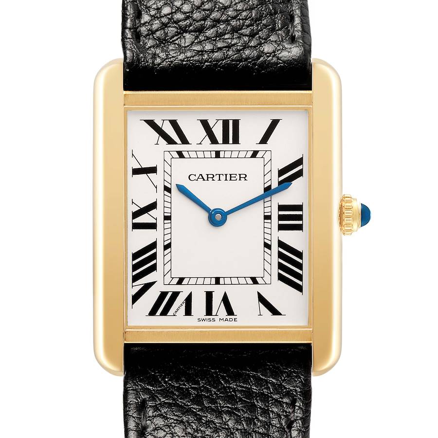 Cartier Tank Solo Large Silver Dial Steel Yellow Gold Mens Watch W5200004. Quartz movement. 18k yellow gold rectangular case 34.0 x 27.0 mm. Stainless steel case back. Circular grained crown set with a blue spinel cabochon. . Scratch resistant sapphire crystal. Silver opalined dial with black radial Roman numeral hour markers and an inner minute track. Sword-shaped blued steel hands. Secret Cartier signature at VII. Black leather strap with an 18k yellow gold tang buckle.