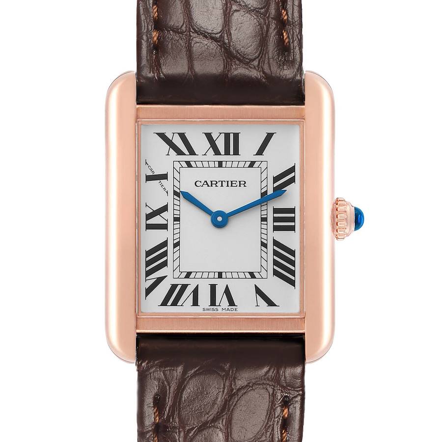 Cartier Tank Solo Rose Gold Steel Ladies Watch W5200024. Quartz movement. 18k rose gold rectangular case 30.0 x 24.4 mm. Stainless steel case back. Circular grained crown set with blue spinel cabochon. . Scratch resistant sapphire crystal. Silvered grained dial with black Roman numeral hour markers and an inner minute track. Blued steel sword-shaped hands. Secret Cartier signature at X. Brown leather strap with an 18k rose gold tang buckle.