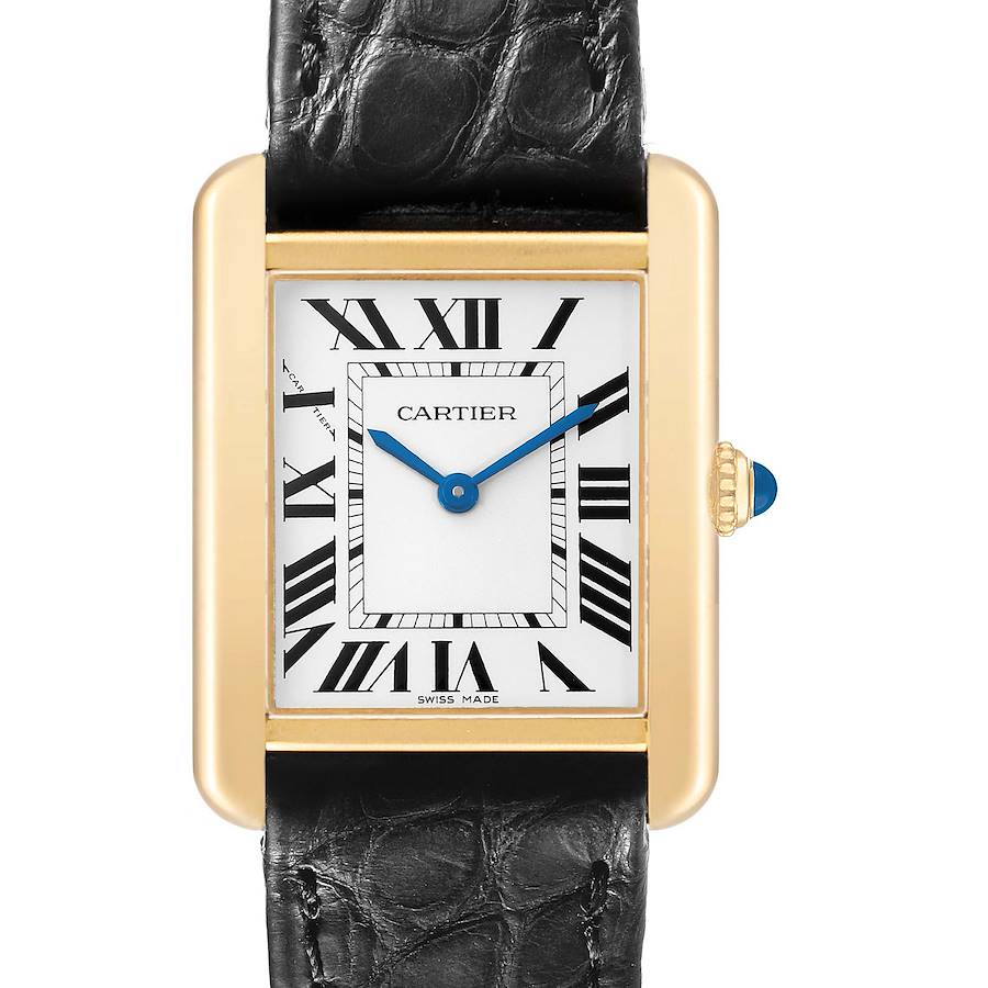 Cartier Tank Solo Yellow Gold Steel Ladies Watch W5200024. Quartz movement. 18k yellow gold rectangular case 30.0 x 24.4 mm. Stainless steel case back. Circular grained crown set with blue spinel cabochon. . Scratch resistant sapphire crystal. Silvered grained dial with black Roman numeral hour markers and an inner minute track. Blued steel sword-shaped hands. Secret Cartier signature at X. Black leather strap with an 18k yellow gold tang buckle.