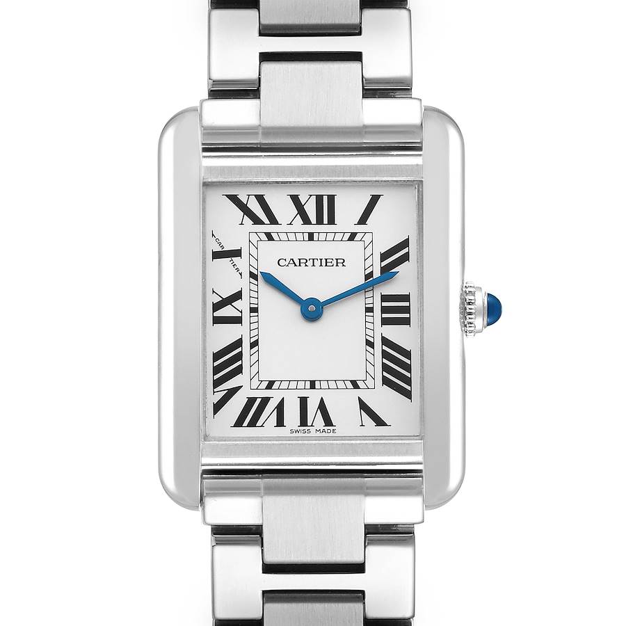 Cartier Tank Solo Small Steel Silver Dial Ladies Watch W5200013 Papers. Quartz movement. Stainless steel case 31 x 24 mm. Circular grained crown set with a blue spinel cabochon. . Scratch resistant sapphire crystal. Silver opaline dial with black Roman numeral hour markers. Sword shaped blued hands. Secret Cartier signature at X. Stainless steel bracelet with hidden butterfly clasp. Fits a 6 3/4" wrist.