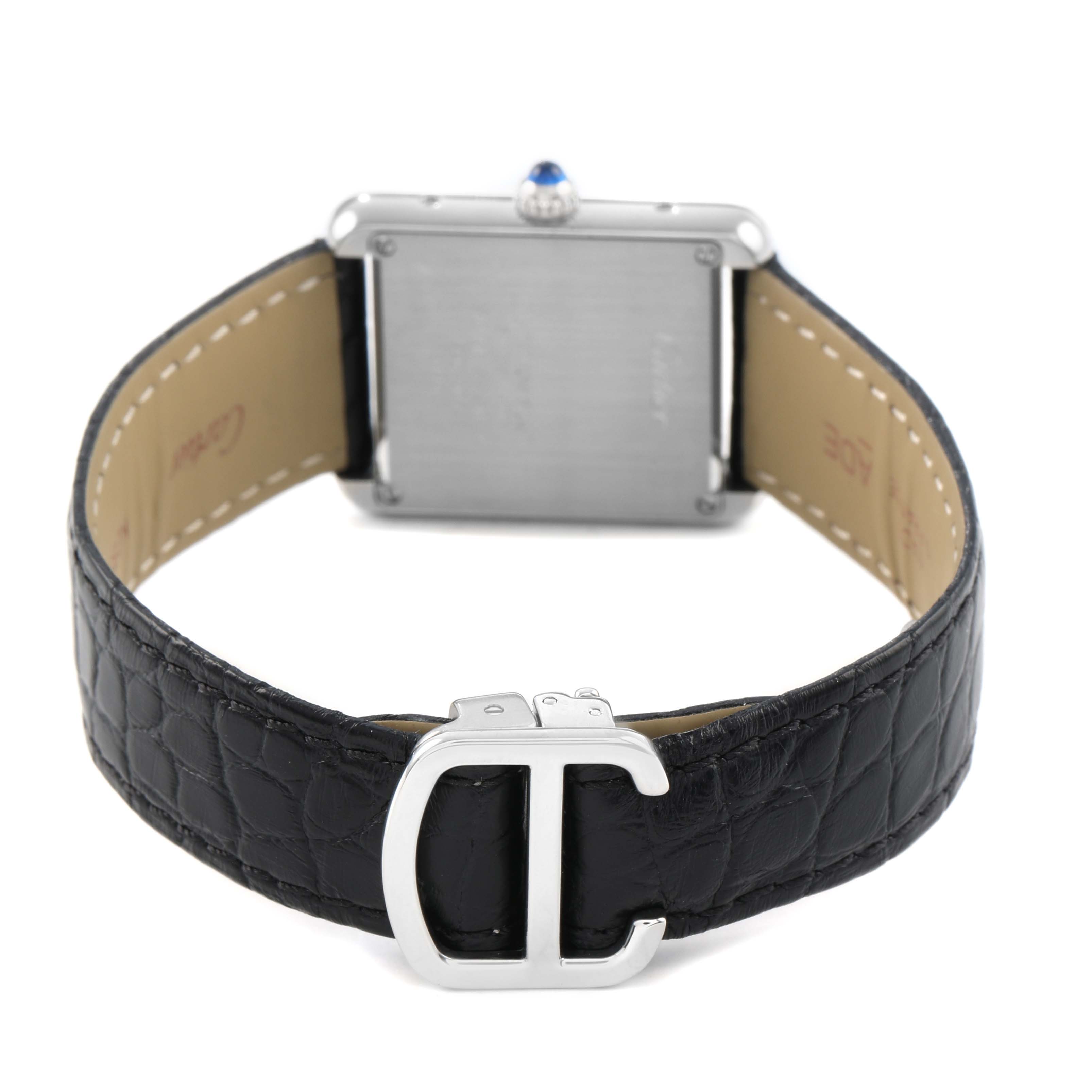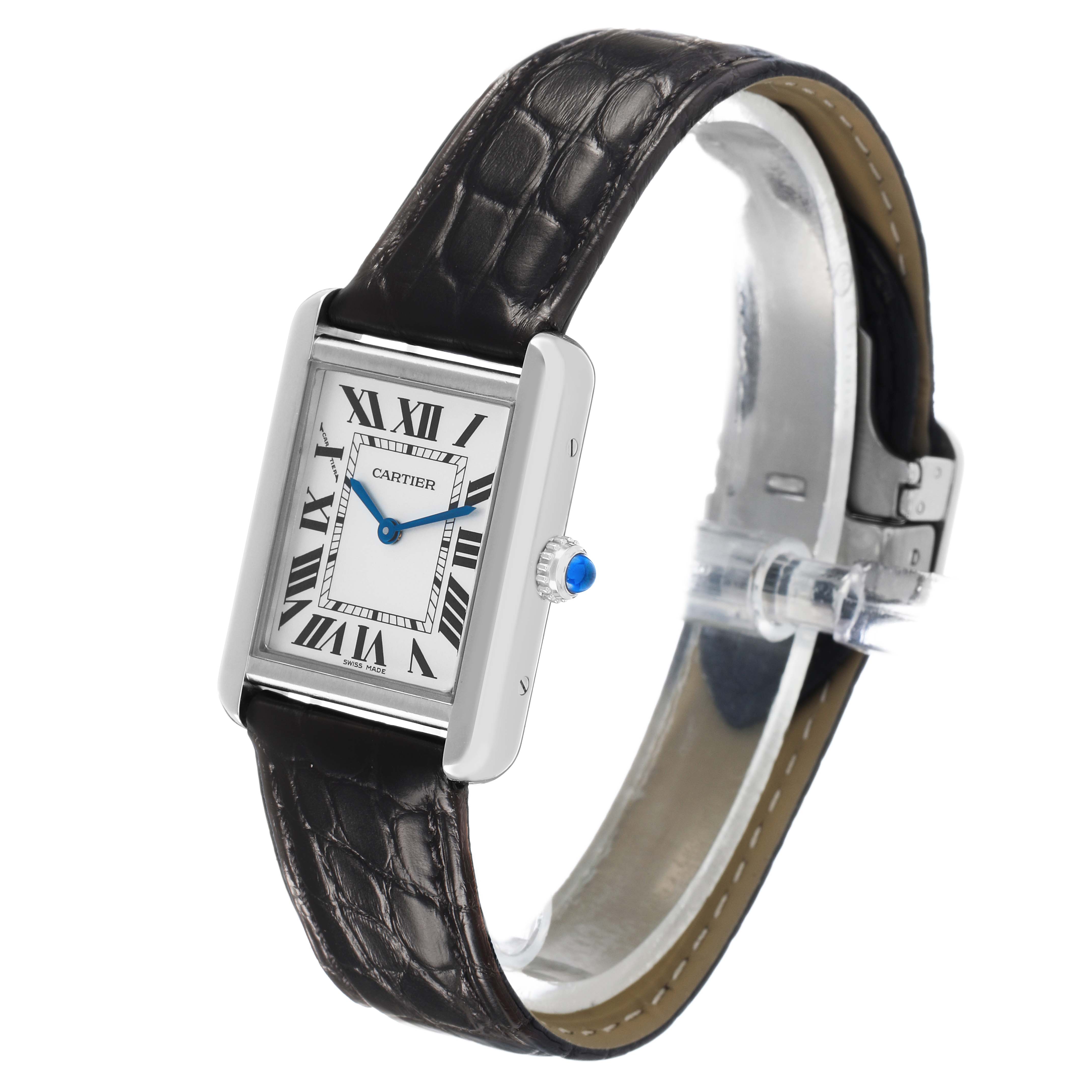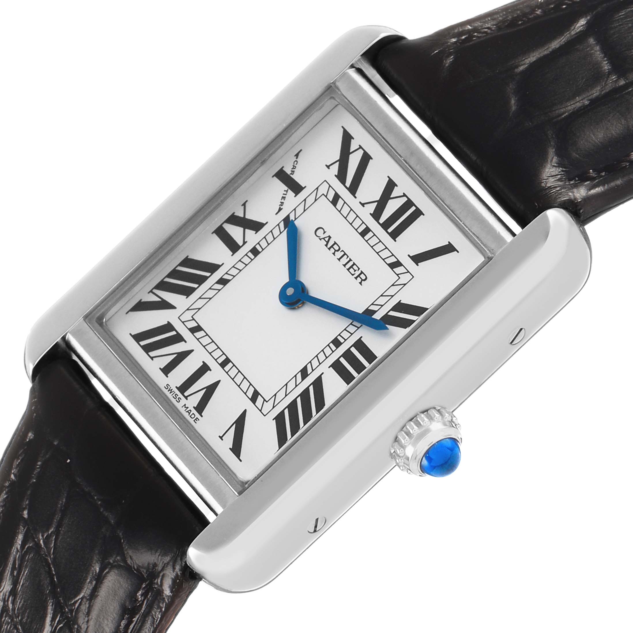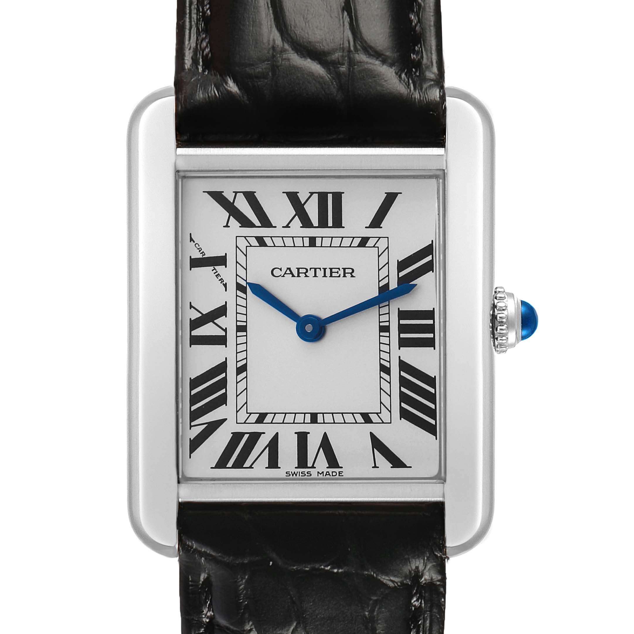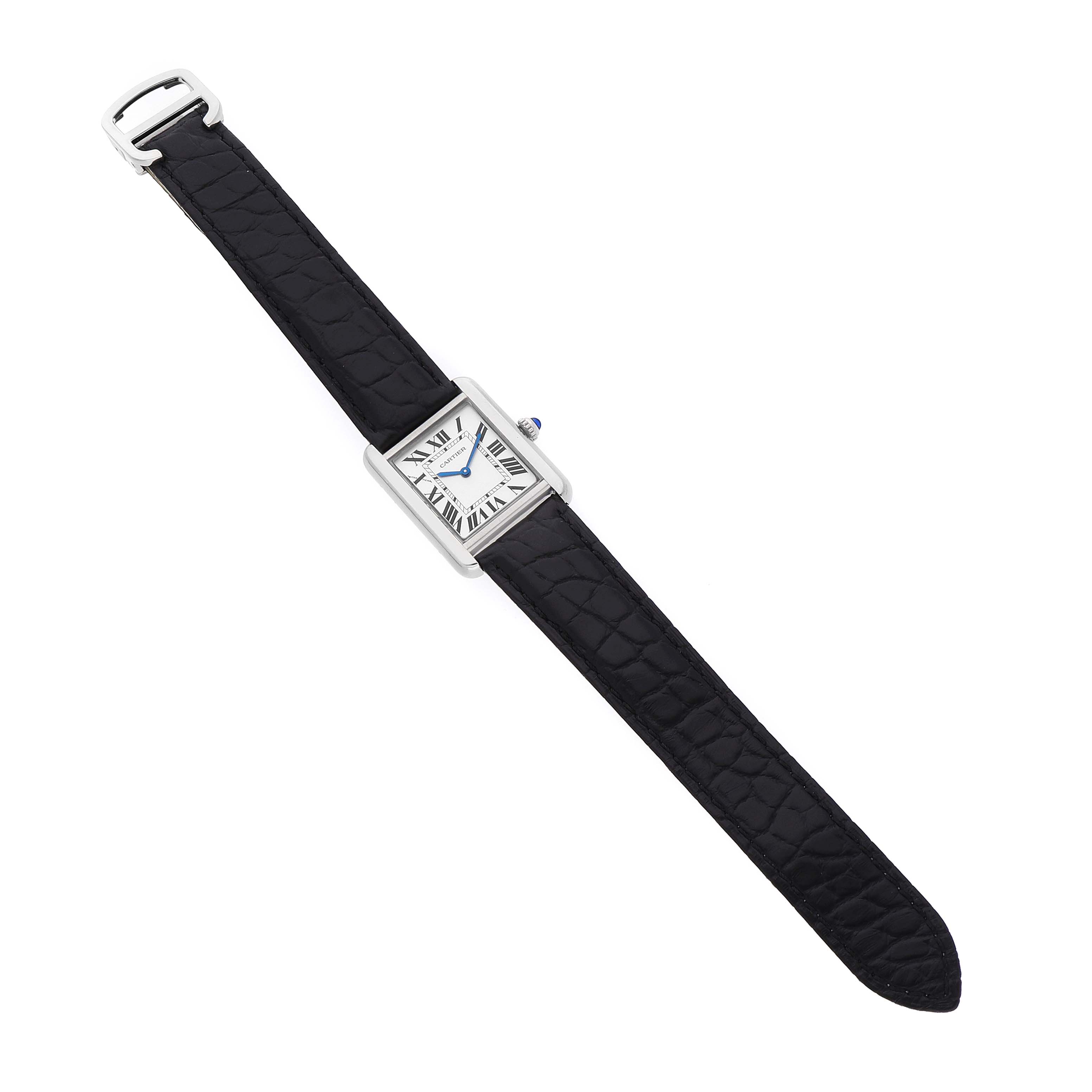 Cartier Tank Solo Small Steel Silver Roman Dial Ladies Watch WSTA0030. Quartz movement. Stainless steel case 31.0 x 24.4 mm. Circular grained crown set with the blue spinel cabochon. . Scratch resistant sapphire crystal. Silver opaline dial. Painted black roman numerals. Sword shaped blued steel hands. Secret Cartier signature at X. Green strap with the stainless steel deployant buckle.