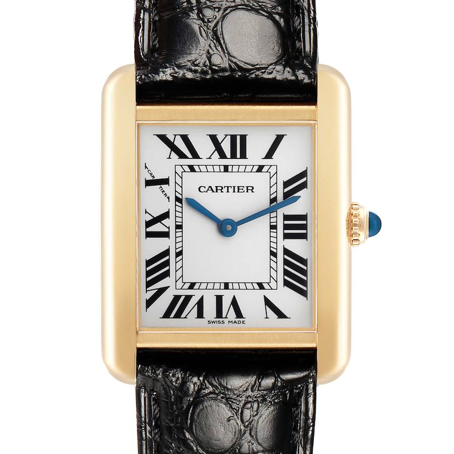 Cartier Tank Solo Small Yellow Gold Ladies Watch W1018755. Quartz movement. 18k yellow gold rectangular case 30.0 x 24.0 mm. Stainless steel caseback. Circular-grained crown set with a blue spinel cabochon. . Scratch-resistant sapphire crystal. Silver opaline dial with black radial Roman numeral hour markers and an inner minute track. Blued steel sword-shaped hands. Secret Cartier signature at X. Black leather strap with an 18k yellow gold tang buckle.