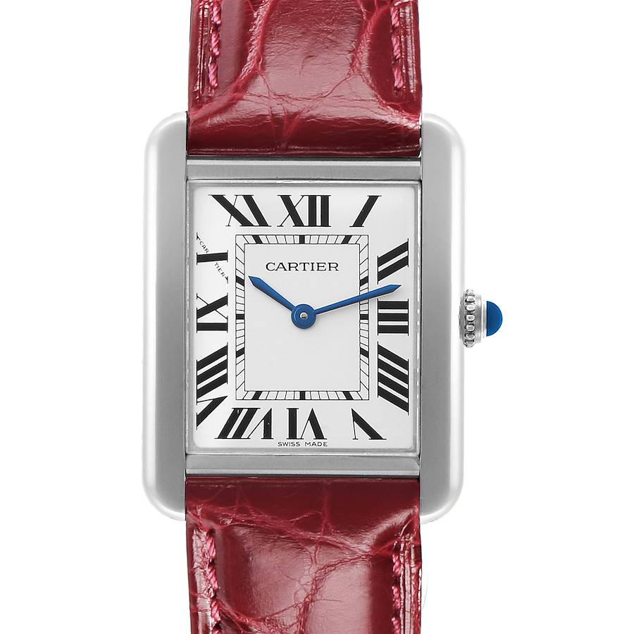 Cartier Tank Solo Steel Burgundy Strap Ladies Watch W5200005. Quartz movement. Stainless steel case 31.0 x 24.0 mm. Circular grained crown set with the blue spinel cabochon. . Scratch resistant sapphire crystal. Silver opaline dial with black Roman numerals. Sword shaped blued steel hands. Secret Cartier signature at X. Burgundy leather strap with stainless steel deployant clasp.