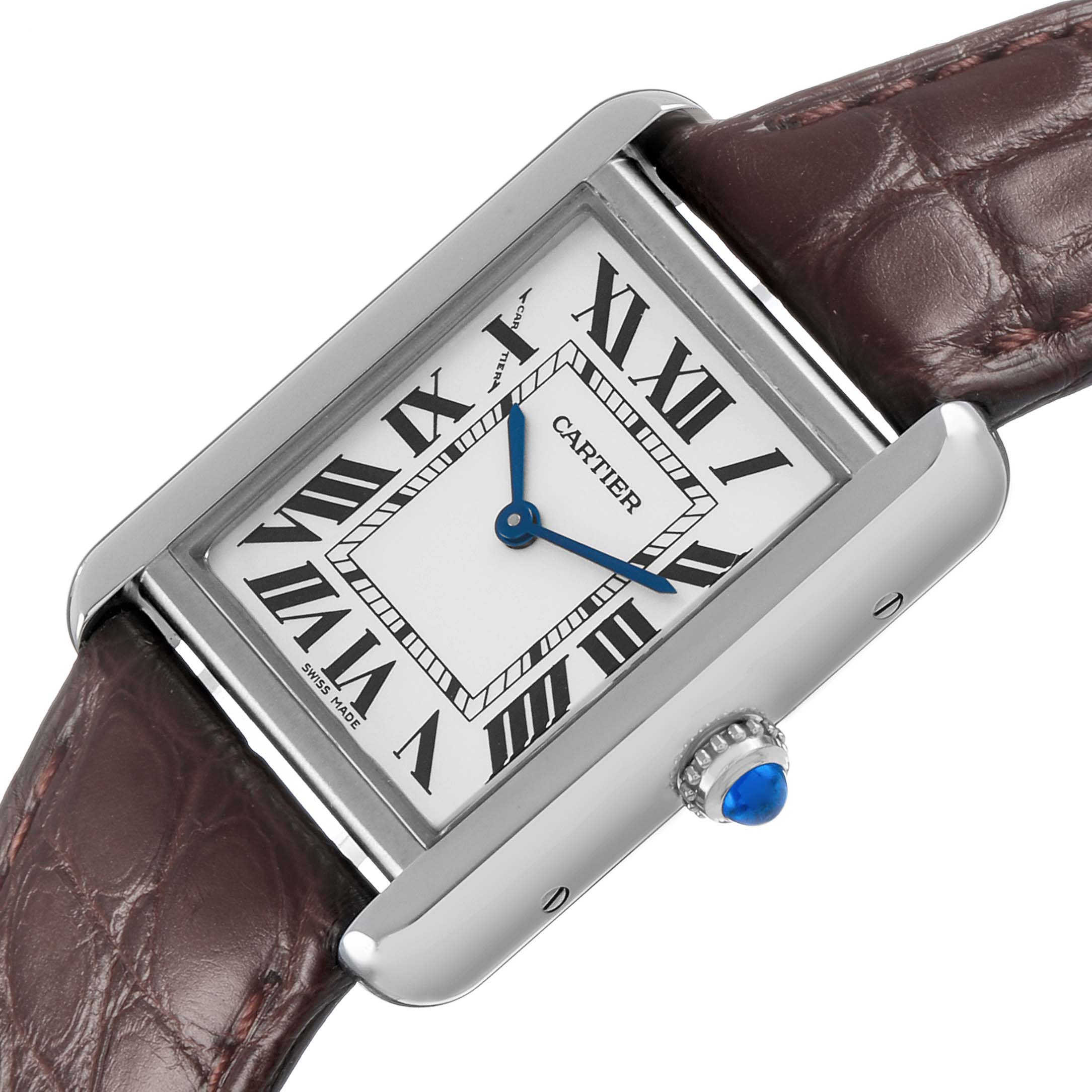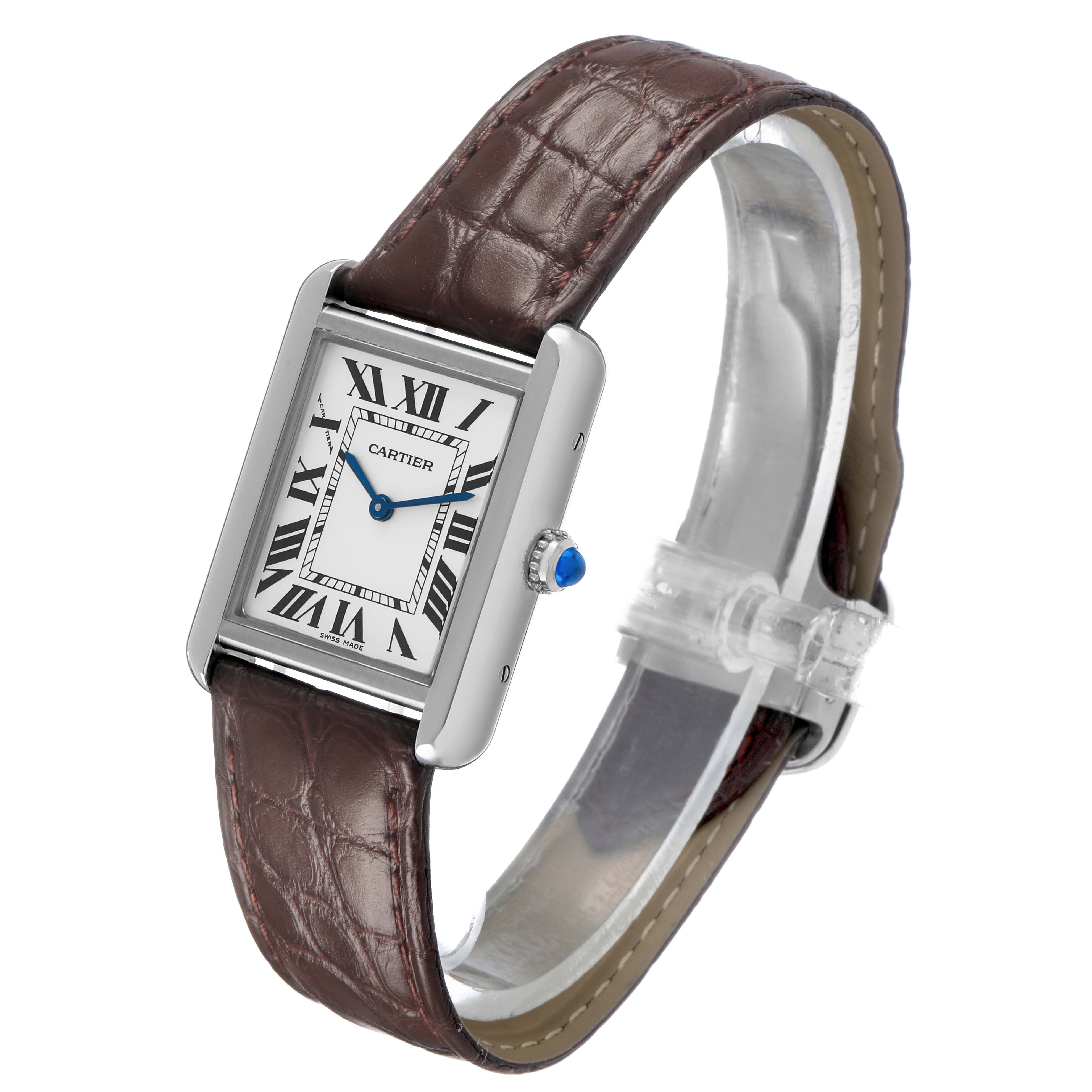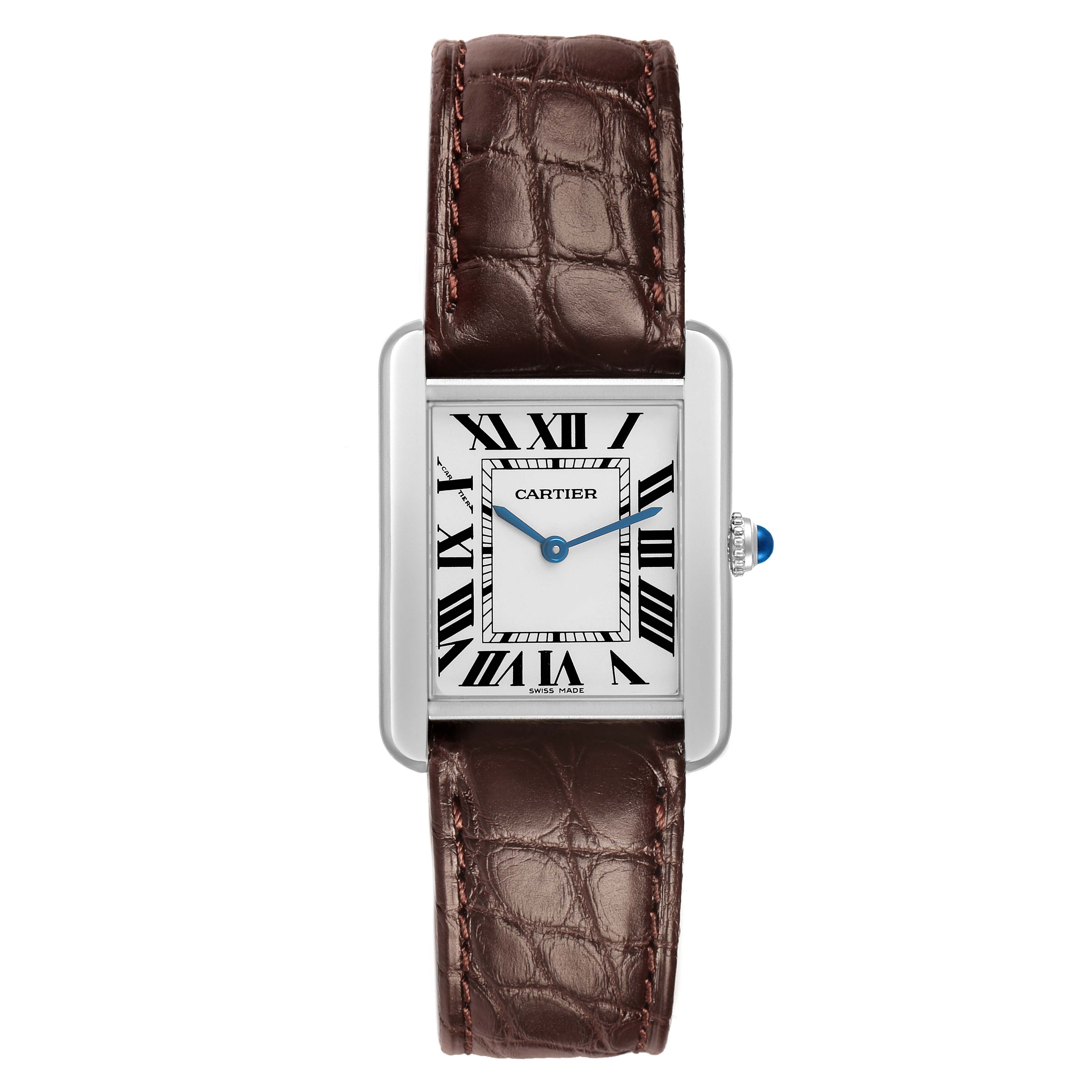 Cartier Tank Solo Steel Silver Dial Ladies Watch W5200005. Quartz movement. Stainless steel case 31.0 x 24.0 mm. Circular grained crown set with the blue spinel cabochon. . Scratch resistant sapphire crystal. Silver opaline dial with black Roman numerals. Sword shaped blue steel hands. Secret Cartier signature at X. Brown leather strap with stainless steel deployant clasp.