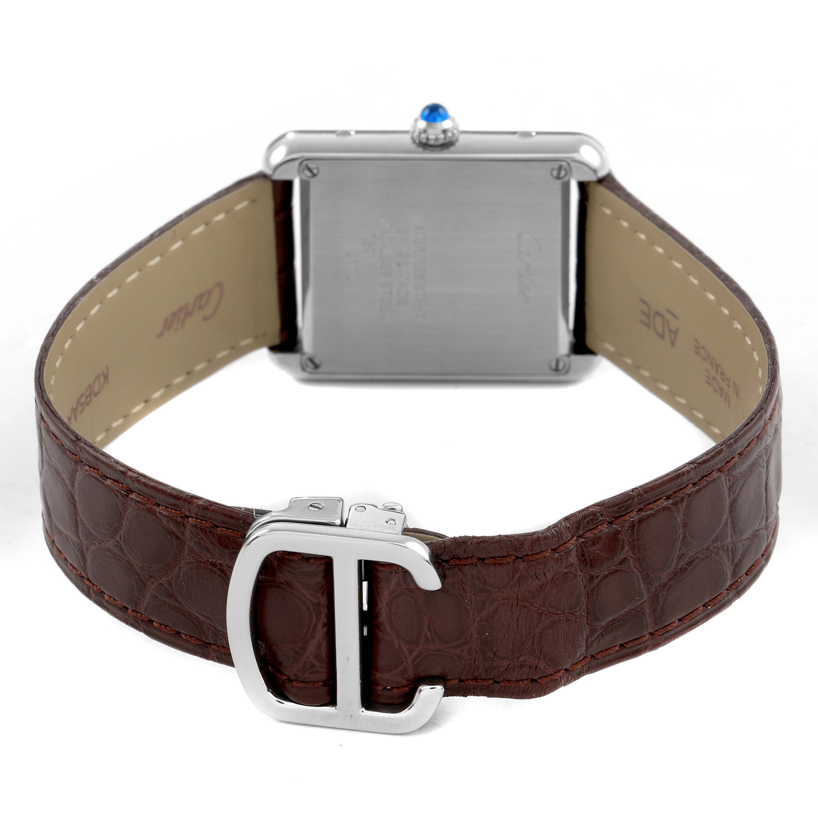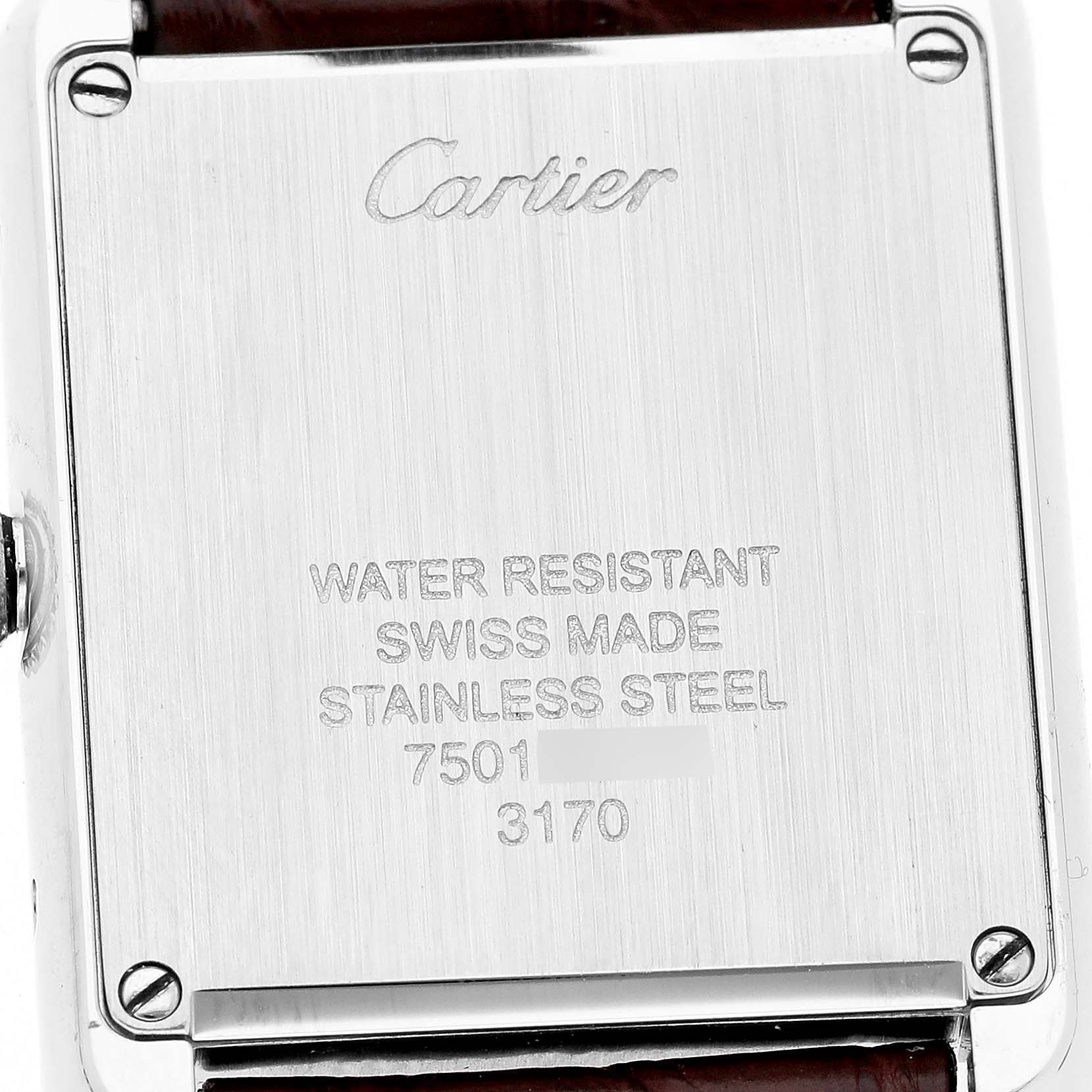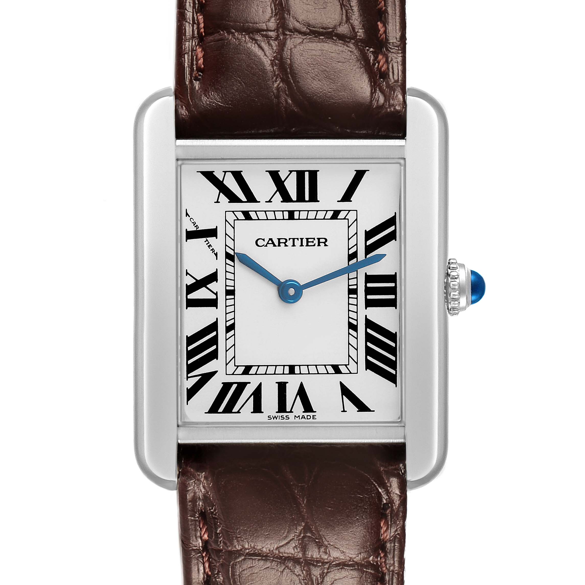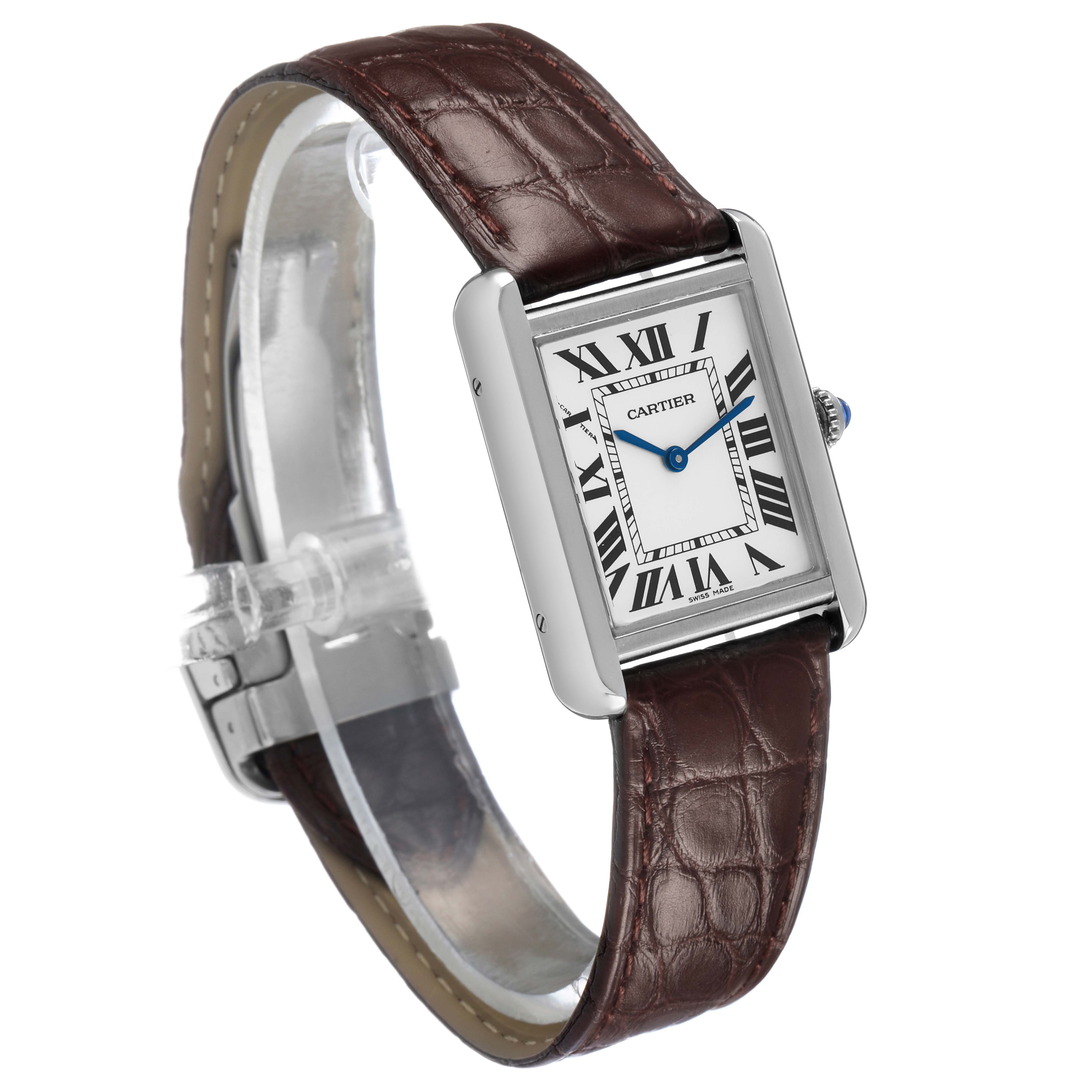 Cartier Tank Solo Steel Silver Dial Ladies Watch W5200005. Quartz movement. Stainless steel case 31.0 x 24.0 mm. Circular grained crown set with the blue spinel cabochon. . Scratch resistant sapphire crystal. Silver opaline dial with black Roman numerals. Sword shaped blue steel hands. Secret Cartier signature at X. Brown leather strap with stainless steel deployant clasp.