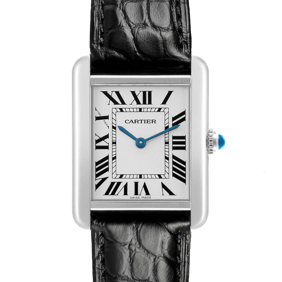 Cartier Tank Solo Steel Silver Roman Dial Ladies Watch W1018255. Quartz movement. Stainless steel rectangular case 30.0 x 23.0 mm. Circular grained crown set with the blue spinel cabochon. . Scratch resistant sapphire crystal. Silvered opaline dial with painted black Roman numeral hour markers and an inner minute track. Sword shaped blue hands. Secret Cartier signature at X. Black leather strap with a stainless steel folding clasp.