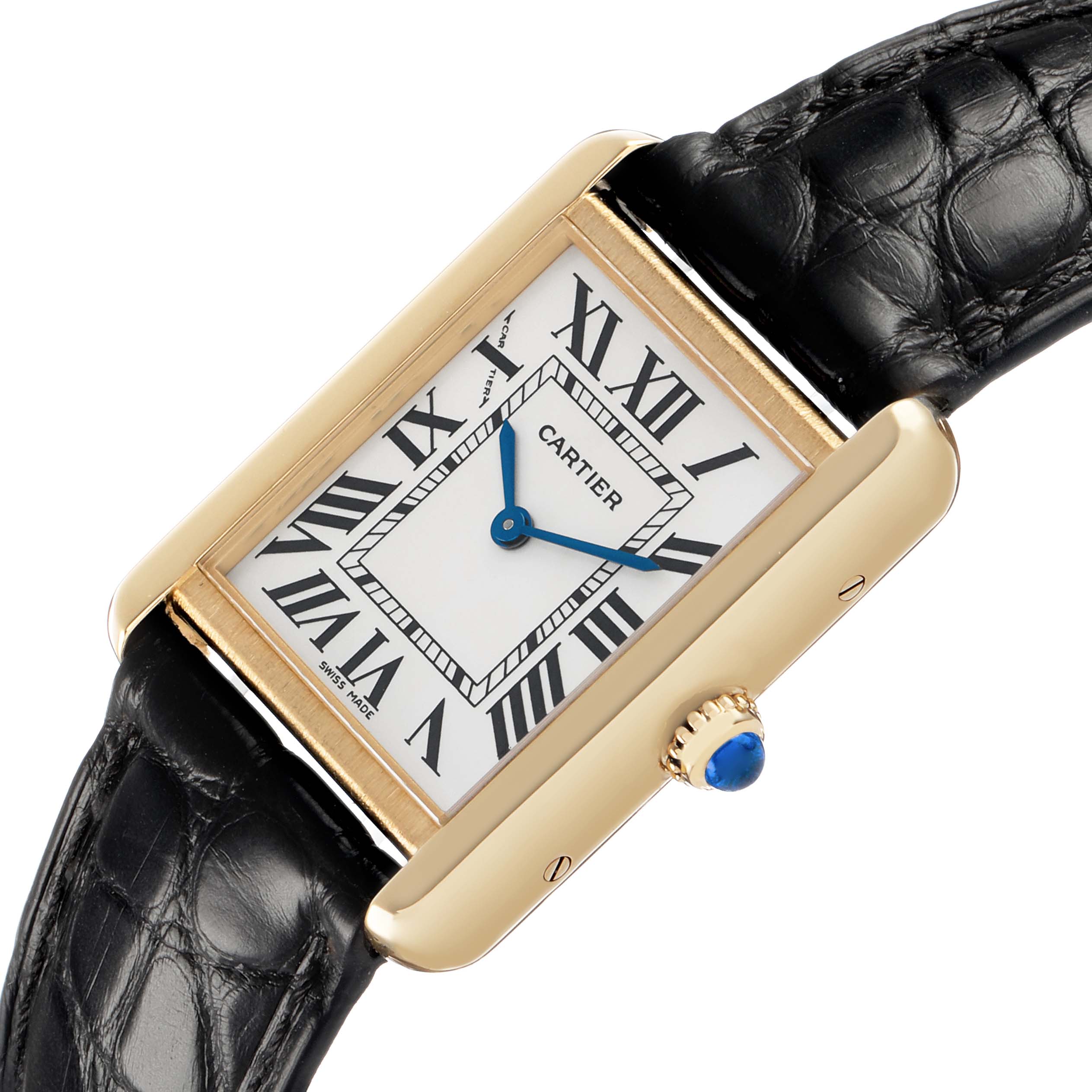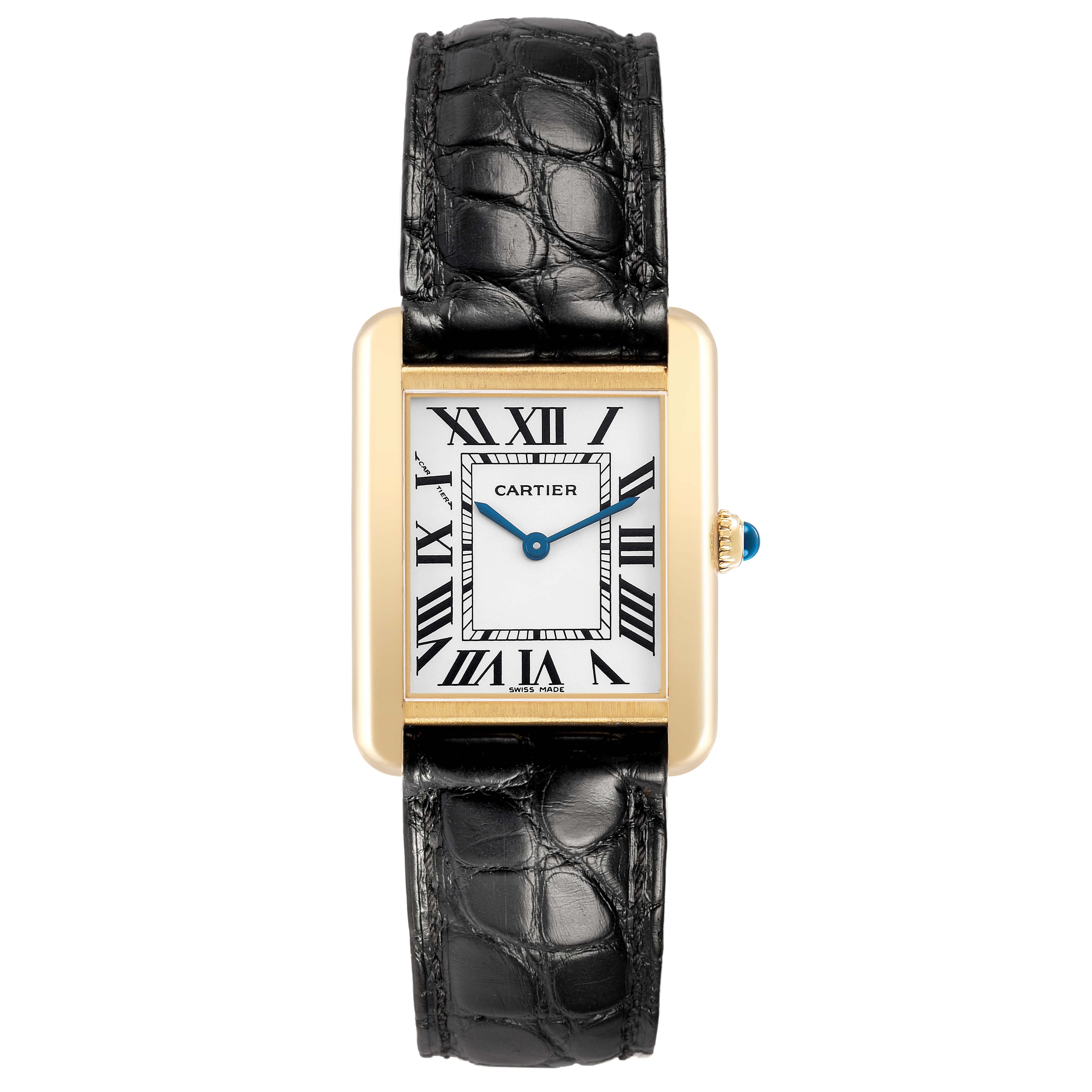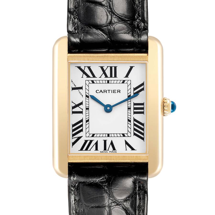 Cartier Tank Solo Yellow Gold Ladies Watch W1018755. Quartz movement. 18k yellow gold rectangular case 30.0 x 24.0 mm. Stainless steel caseback. Circular-grained crown set with a blue spinel cabochon. . Scratch-resistant sapphire crystal. Silver opaline dial with black radial Roman numeral hour markers and an inner minute track. Blued steel sword-shaped hands. Secret Cartier signature at X. Black leather strap with an 18k yellow gold tang buckle.