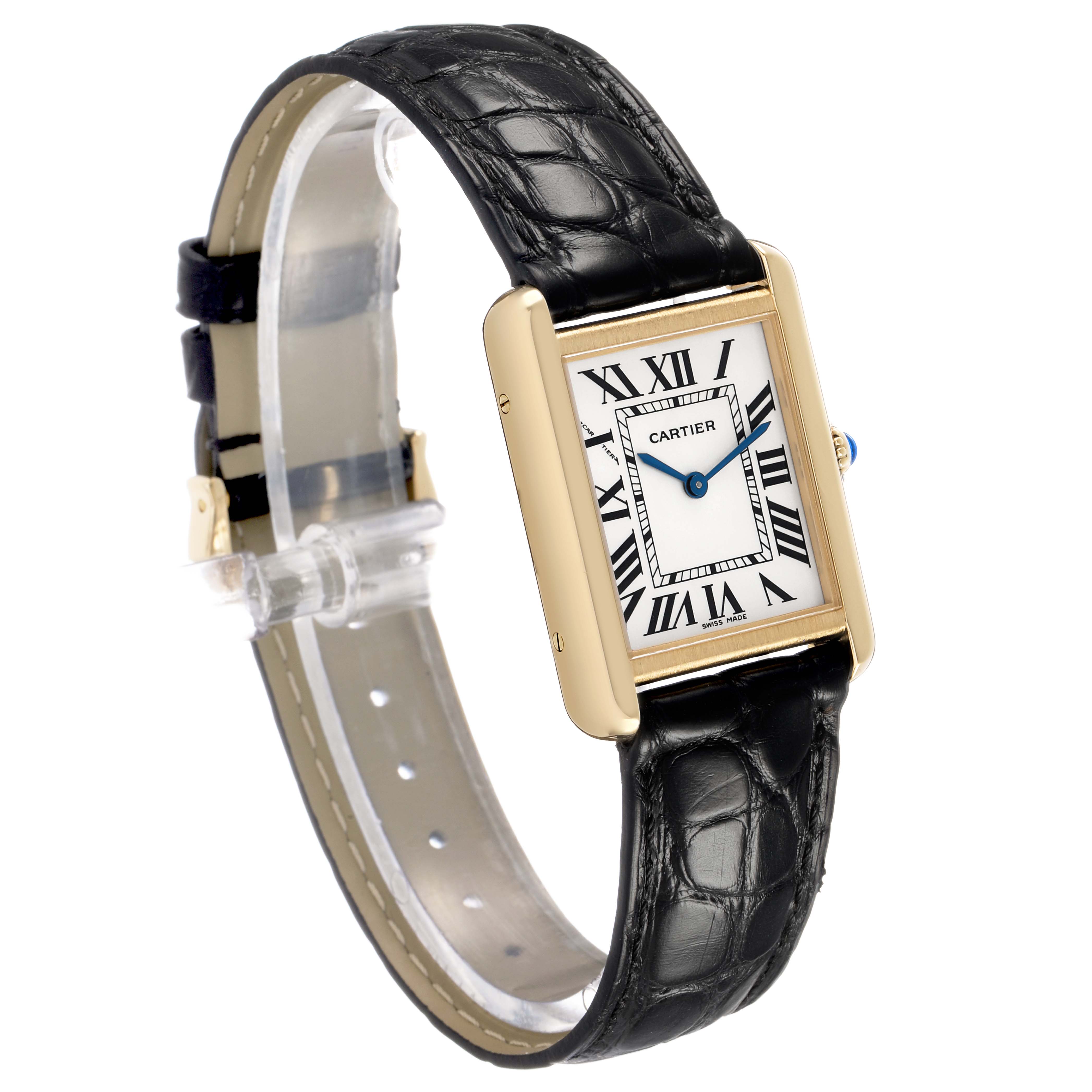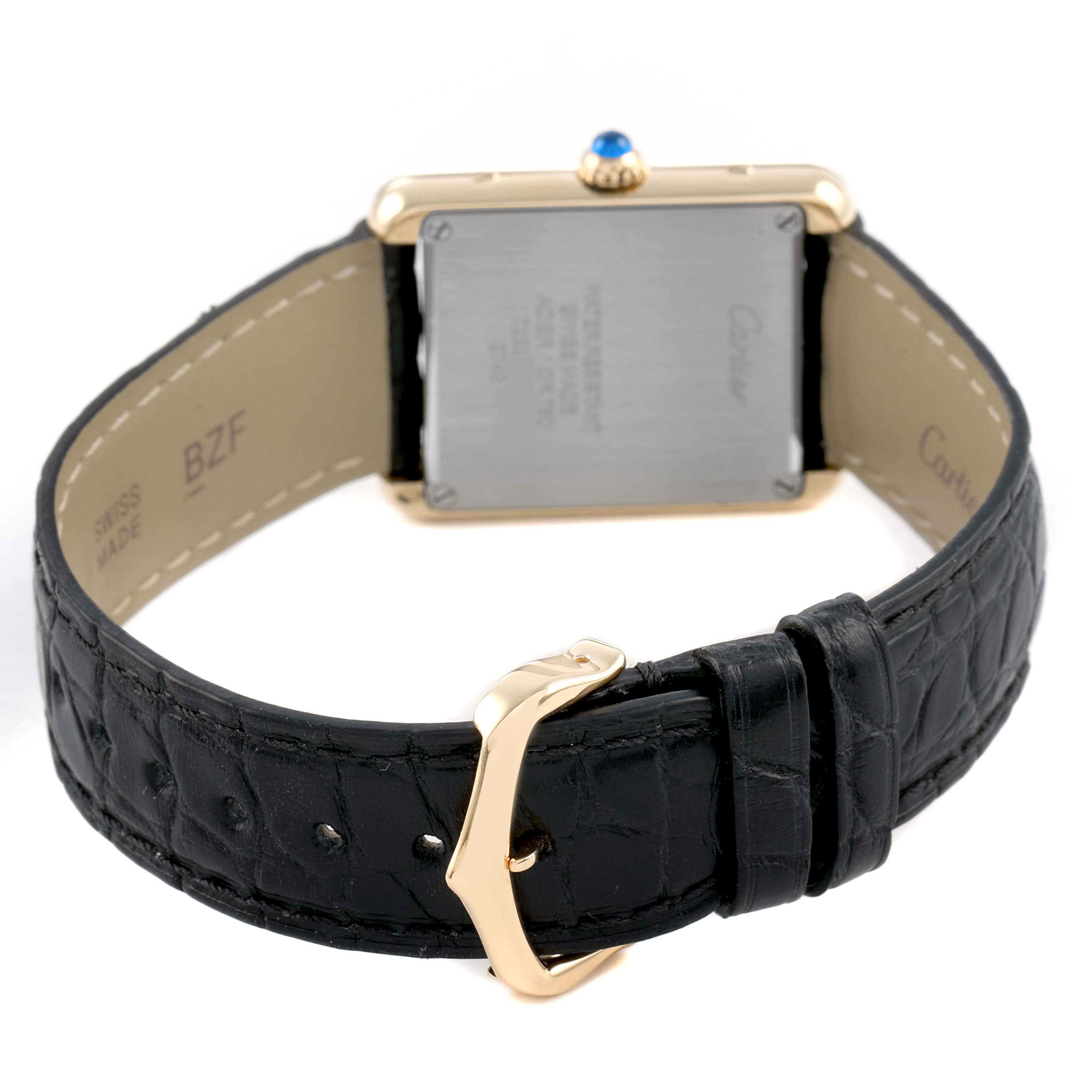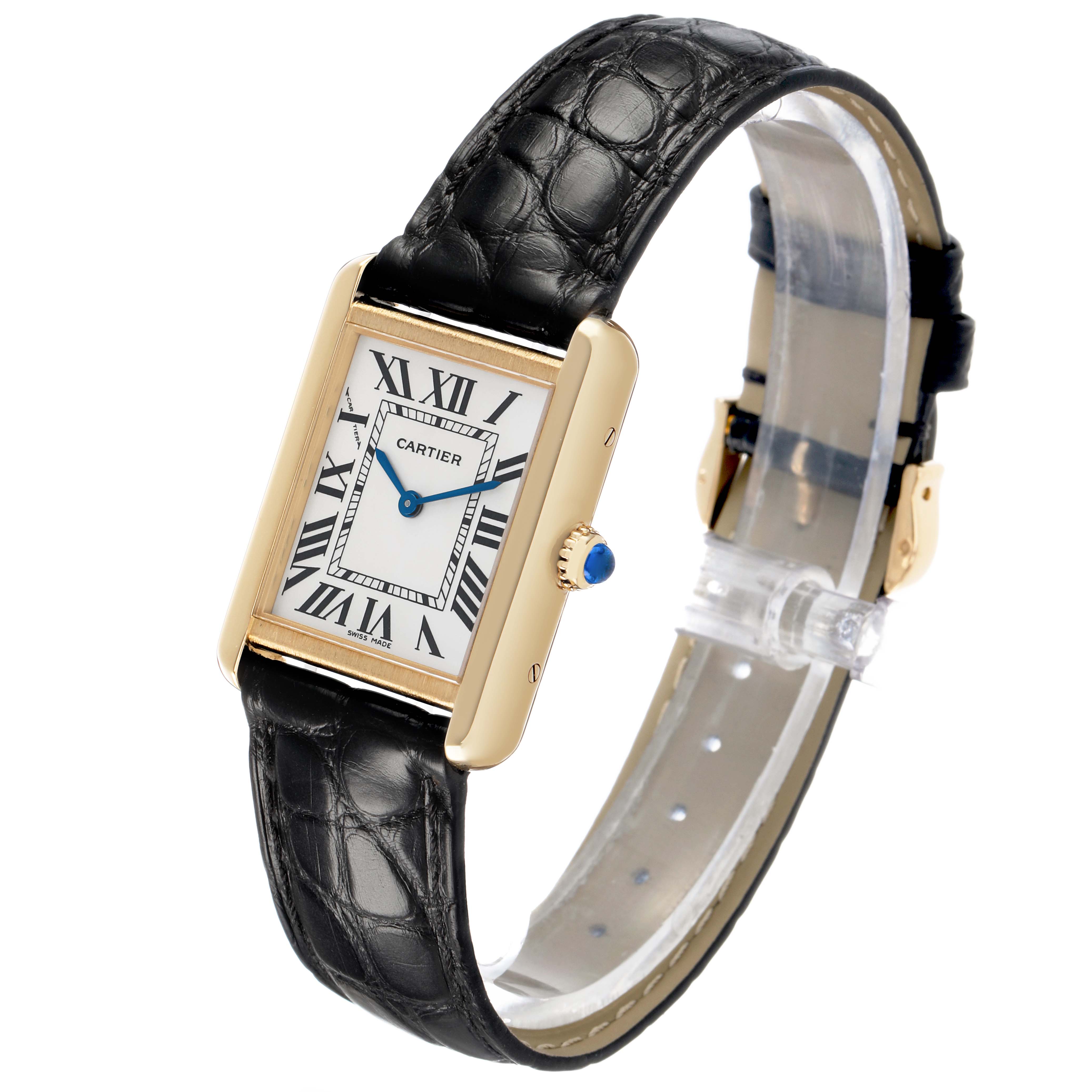 Cartier Tank Solo Yellow Gold Ladies Watch W1018755. Quartz movement. 18k yellow gold rectangular case 30.0 x 24.0 mm. Stainless steel caseback. Circular-grained crown set with a blue spinel cabochon. . Scratch-resistant sapphire crystal. Silver opaline dial with black radial Roman numeral hour markers and an inner minute track. Blued steel sword-shaped hands. Secret Cartier signature at X. Black leather strap with an 18k yellow gold tang buckle.