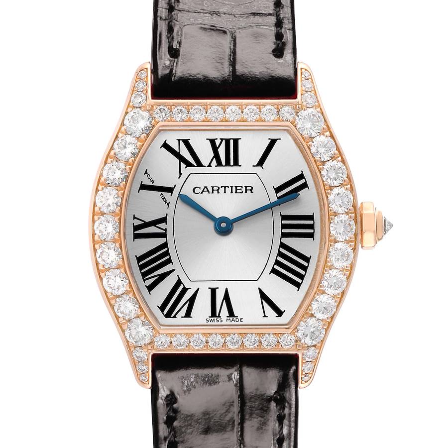 Cartier Tortue Rose Gold Diamond Bezel Ladies Watch WA507031 Box Card. Manual winding movement. 18K rose gold case 28 mm x 34 mm. Octagonal crown set with an original Cartier factory diamond. Original Cartier factory diamond bezel and lugs. Exhibition transparent sapphire crystal caseback. 18k rose gold original Cartier factory diamond bezel. Scratch resistant sapphire crystal. Silver sunray dial with Roman numerals. Blued steel sword shape hands. Secret signature at X. Black leather strap with 18K rose gold deployant clasp.