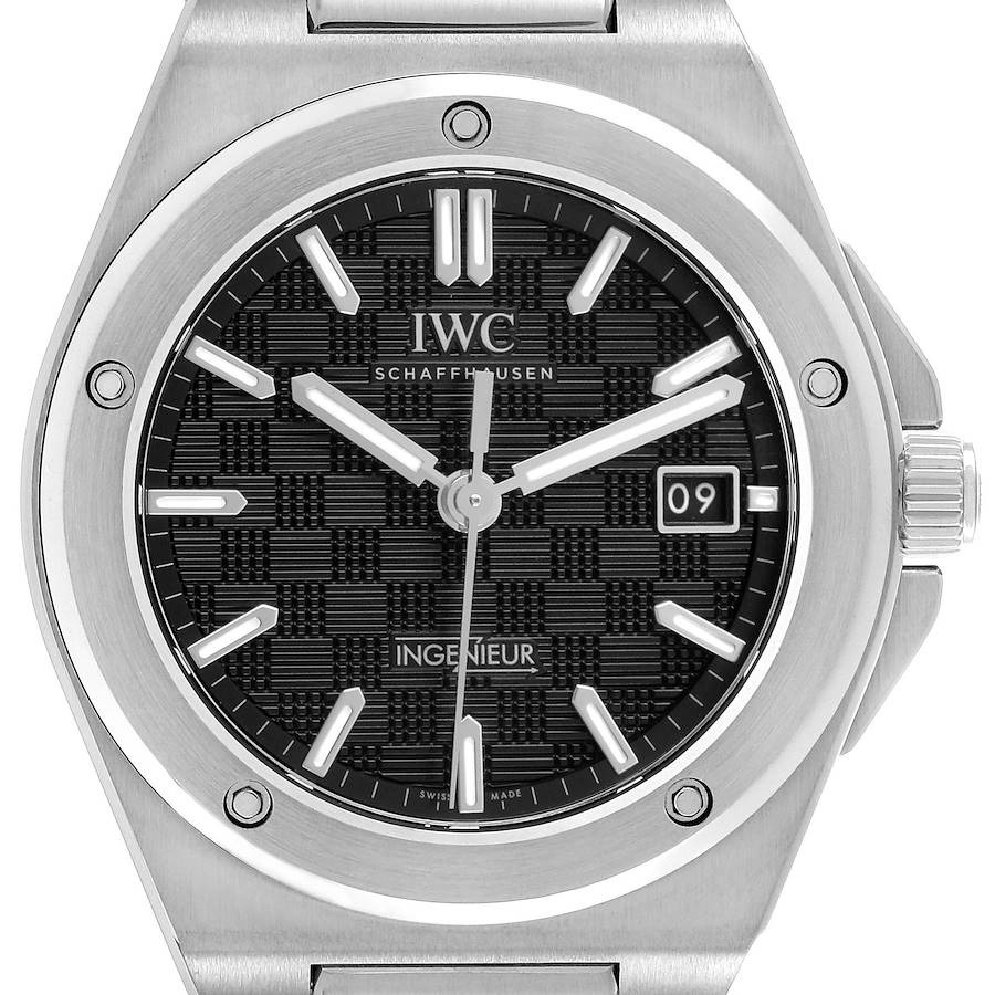 IWC Ingenieur 40 Steel Black Dial Mens Watch IW328901 Box Card. IWC Automatic self-winding movement with 163 components and a 120 hour power reserve. Stainless steel round case 40.0 mm in diameter. IWC logo on the protected screw-down crown. Stainless steel smooth bezel secured with 5 screws. Scratch resistant anti reflective sapphire crystal. Black guilloche dial with luminescent hands and index hour markers. Minute markers around the chapter ring. Stainless steel bracelet with a double push-button butterfly clasp. Fits a 7 3/4" wrist.