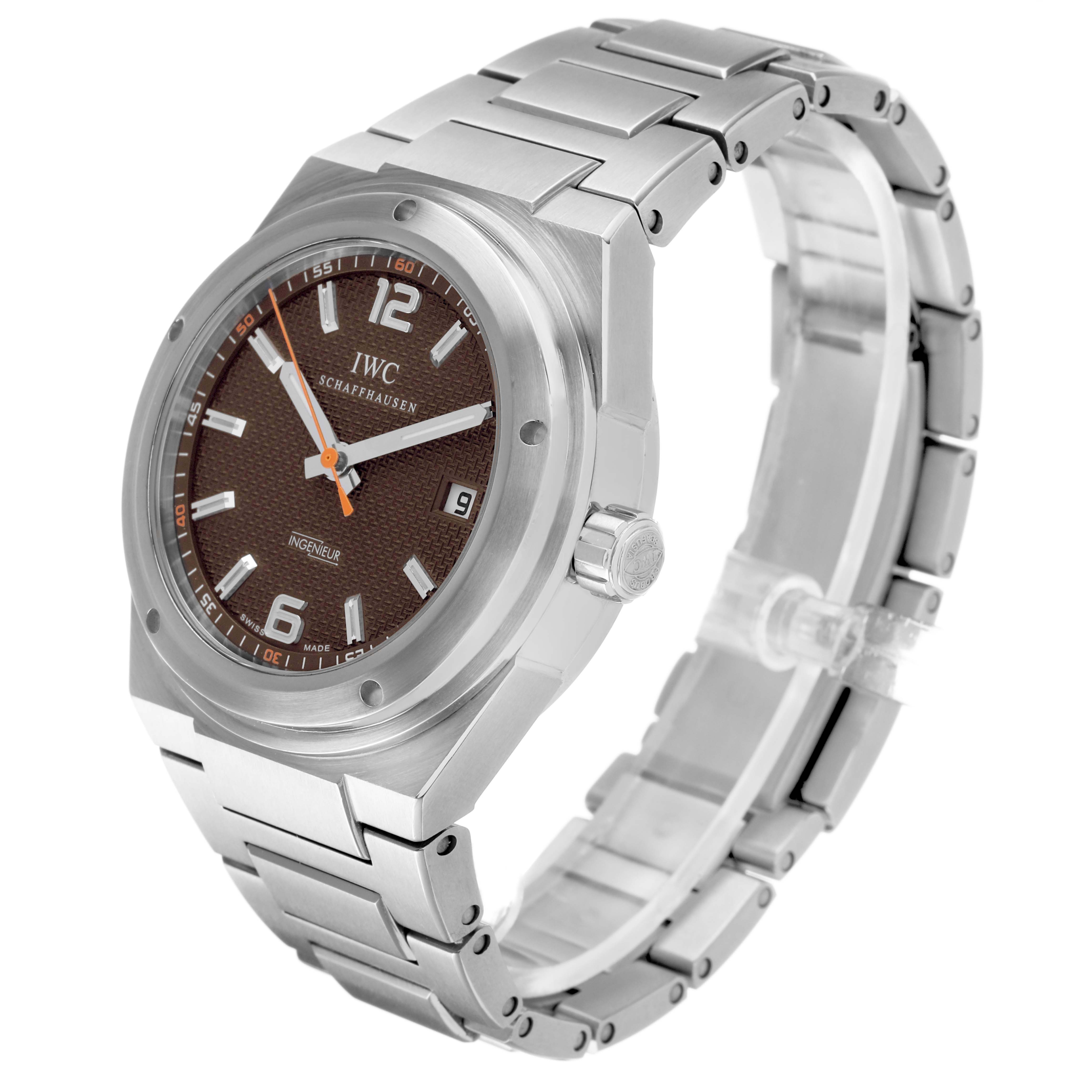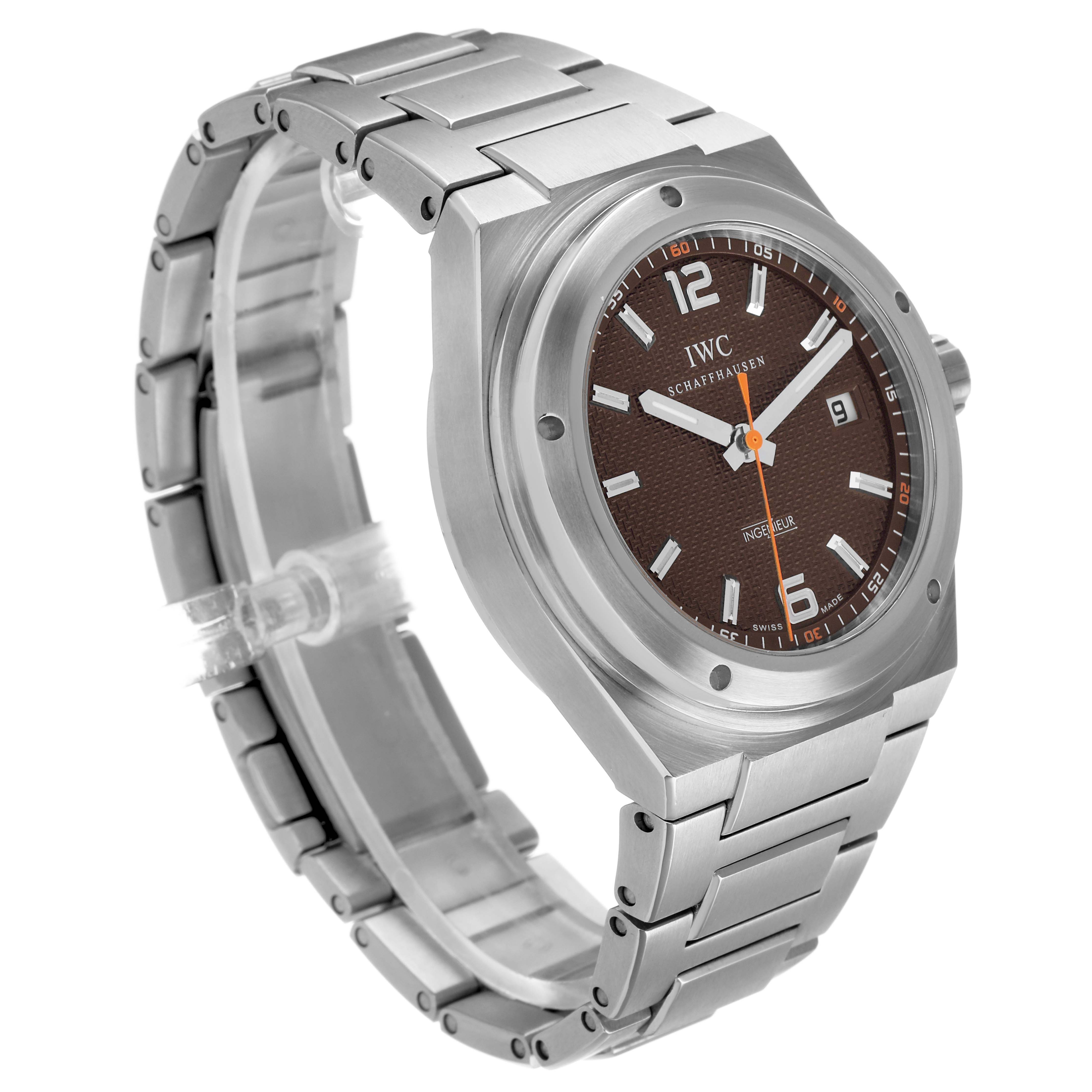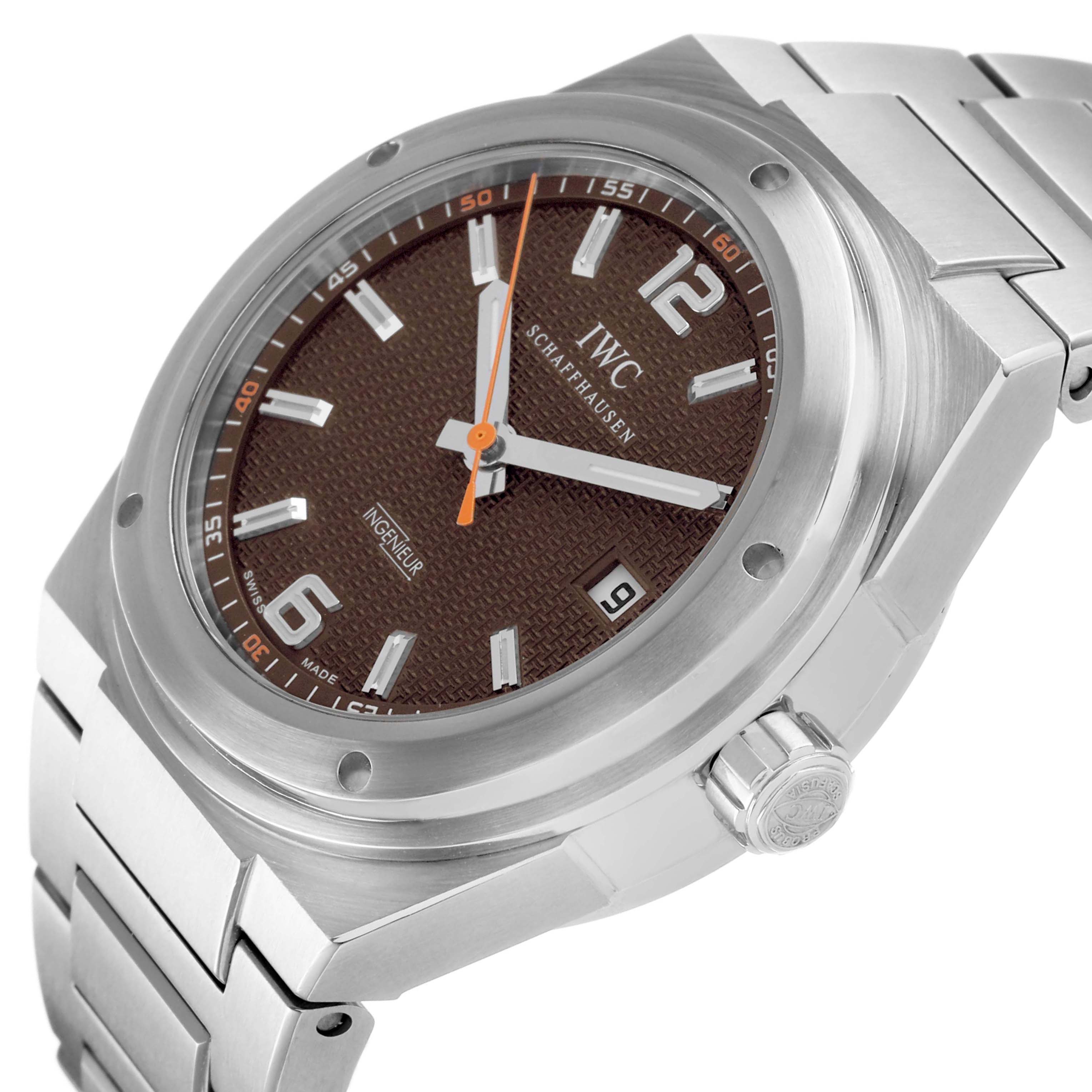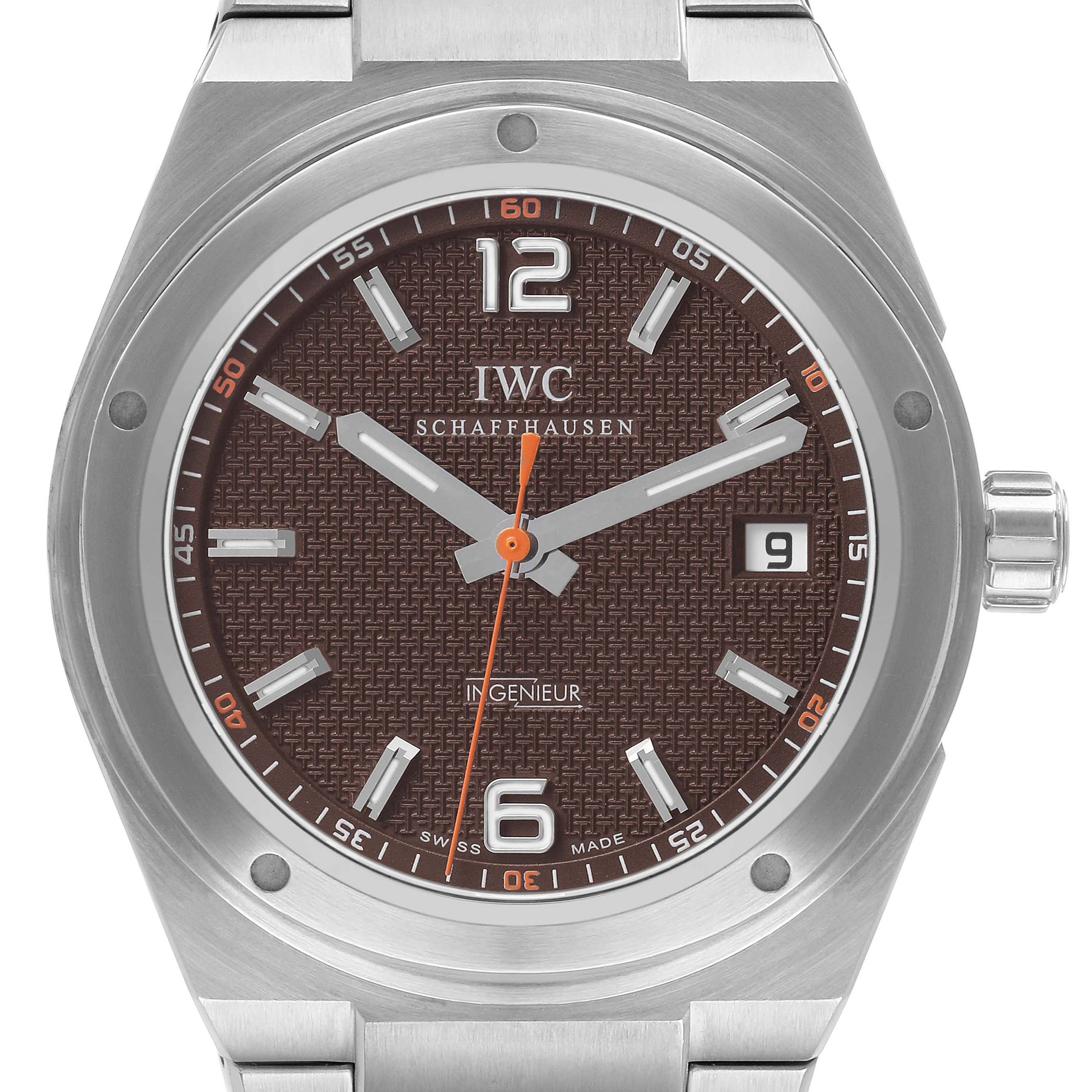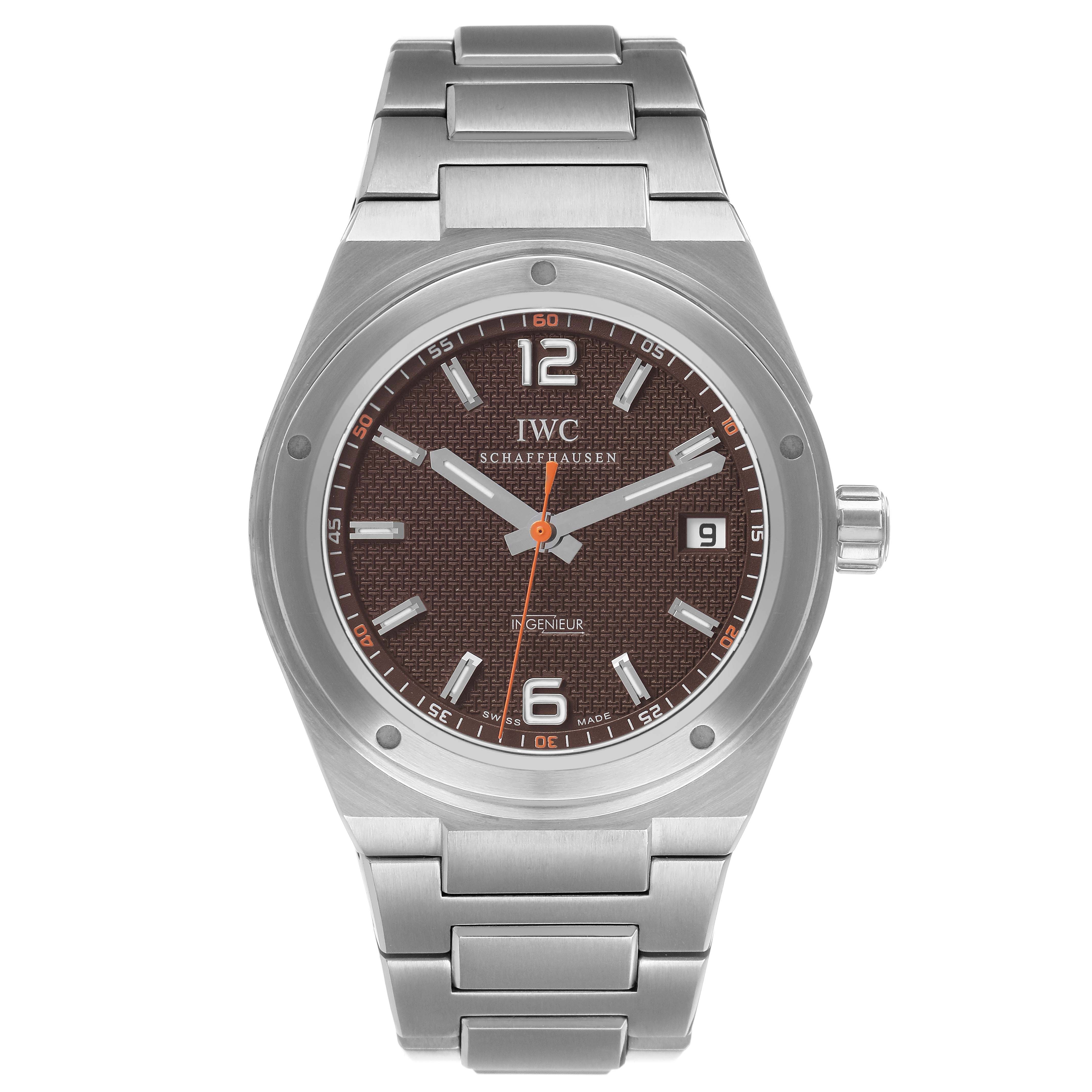 IWC Ingenieur Ken Noguchi Limited Edition Steel Brown Dial Men's Watch IW322712. Automatic self-winding movement. Stainless steel case 40 mm in diameter. "Ken Noguchi & IWC For Sherpa Fund 168 / 200" engraved on the screwdown caseback. Limited edition. . Scratch resistant anti-reflective sapphire crystal. Brown dial with luminous hands and index hour markers. Minute markers around outer rim. Date window at 3 o'clock aperture. Orange running seconds hand at center. Stainless steel bracelet with push-button fold over clasp. Fits a 7" wrist.