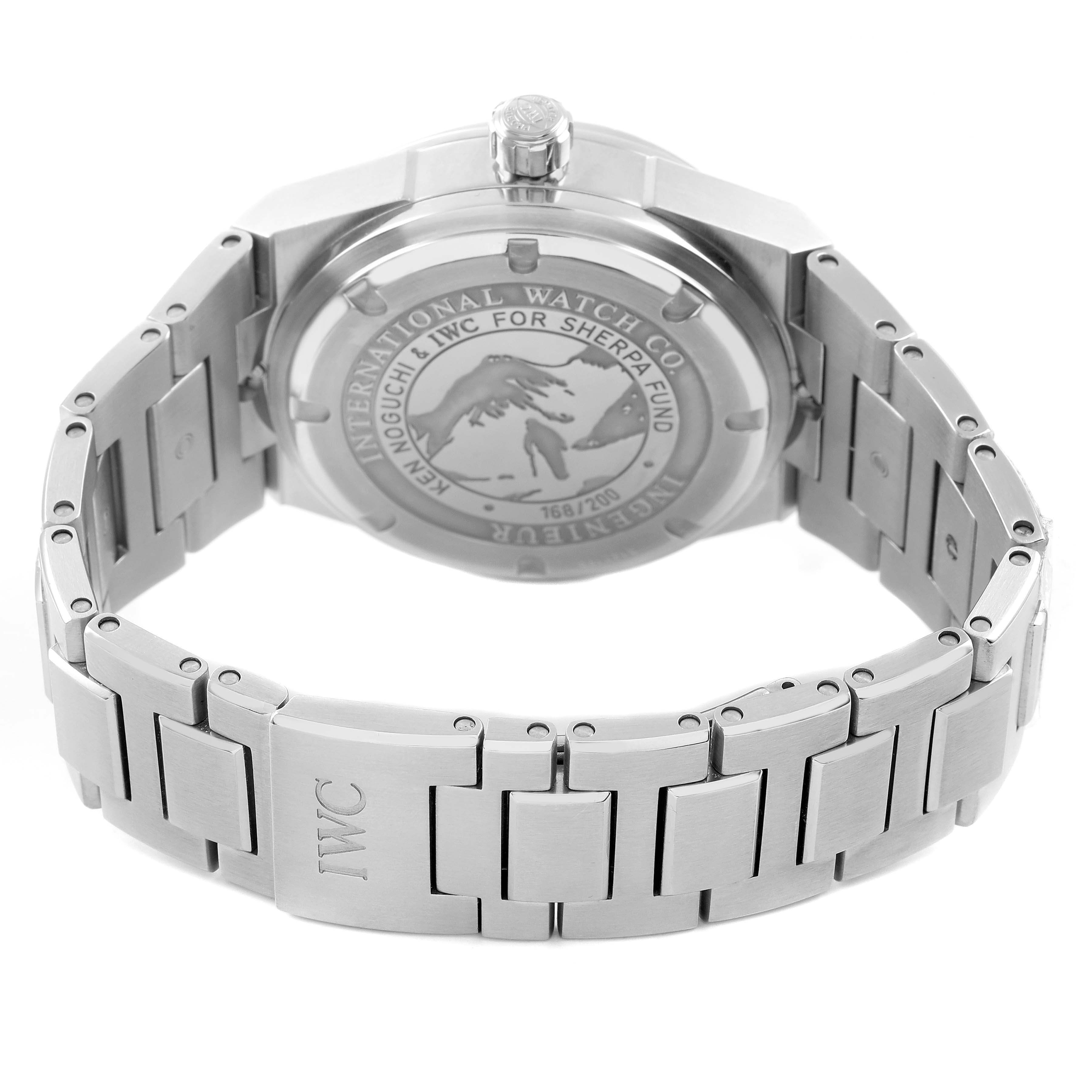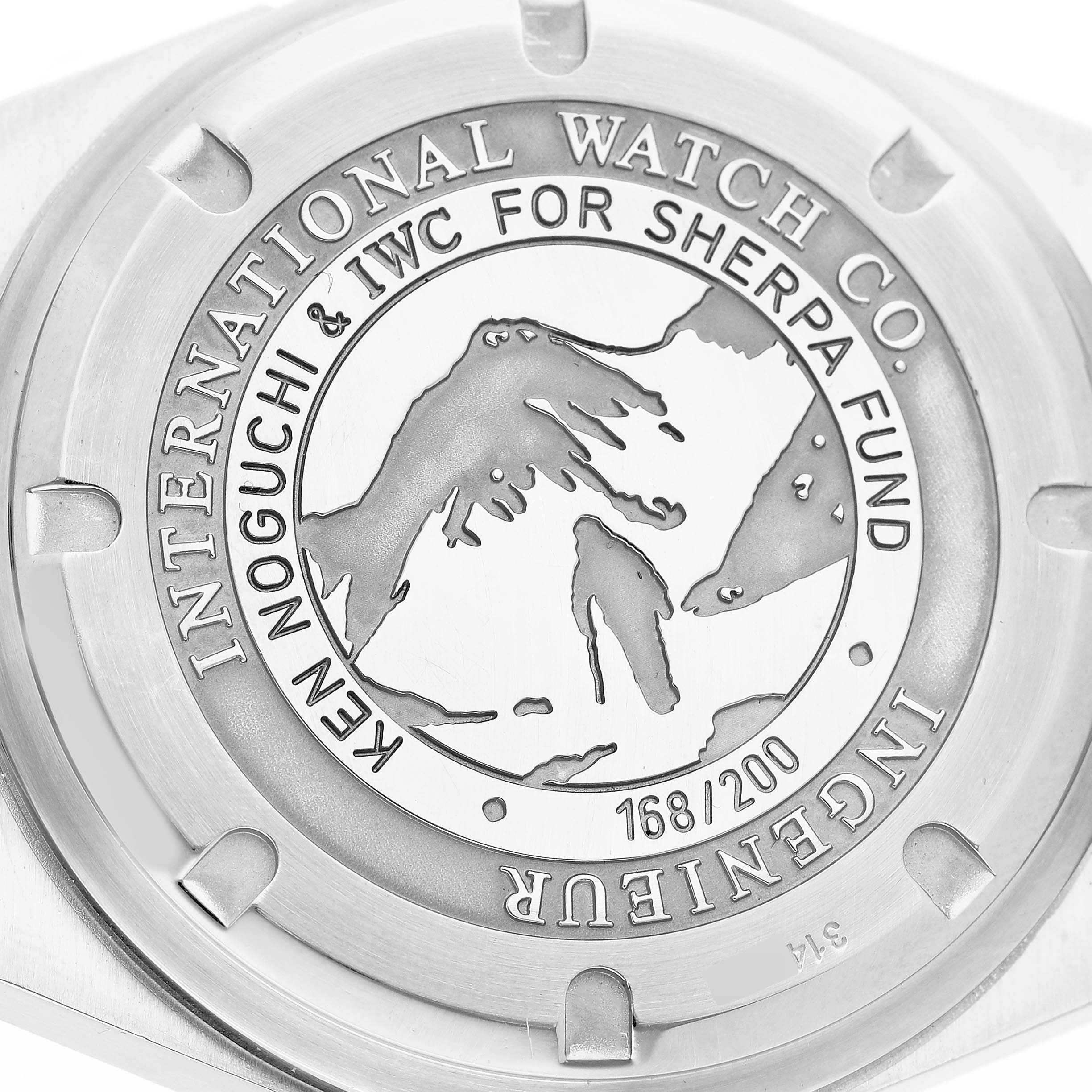 | Case: | Stainless steel case 40 mm in diameter. "Ken Noguchi & IWC For Sherpa Fund 168 / 200" engraved on the screwdown caseback. Limited edition. |