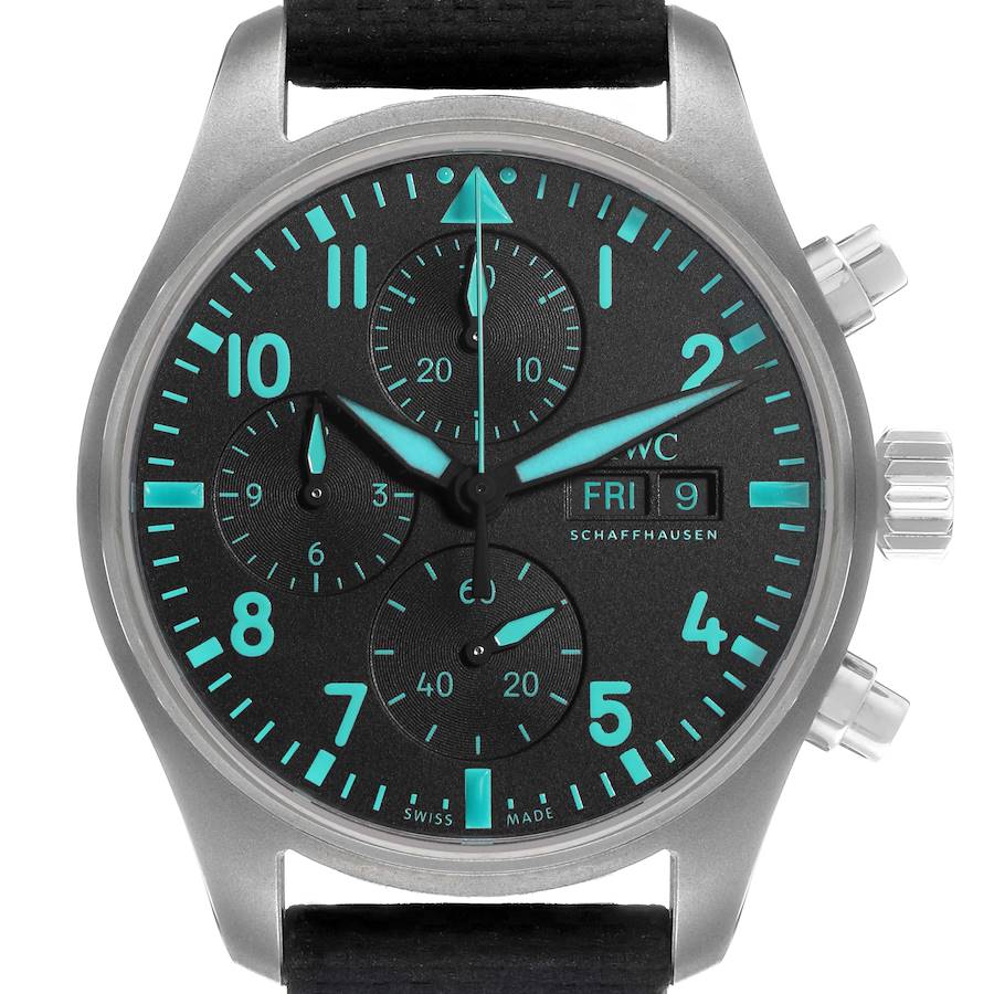 IWC Pilot Flieger Chronograph Day Date Automatic Watch IW370607. Automatic self-winding chronograph movement. Titanium case 41.0 mm in diameter. Titanium bezel. Scratch resistant sapphire crystal. Matte black dial with luminescent hands and Arabic numerals. Day and date aperture at 3 o'clock. Three chronograph sub-dials -- 60-second, 30-minute, and 12-hour. Black leather strap with tang buckle.