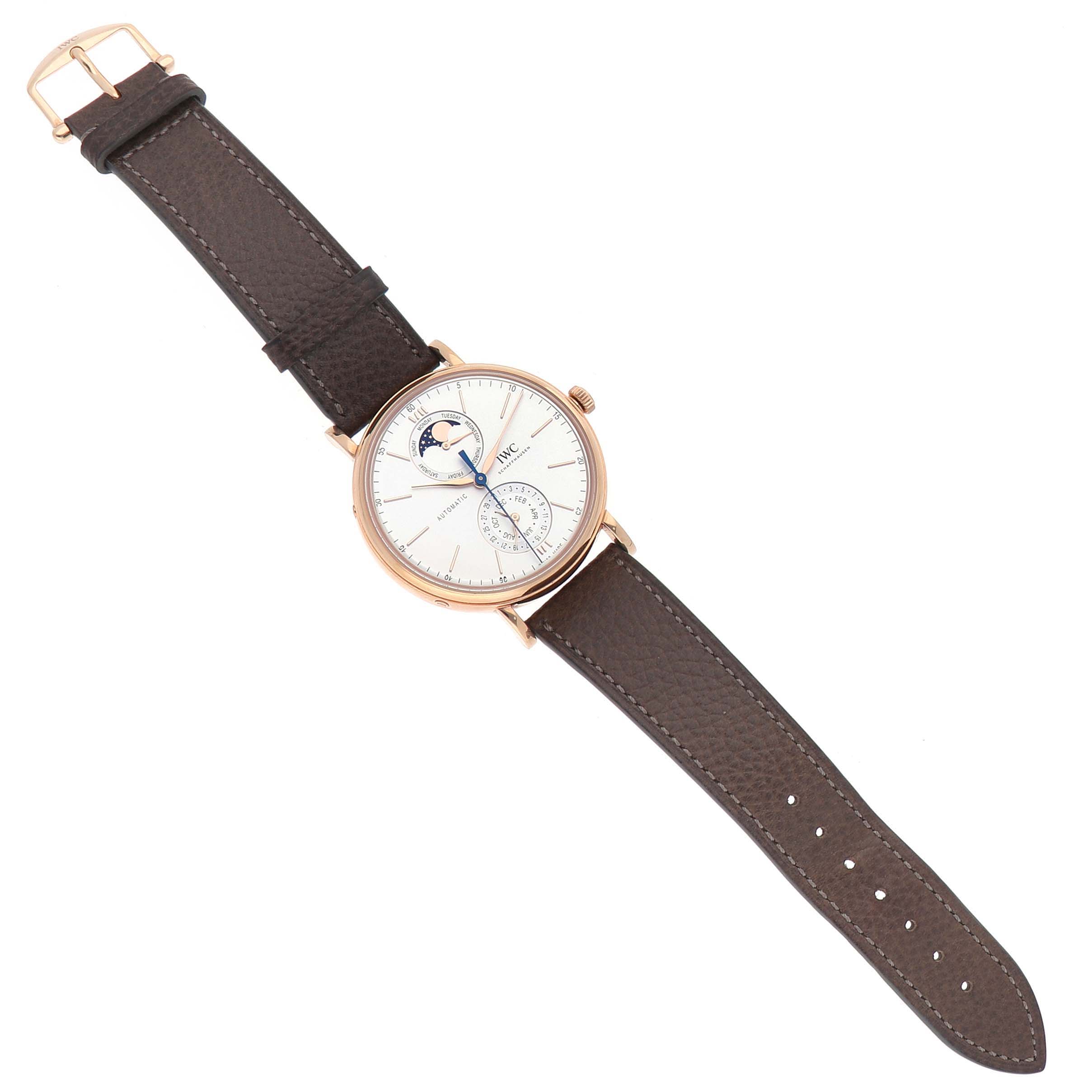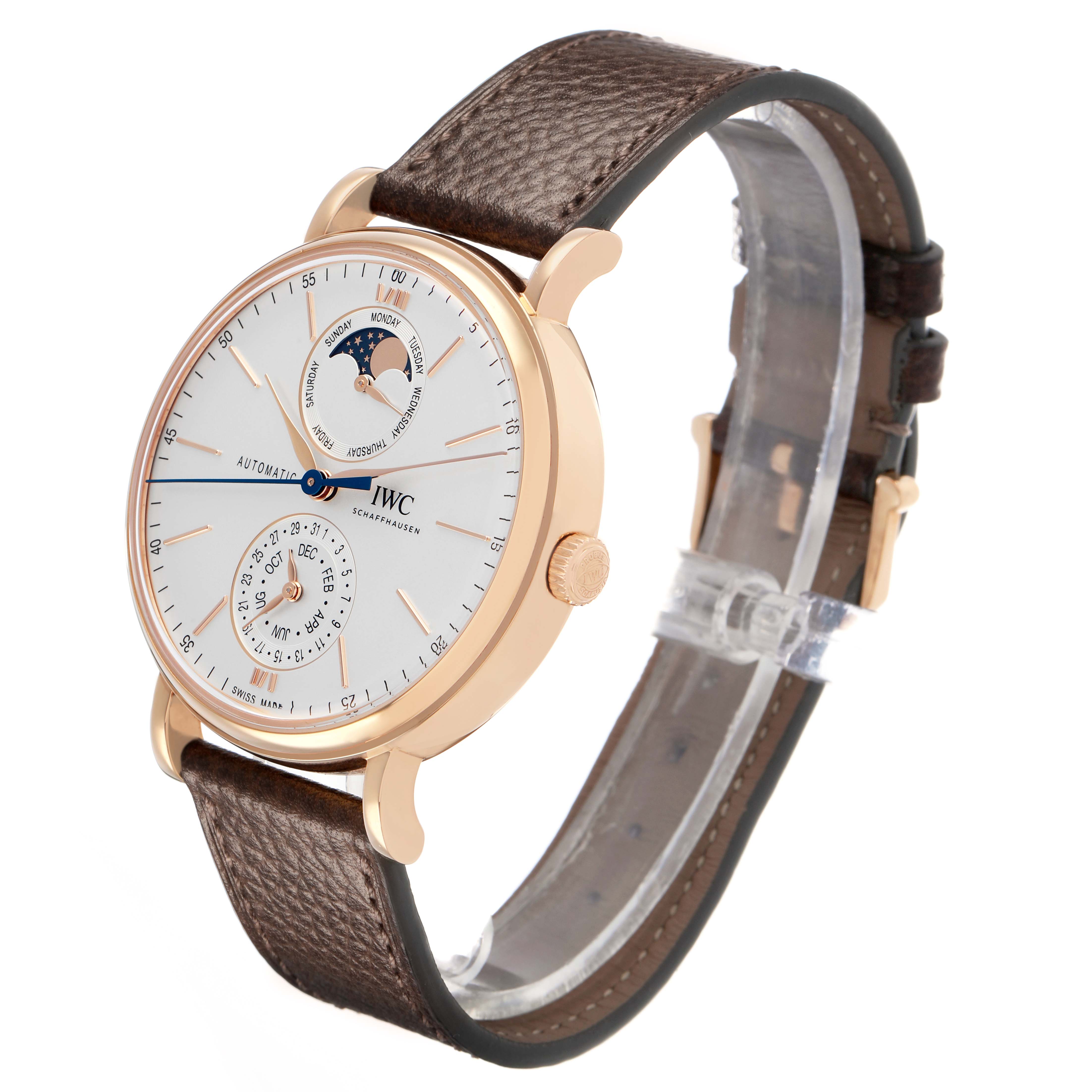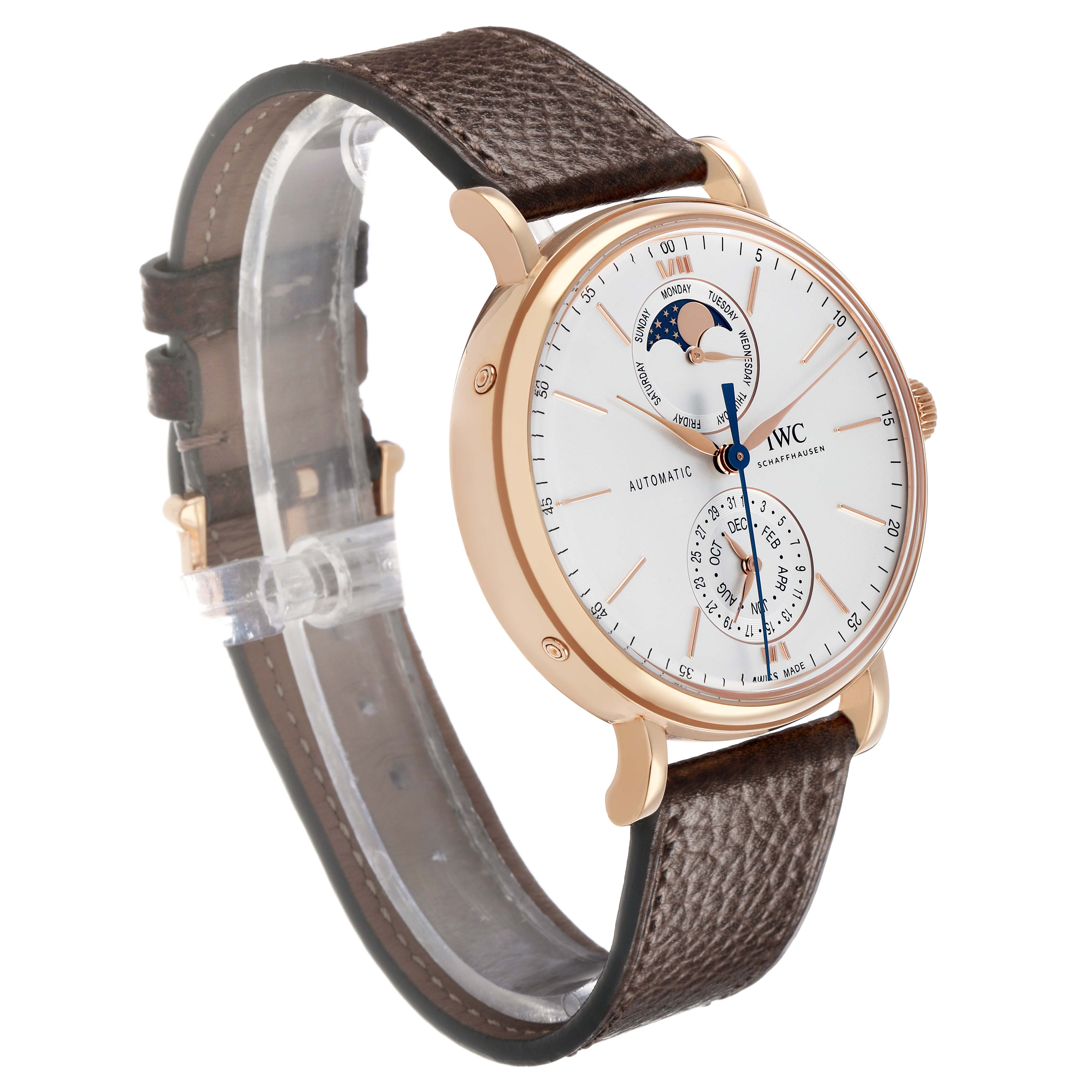 IWC Portofino Complete Calendar Rose Gold Silver Dial IW359002 Box Card. Automatic winding movement. 18k rose gold case 41 mm in diameter. Exhibition transparent sapphire crystal caseback. 18k rose gold smooth bezel. Sapphire glass, convex, antireflective coating on both sides. Silver dial with rose gold baton hour markers. Day of the week and moonphase display at 12. Date and month display at 6. Leaf shaped hands. Central running seconds hand. Minute markers around the outer rim. Dark brown leather strap with an 18k rose gold tang buckle.
