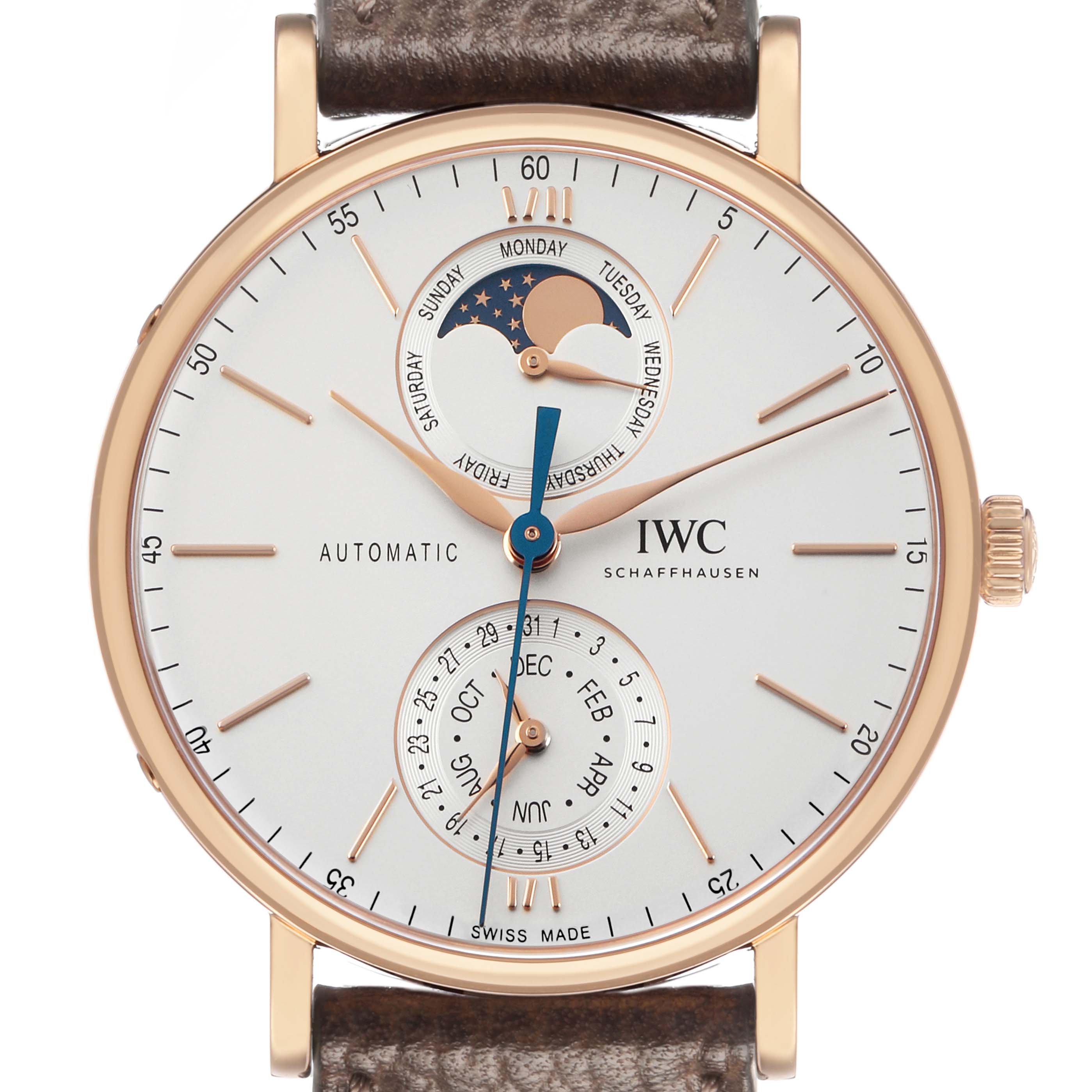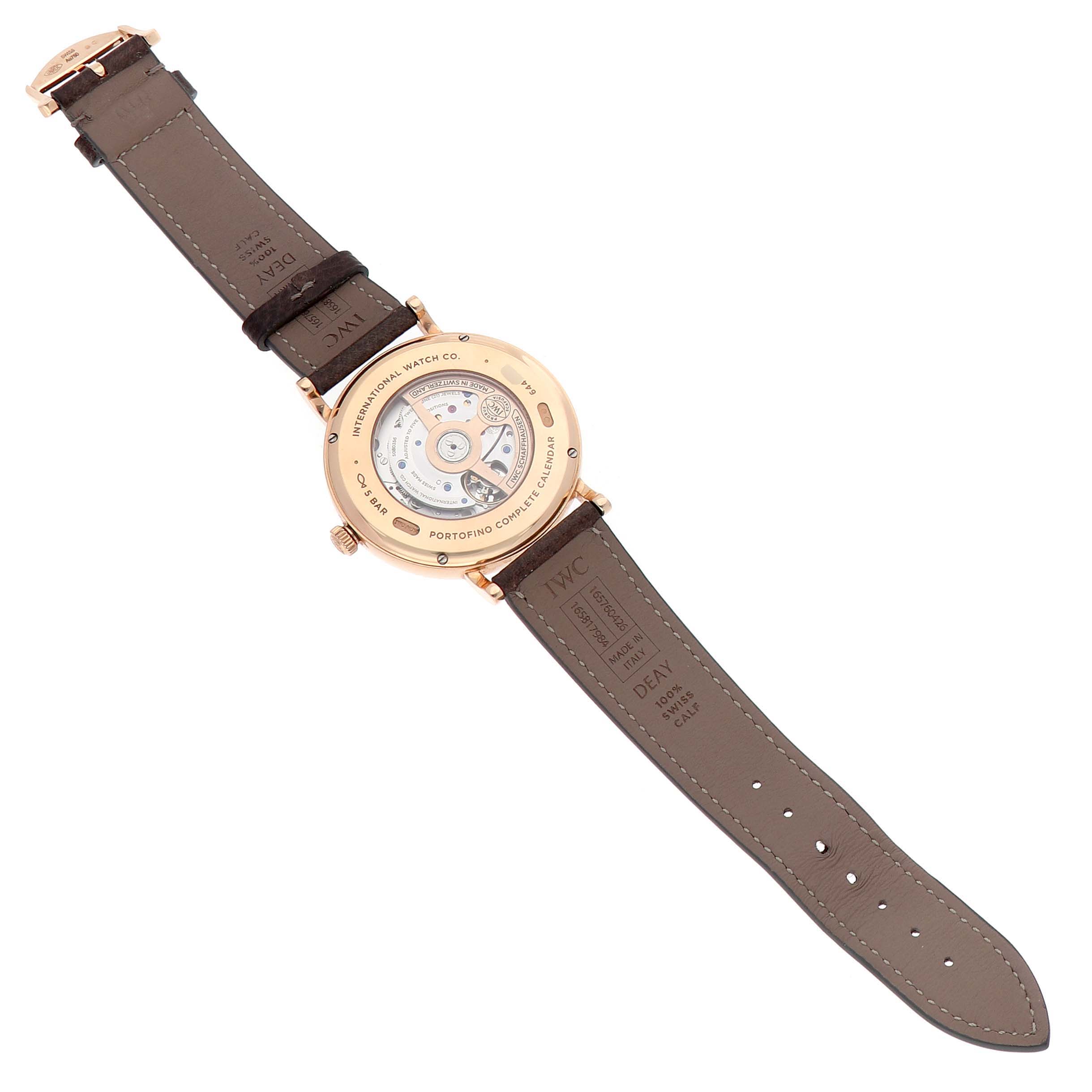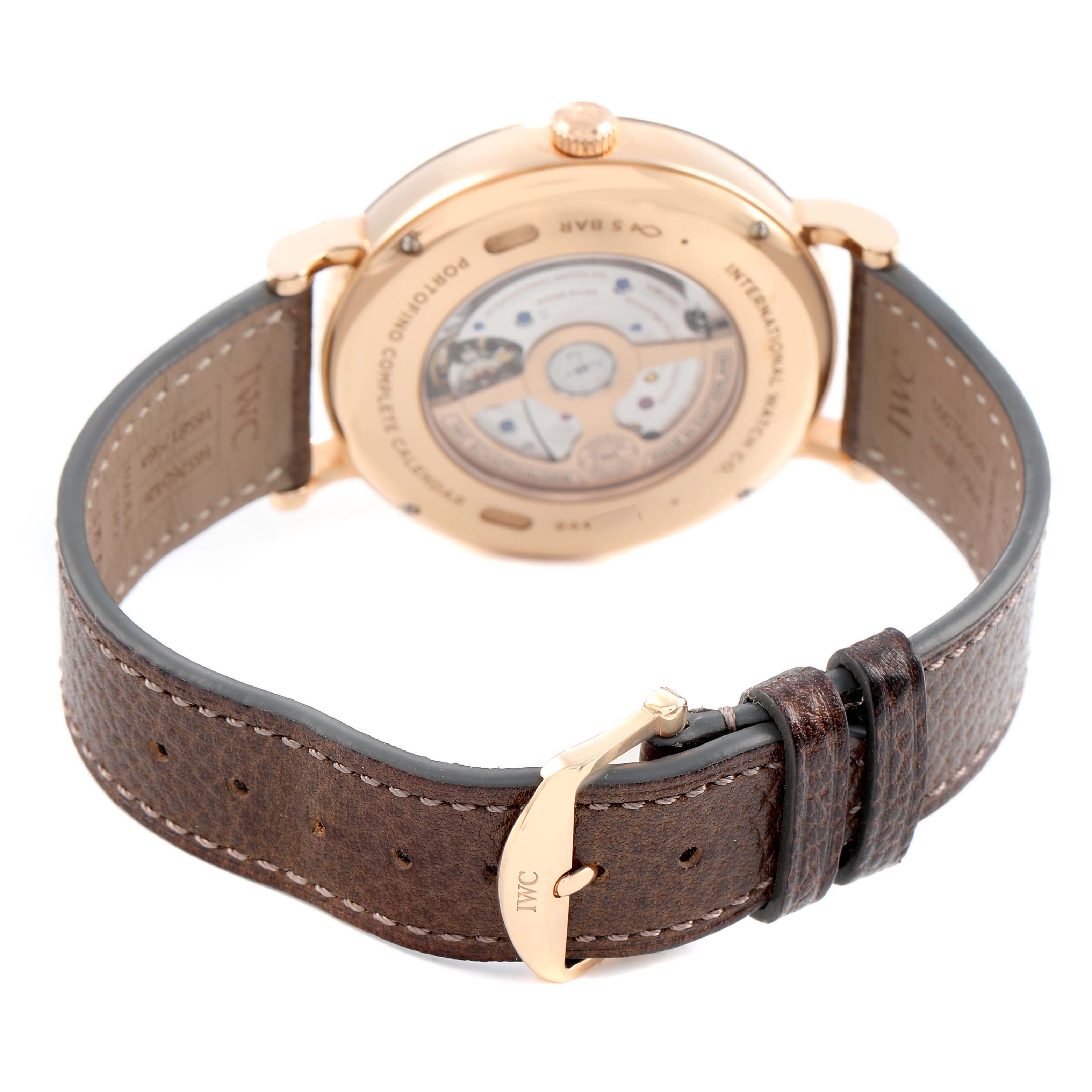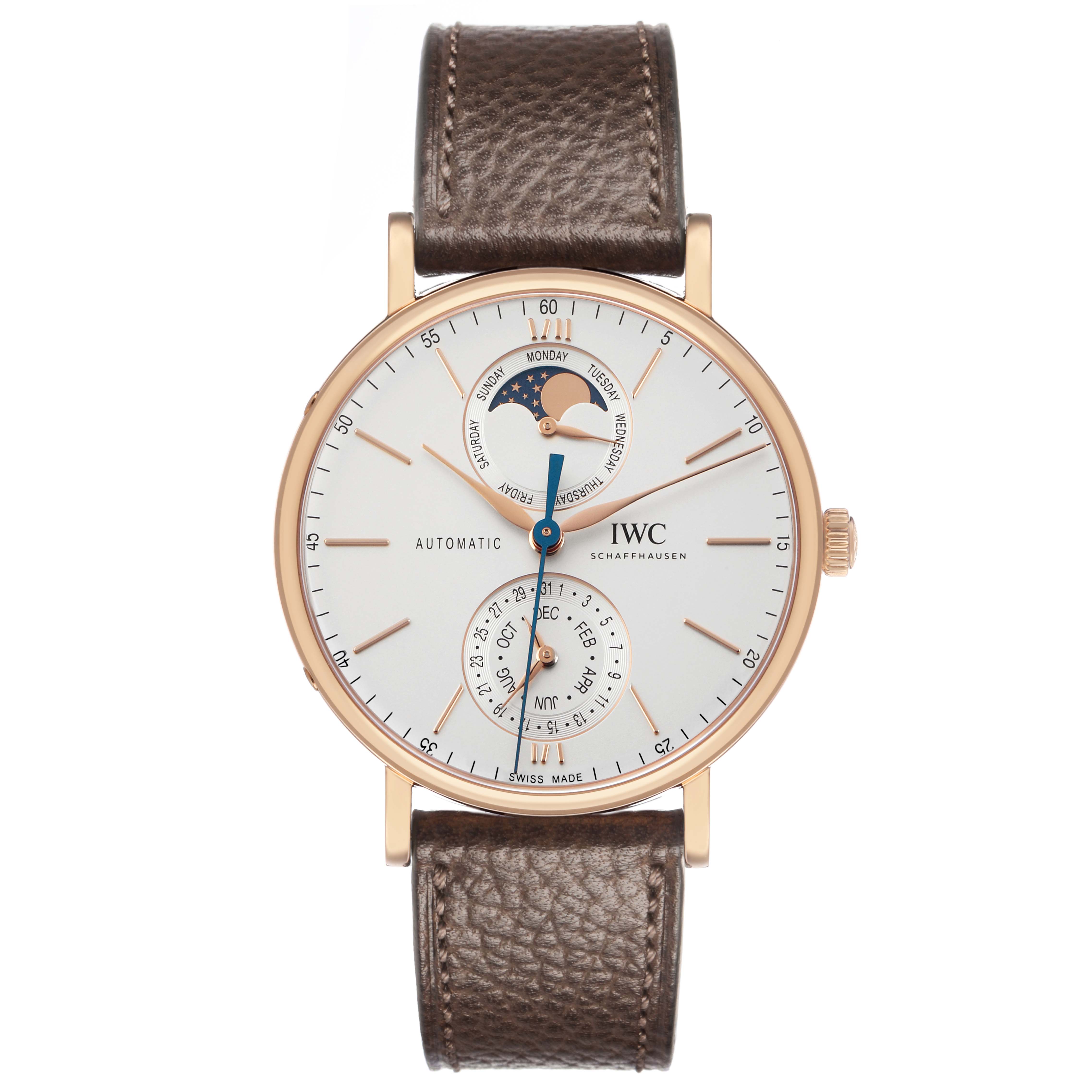 IWC Portofino Complete Calendar Rose Gold Silver Dial IW359002 Box Card. Automatic winding movement. 18k rose gold case 41 mm in diameter. Exhibition transparent sapphire crystal caseback. 18k rose gold smooth bezel. Sapphire glass, convex, antireflective coating on both sides. Silver dial with rose gold baton hour markers. Day of the week and moonphase display at 12. Date and month display at 6. Leaf shaped hands. Central running seconds hand. Minute markers around the outer rim. Dark brown leather strap with an 18k rose gold tang buckle.