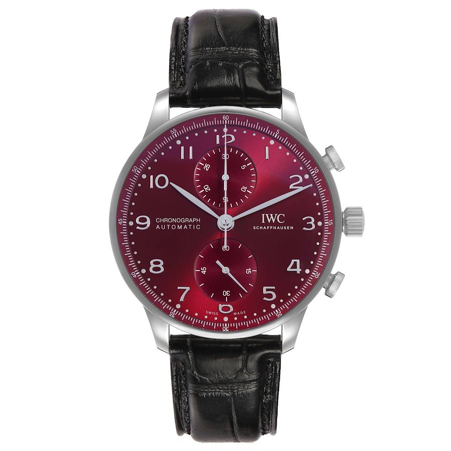 IWC Portugieser Chronograph Steel Red Dial Mens Watch IW371616 Box Card. Automatic self-winding movement. Stainless steel round case 41.0 mm in diameter. Transparent exhibition sapphire crystal case back. Two pushers operate the chronograph functions. IWC logo on the crown. Stainless steel smooth bezel. Scratch resistant sapphire crystal. Red dial with Arabic numeral hour markers. Small seconds subdial at 6 o'clock. 30-minute chronograph register at 12 o'clock. Minute and 1/4 second markers around the outer rim. Black leather strap with a stainless steel deployant clasp.
