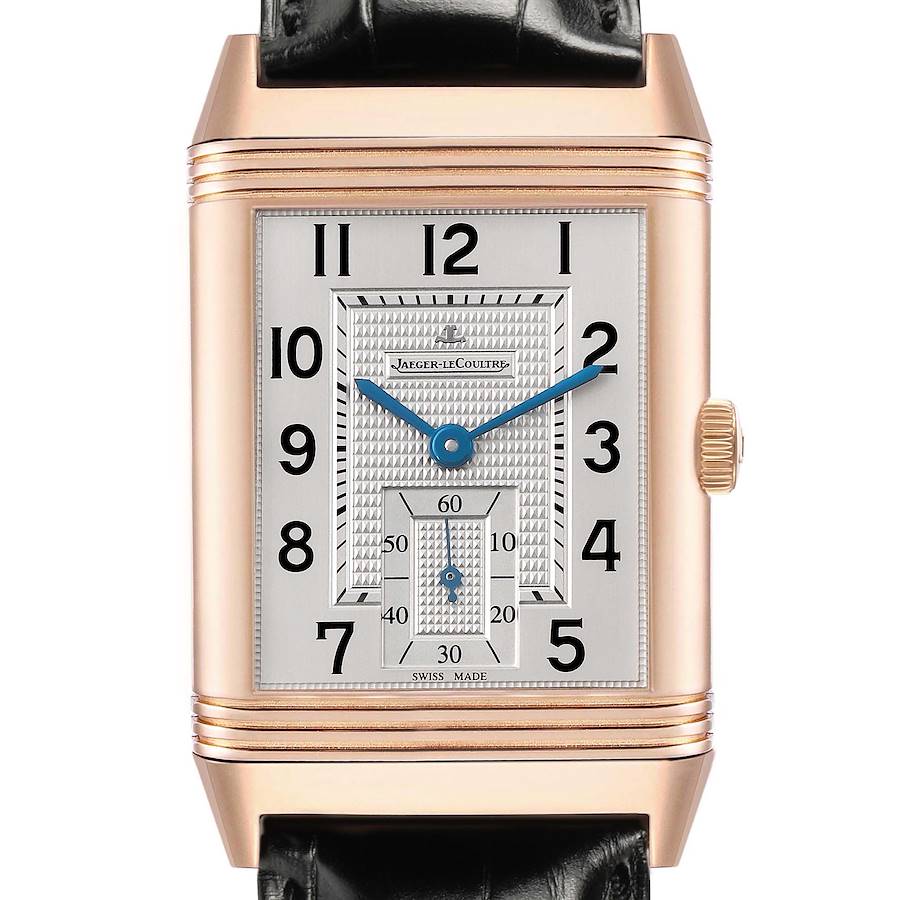 Jaeger LeCoultre Grande Reverso 976 Rose Gold Watch 273.2.04 Q3732520. Manual winding movement. 18K rose gold rectangular rotating case 48.5 x 30.0 mm. Case flips over to reveal a transparent exhibition sapphire crystal case back, displaying the movement with linear Coates de Geneva finish. 18K rose gold ribbed bezel. Scratch resistant sapphire crystal. Silver textured dial with black Arabic numeral hour markers and an inner minute track. Blued steel sword-shaped hands. Recessed small seconds subdial at 6 o'clock. Black leather strap with an 18K rose gold tang buckle.