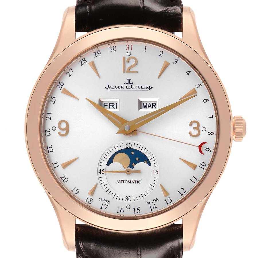 Jaeger LeCoultre Master Calendar Rose Gold Watch 176.2.12.S Q1552520. Self-winding automatic movement. 18k rose gold round case 39.0 mm in diameter. Concave lugs. Jaeger LeCoultre logo on the crown. 18k rose gold smooth bezel. Scratch resistant sapphire crystal. Silver dial with rose gold dauphine hands, dart hour markers, and Arabic numerals at 3, 9, and 12 o'clock. Outer date ring with central pointer date hand. Two windows for day and month at 12 o'clock. Moonphase and small seconds subdial at 6 o'clock. Brown leather strap with an 18k rose gold tang buckle.