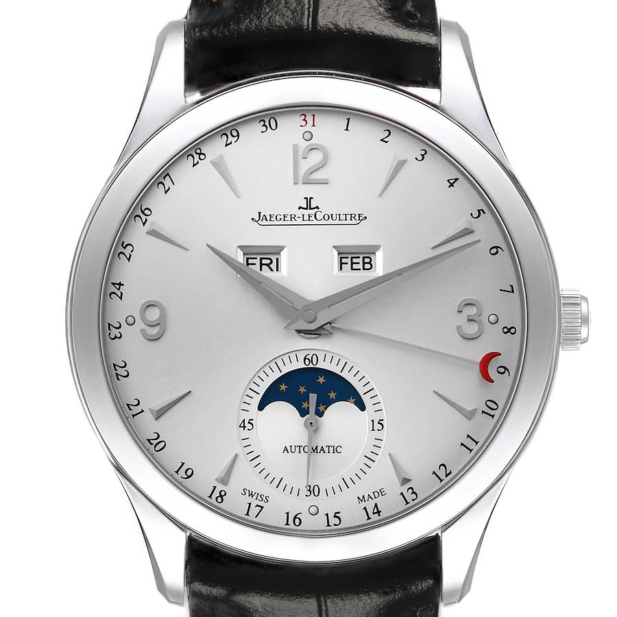 Jaeger LeCoultre Master Control Calendar Mens Watch 176.8.12.S Q1558420. Automatic self-winding movement. Stainless steel two-body case 39.0 mm in diameter. Concave and curved lugs. Exhibition caseback secured with 4 screws. Stainless steel smooth bezel. Scratch resistant sapphire crystal. Silver dial with dart hour markers and Arabic numerals at 3, 9, and 12 o'clock. Luminous steel dauphine hands, half-moon-shaped red pointer date function. Date scale around the outer rim. Day of the week and month display below the 12 o'clock. Small seconds and moonphase sub-dial at the 6 o'clock position. Custom black leather strap with JLC stainless steel double deployant buckle.