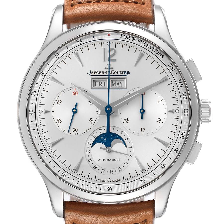 Jaeger LeCoultre Master Control Steel Mens Watch 830.8.C9.S Q4138420 Card. Self-winding automatic movement. Stainless steel case 40 mm in diameter. Exhibition transparent sapphire crystal caseback. Stainless steel smooth bezel. Scratch resistant sapphire crystal. Silvered dial with raised dart hour markers and Arabic numeral at 12 o'clock. Two chronograph subdials for 30 minutes and running seconds. Moonphase and date subdial at 6 o'clock. Day and month display at 12 o'clock. Brown leather strap and with stainless steel double deployant clasp.