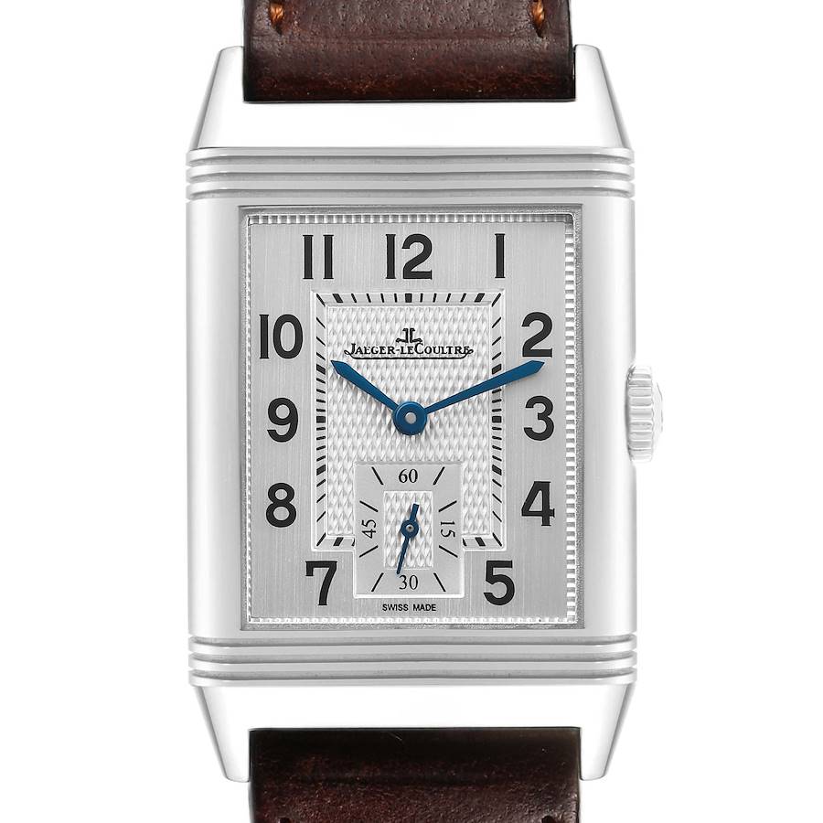 Jaeger LeCoultre Reverso Classic Steel Mens Watch 214.8.62 Q3858522 Card. Manual winding movement. Stainless steel five-body 45.6 mm x 27.4 mm rectangular rotating case. Case thickness: 8.5 mm. Solid caseback. Stainless steel reeded bezel. Scratch resistant sapphire crystal. Silver dial with Arabic numerals and blue sword shaped hands. Small seconds subdial at the 6 o'clock. Brown leather strap with stainless steel tang buckle.