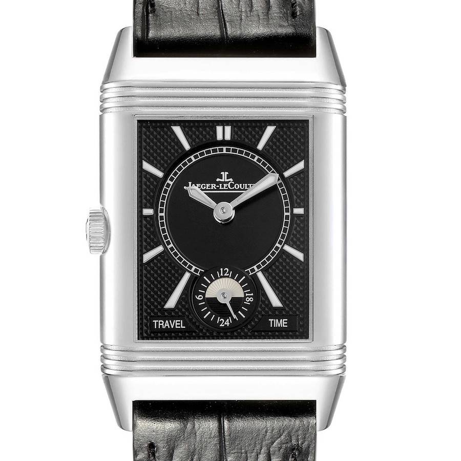Jaeger LeCoultre Reverso Duoface Day Night Midsize Watch 213.8.D4 Q2458420. Manual winding movement. Stainless steel 26.0 x 42.4 mm case rectangular case with reeded ends, rotating within its back plate. Stainless steel reeded bezel. Scratch resistant sapphire crystal. Two dials -- 1. Silver clous de paris guilloche dial with black Arabic numerals and blued steel sword hands. Small seconds sub-dial at the 6 o'clock. 2. Charcoal second time zone dial. 'Clous de Paris' guilloche textured outer perimeter with flat black sub-dials. The upper sub-dial for the additional time-zone. A synchronoized 24 hour sub-dial at the 6 o'clock hour position. White gold luminous fill hands. Black leather starp with stainless steel deployant clasp.