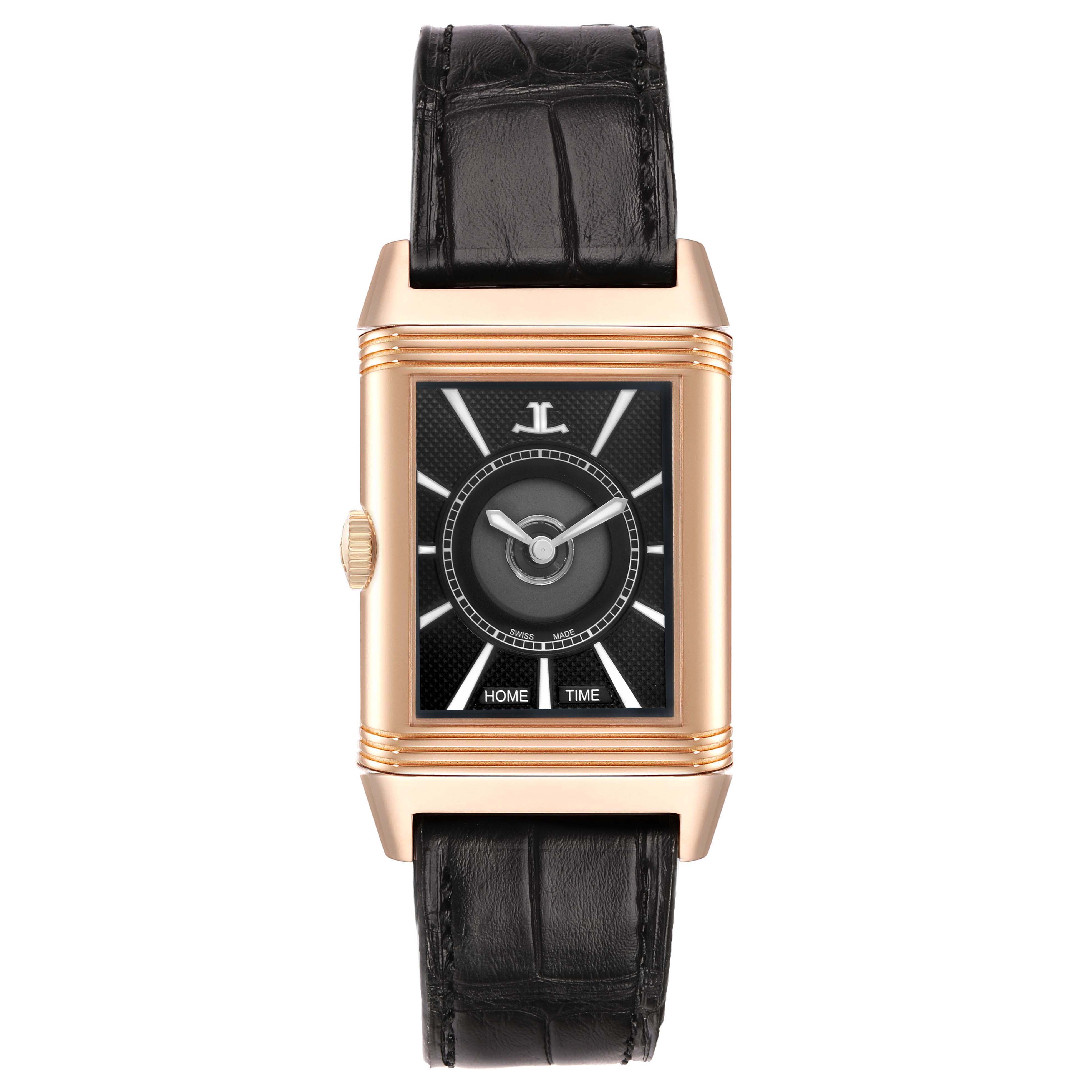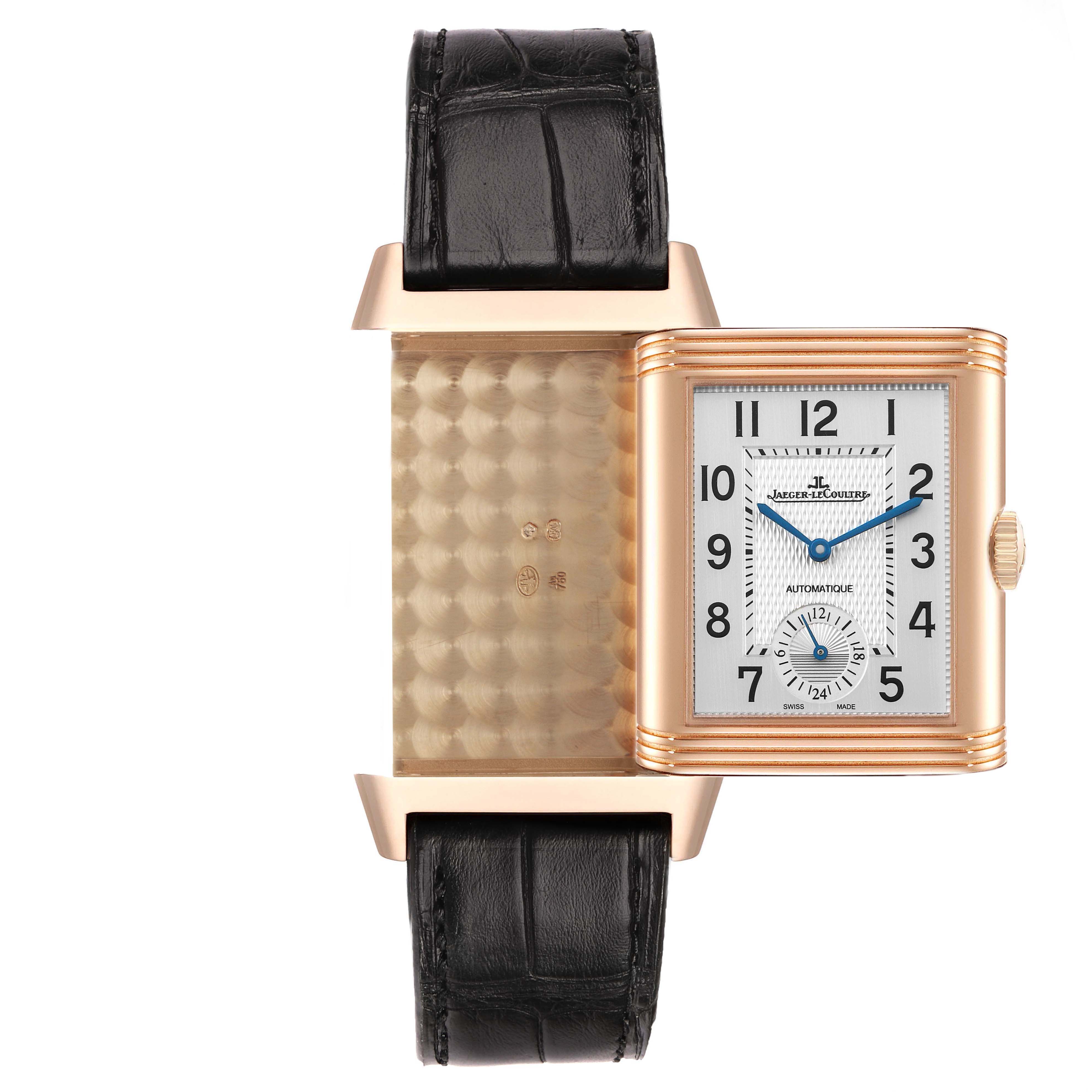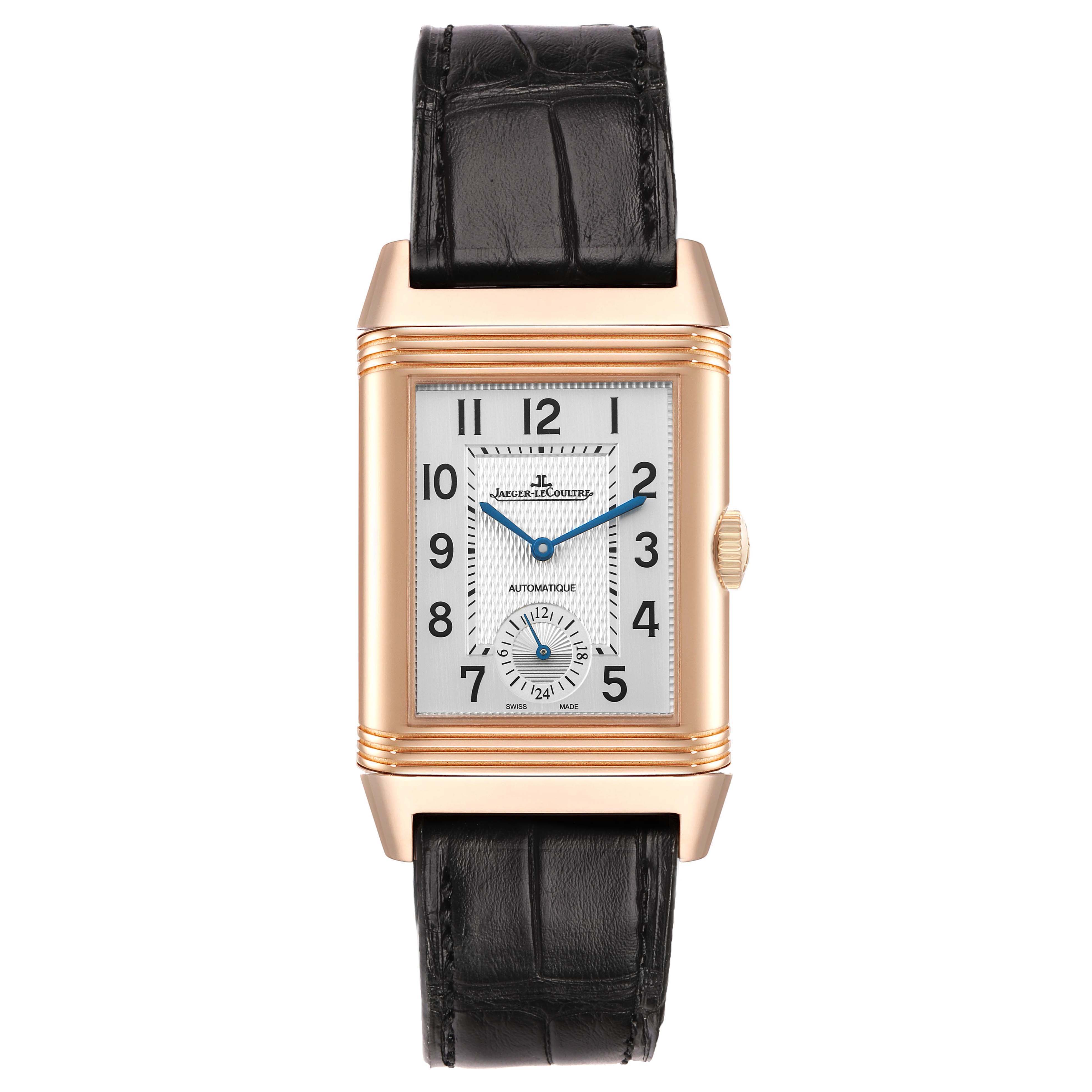 Jaeger LeCoultre Reverso Duoface Rose Gold Mens Watch 215.2.S9 Q3832420 Papers. Automatic self-winding movement with dual time function. 18k rose gold rectangular rotating, five-body case 47.0 mm x 28.5 mm. Jaeger LeCoultre logo on the rose gold crown. 18k rose gold reeded bezel. Scratch resistant sapphire crystal. (1). Silver guilloche dial with raised black Arabic numeral hour markers. Blued steel sword-shaped hands. 24-hour subdial at 6 o'clock. Inner minute track. (2). Black guilloche "Clous de Paris" pattern dial with luminescent index hour markers and steel sword-shaped hands on a plain reserve. Inner minute track. This recessed dial displays home time. Black leather strap with a Jaeger LeCoultre 18k rose gold double deployant buckle.
