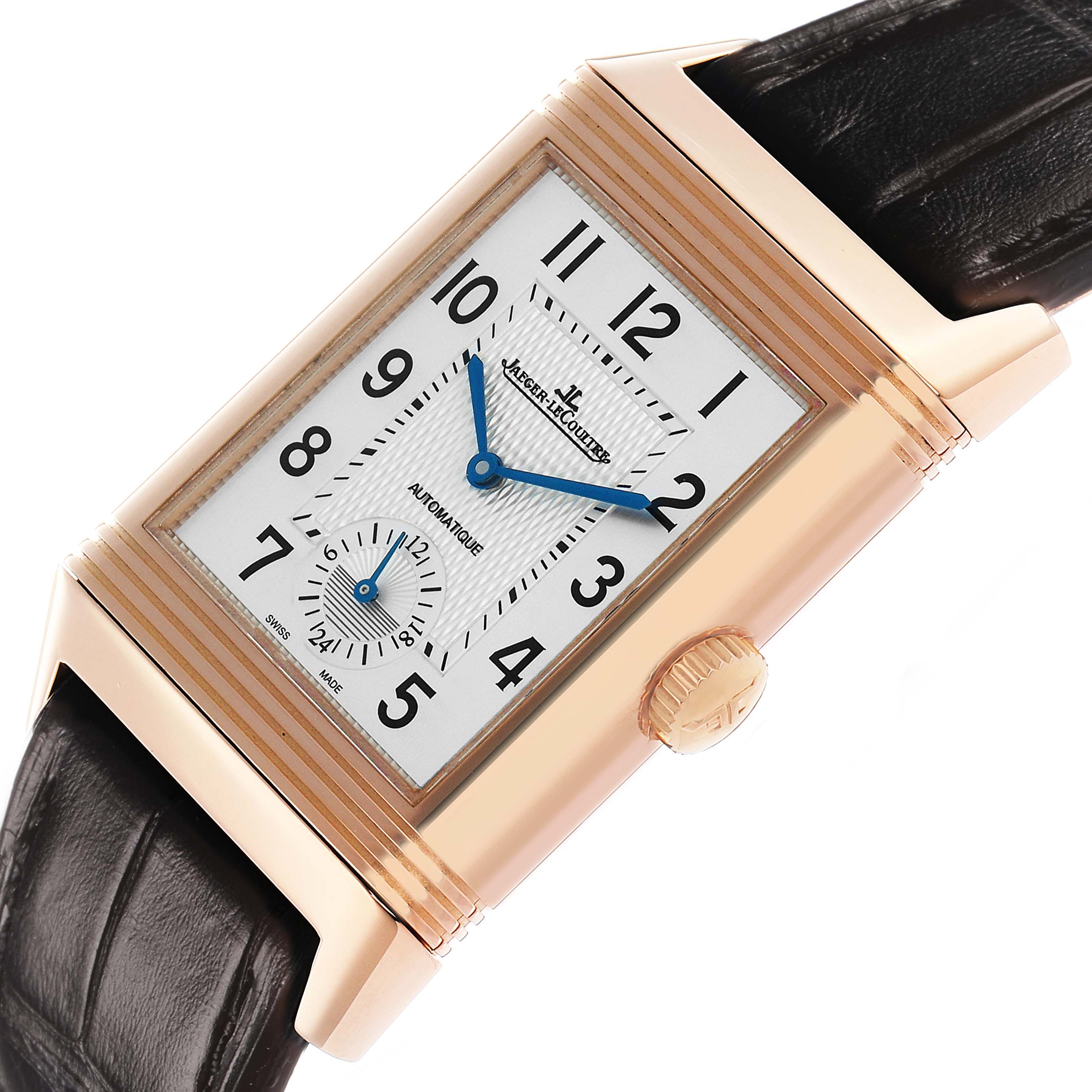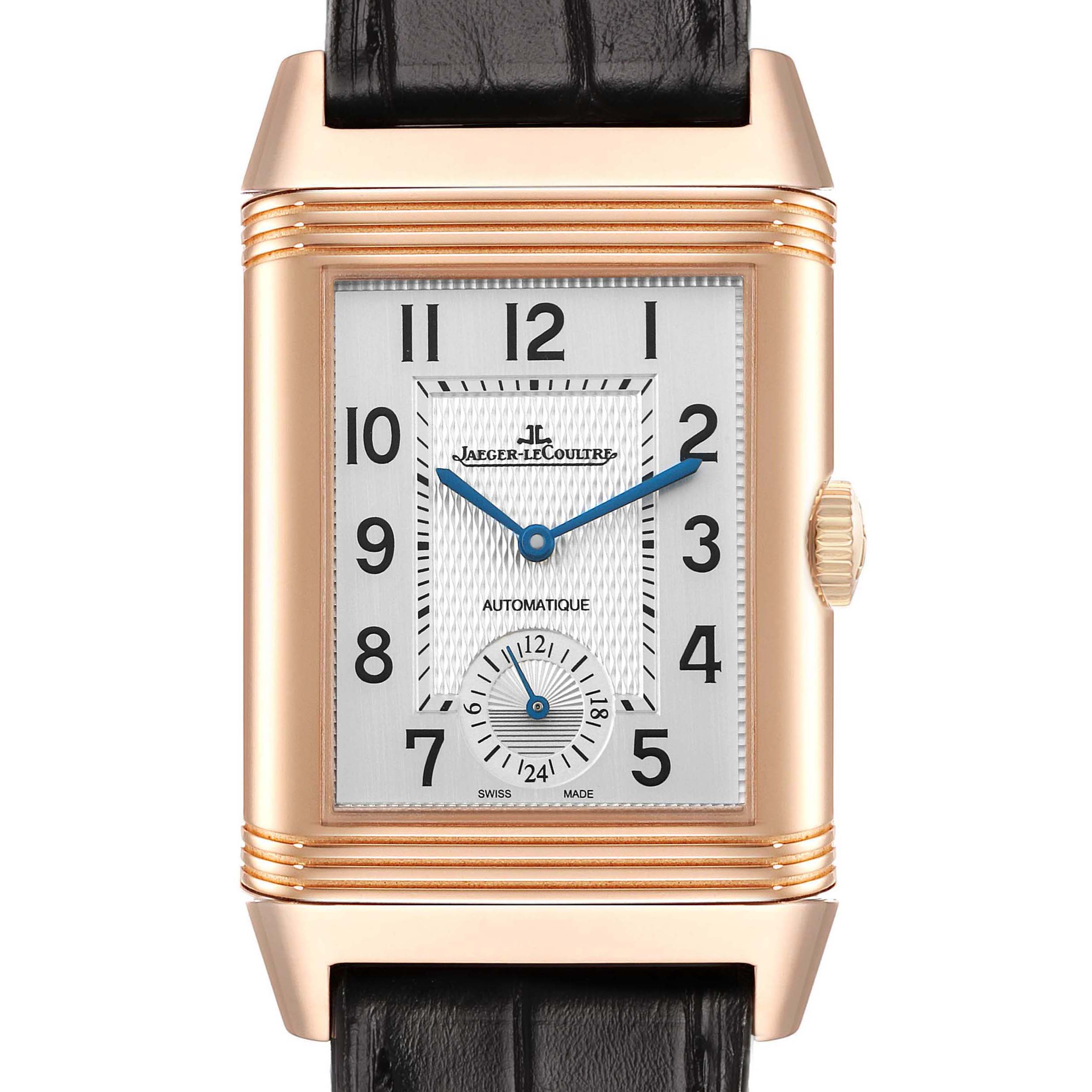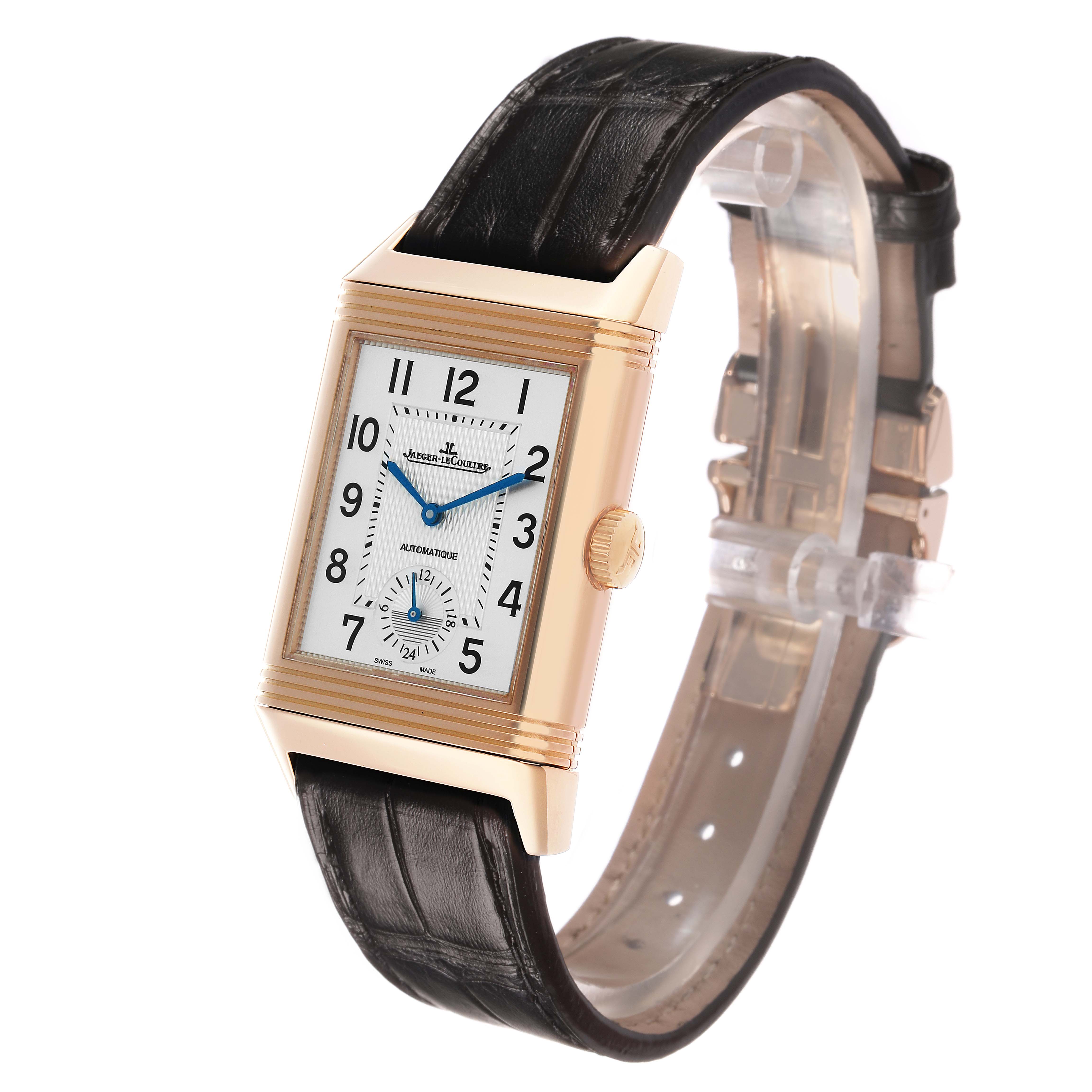 Jaeger LeCoultre Reverso Duoface Rose Gold Mens Watch 215.2.S9 Q3832420 Papers. Automatic self-winding movement with dual time function. 18k rose gold rectangular rotating, five-body case 47.0 mm x 28.5 mm. Jaeger LeCoultre logo on the rose gold crown. 18k rose gold reeded bezel. Scratch resistant sapphire crystal. (1). Silver guilloche dial with raised black Arabic numeral hour markers. Blued steel sword-shaped hands. 24-hour subdial at 6 o'clock. Inner minute track. (2). Black guilloche "Clous de Paris" pattern dial with luminescent index hour markers and steel sword-shaped hands on a plain reserve. Inner minute track. This recessed dial displays home time. Black leather strap with a Jaeger LeCoultre 18k rose gold double deployant buckle.