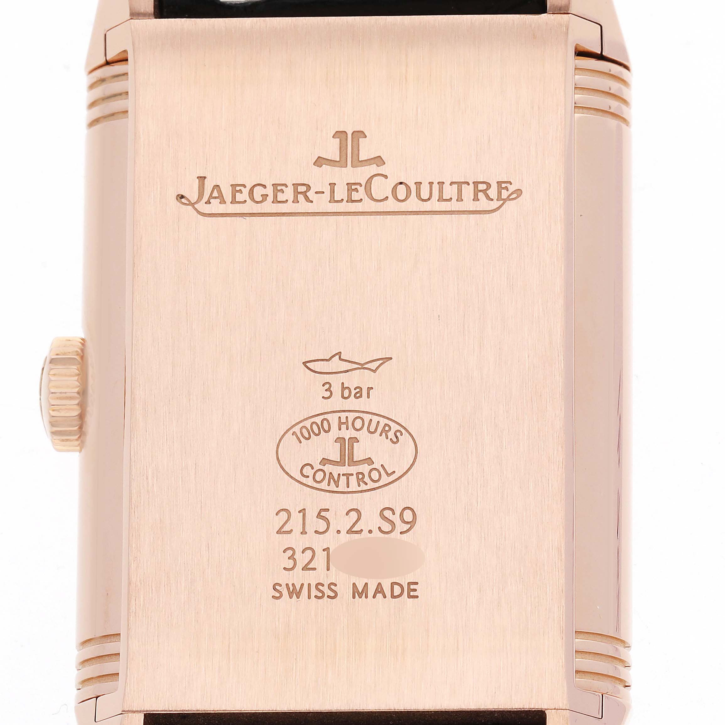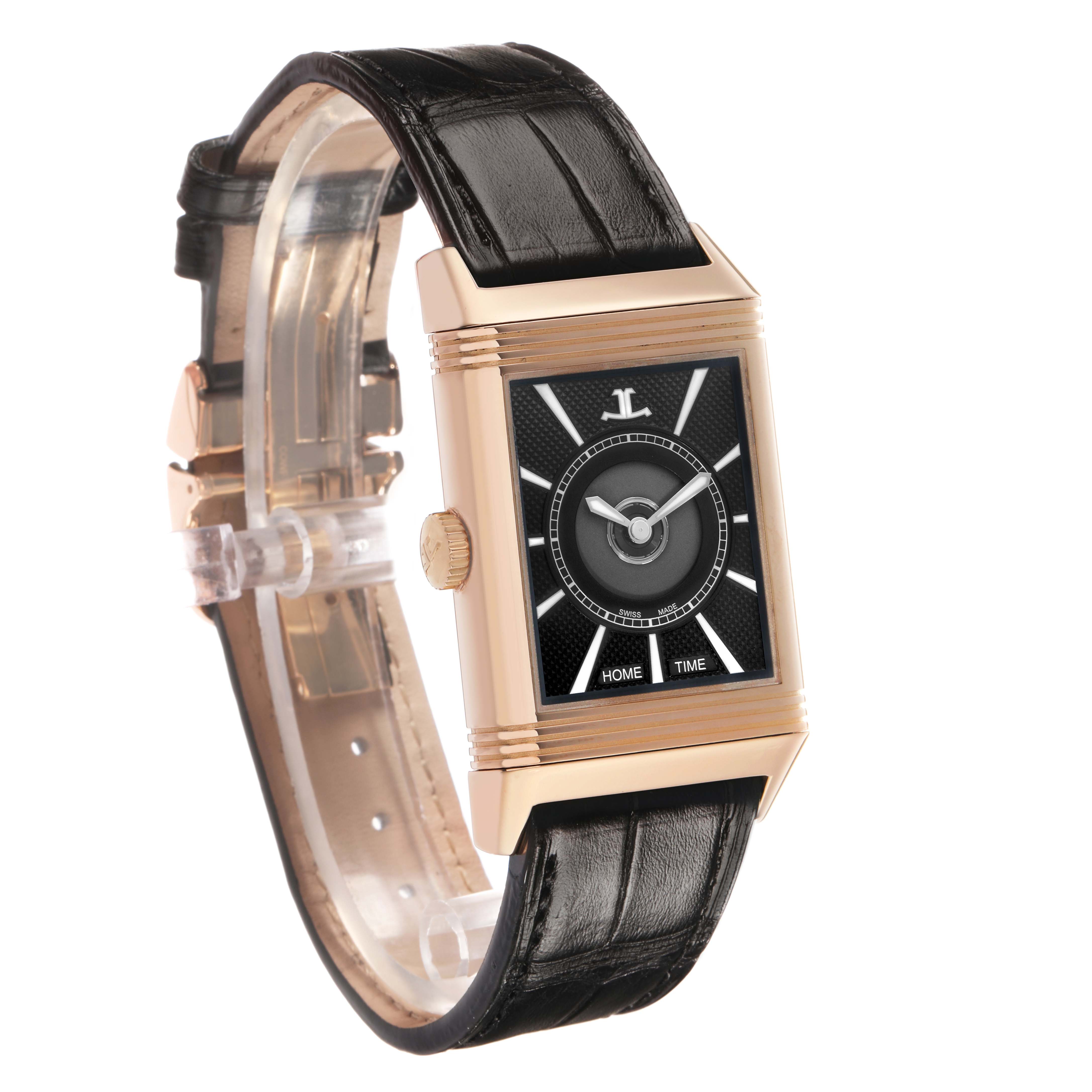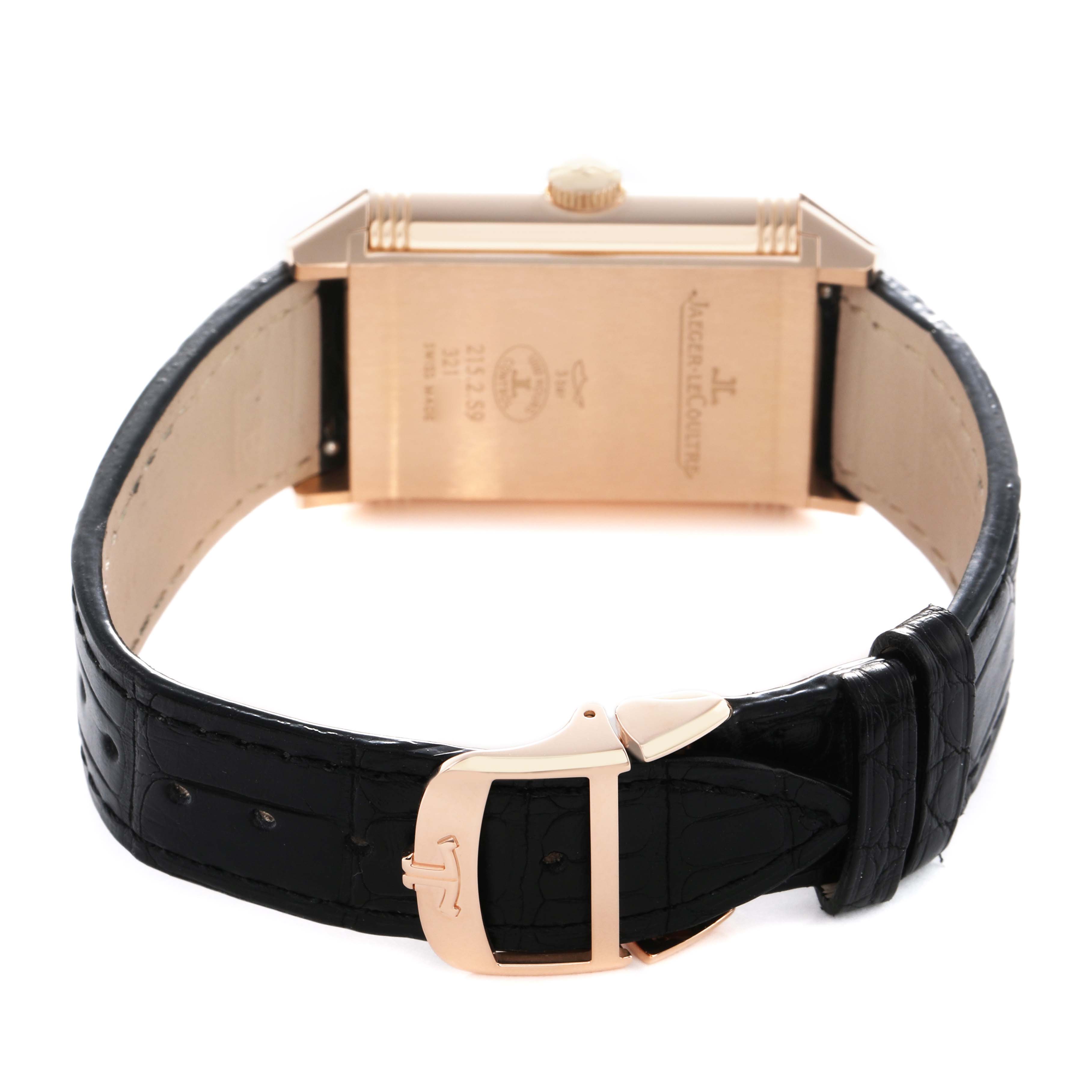 | Bracelet: | Black leather strap with a Jaeger LeCoultre 18k rose gold double deployant buckle. |